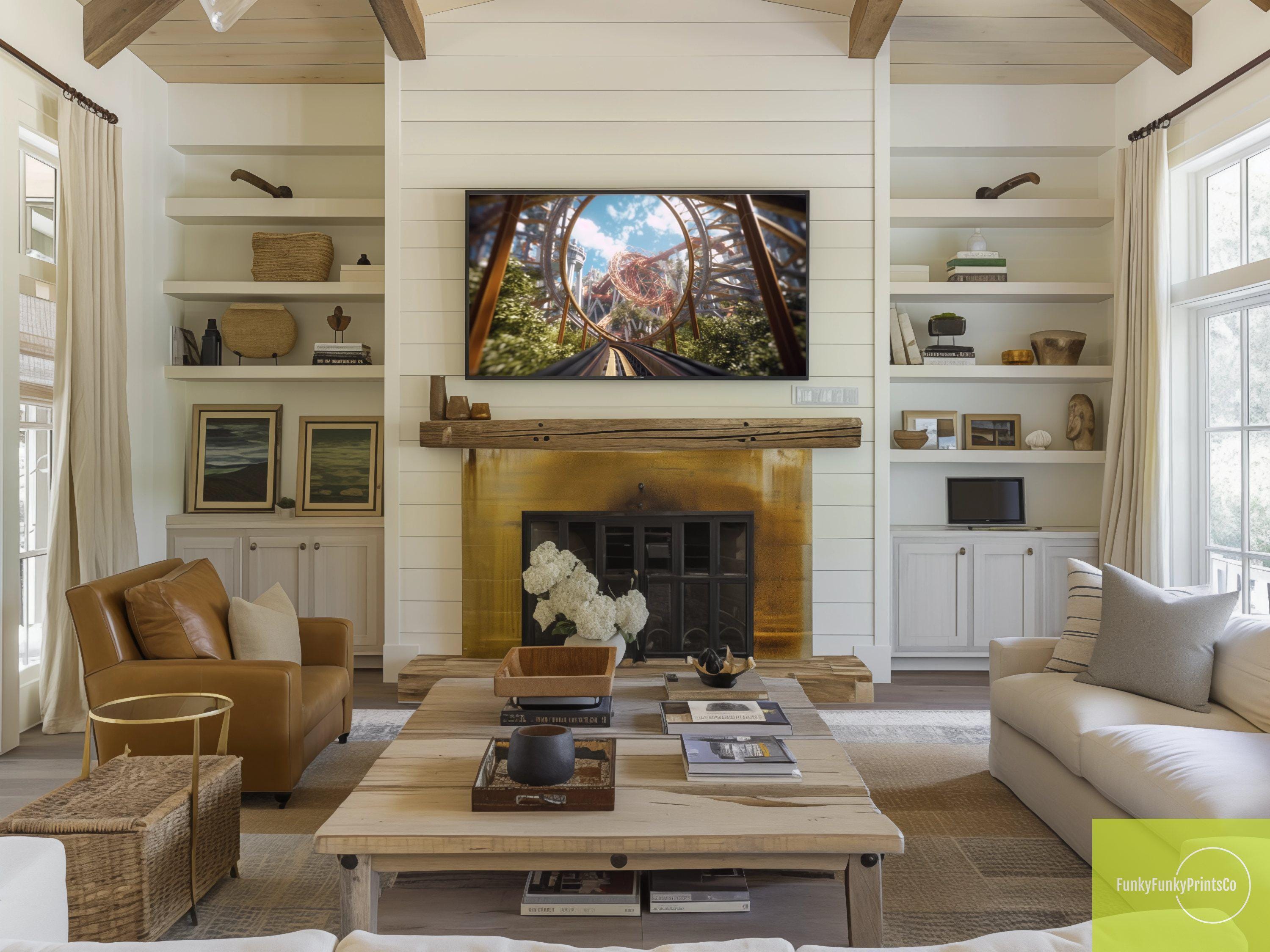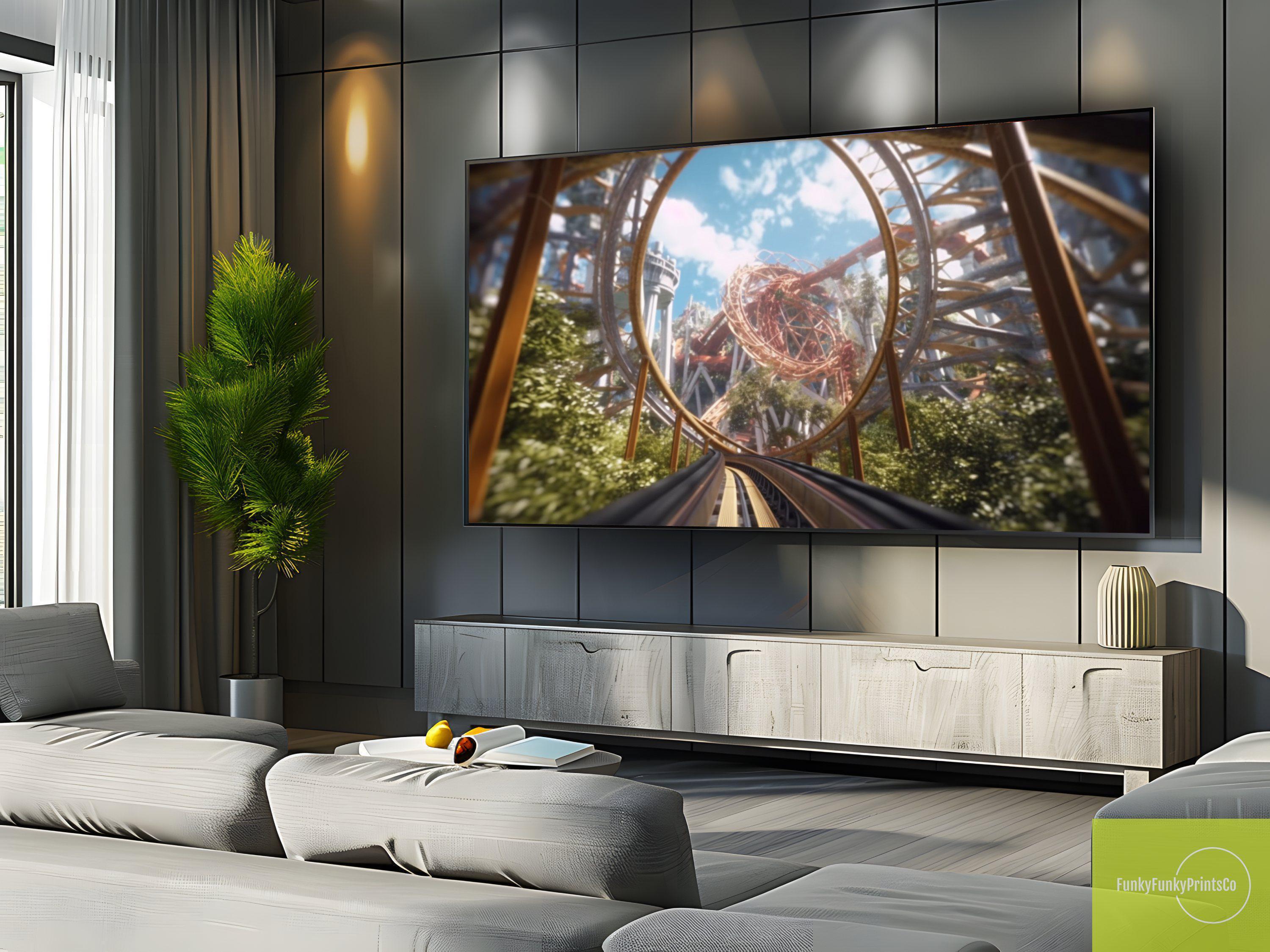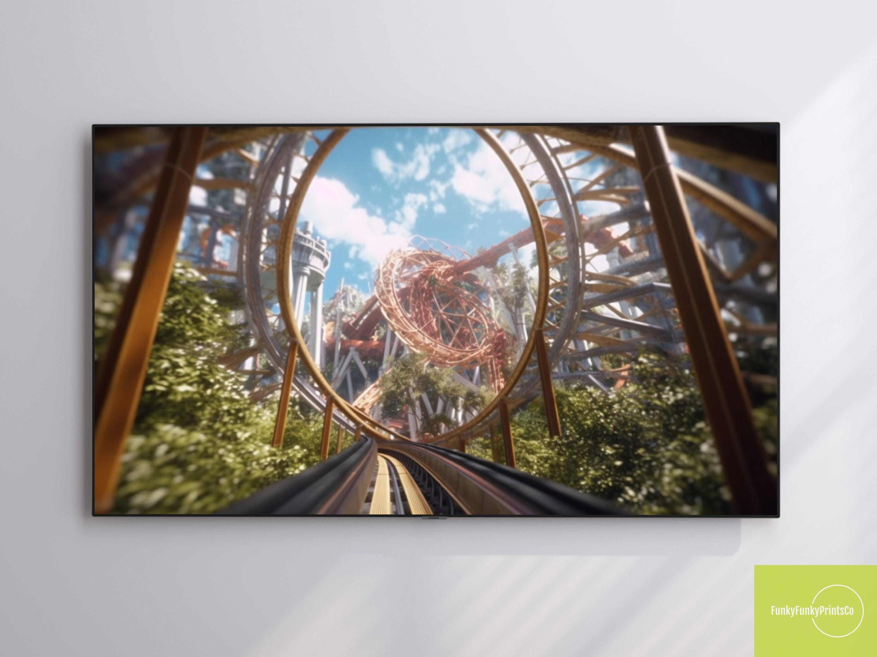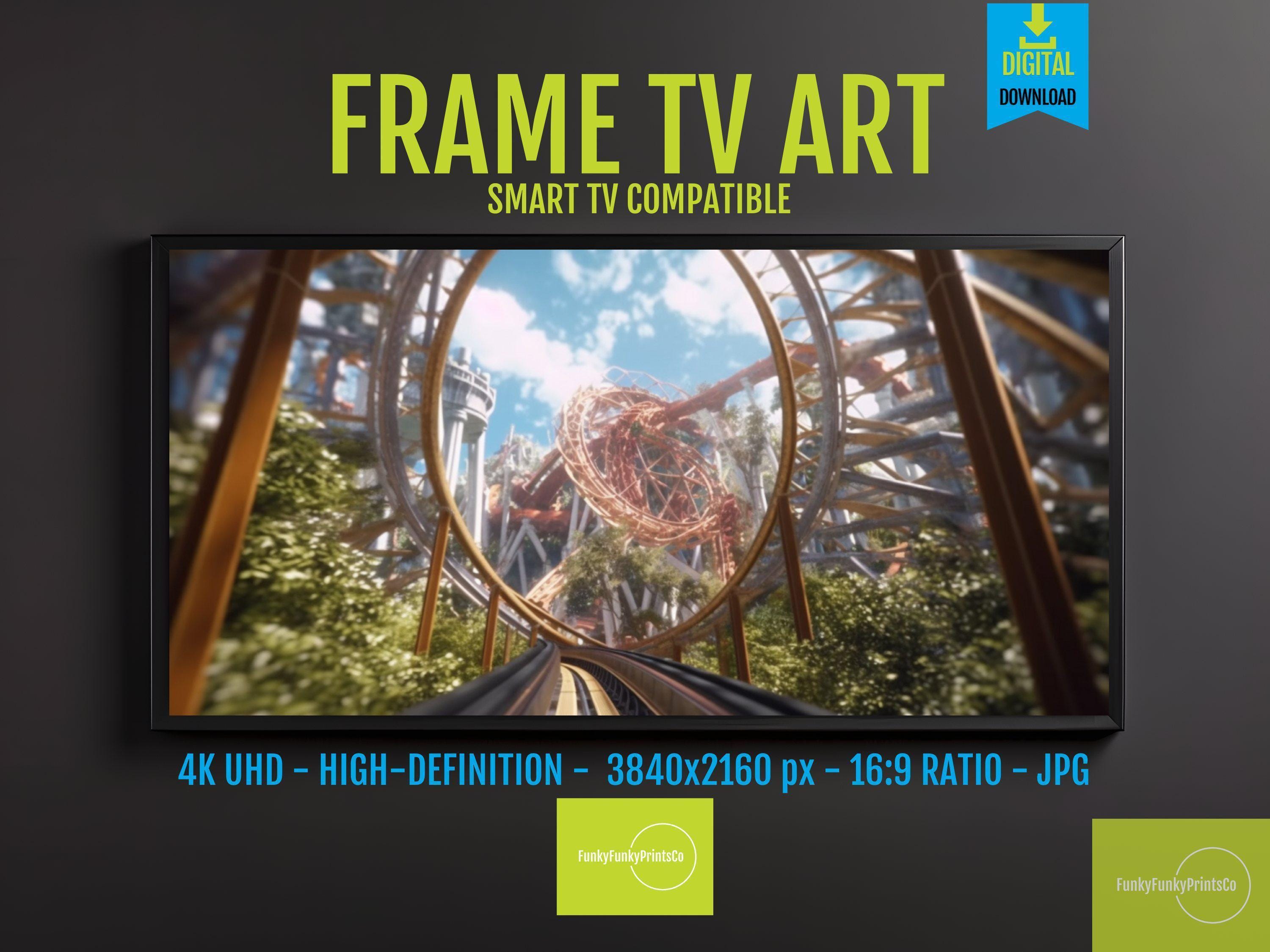 Experience the thrill of your favorite amusement park from the comfort of your home with this stunning 4K HD digital art designed specifically for Samsung Frame TV. Capturing the exhilarating roller coaster POV, this theme park art brings vintage charm and dynamic energy to any room. Perfect for amusement park fans seeking a unique and immersive Samsung TV download that transforms your space into a nostalgic thrill ride.