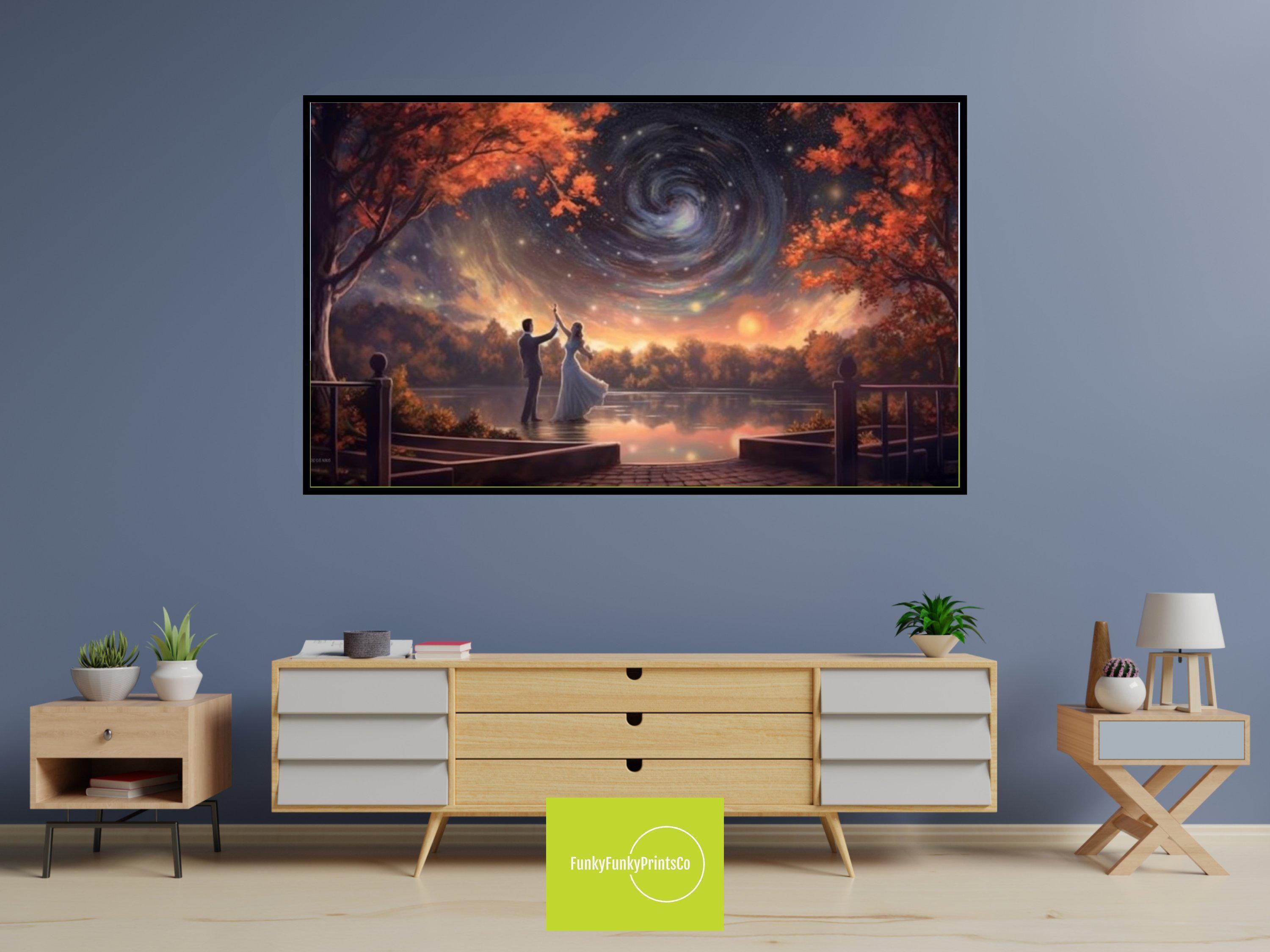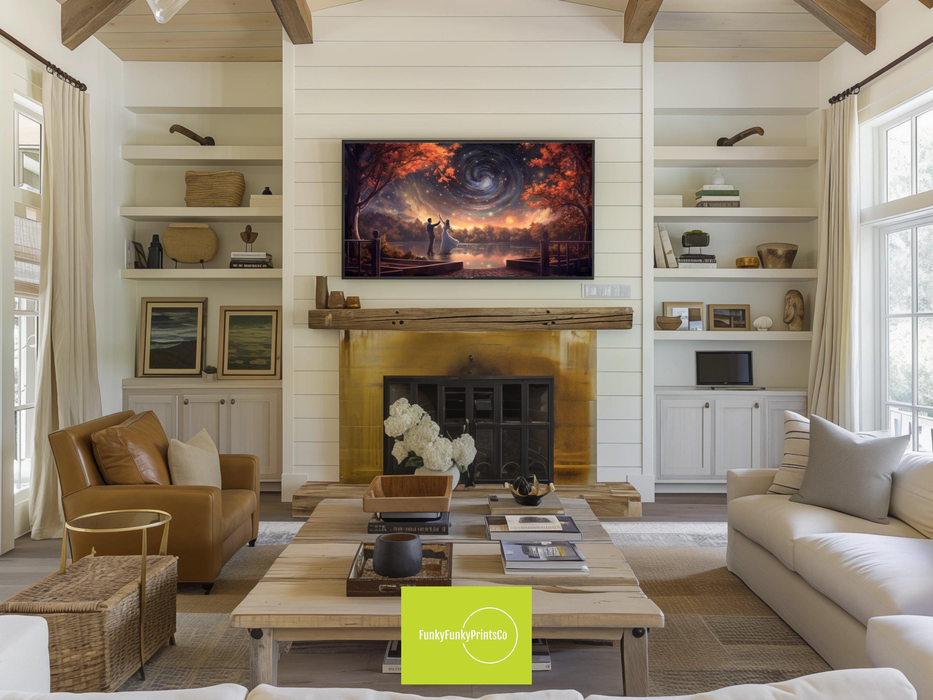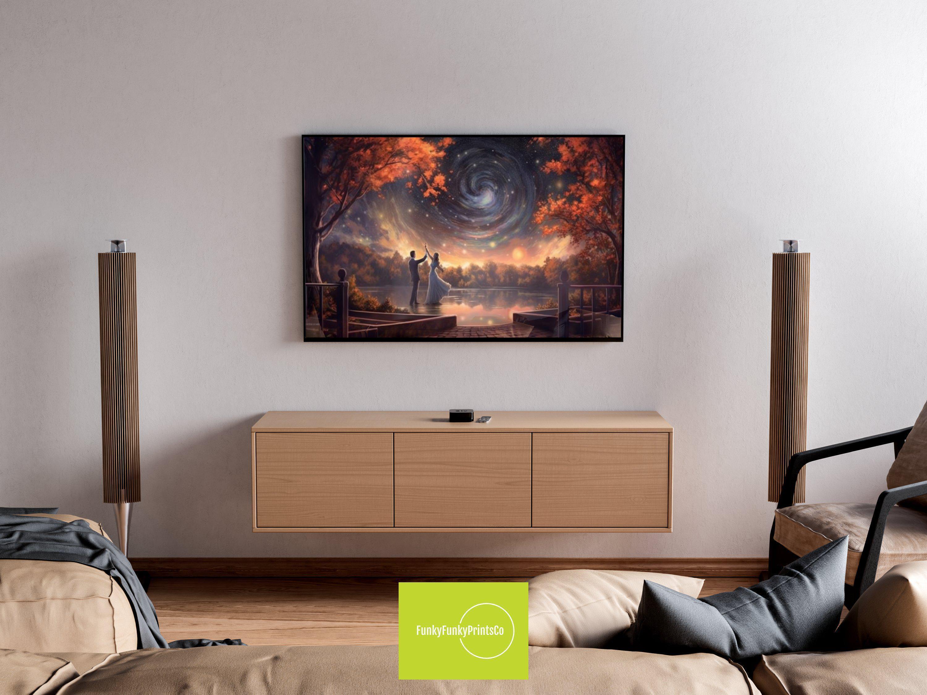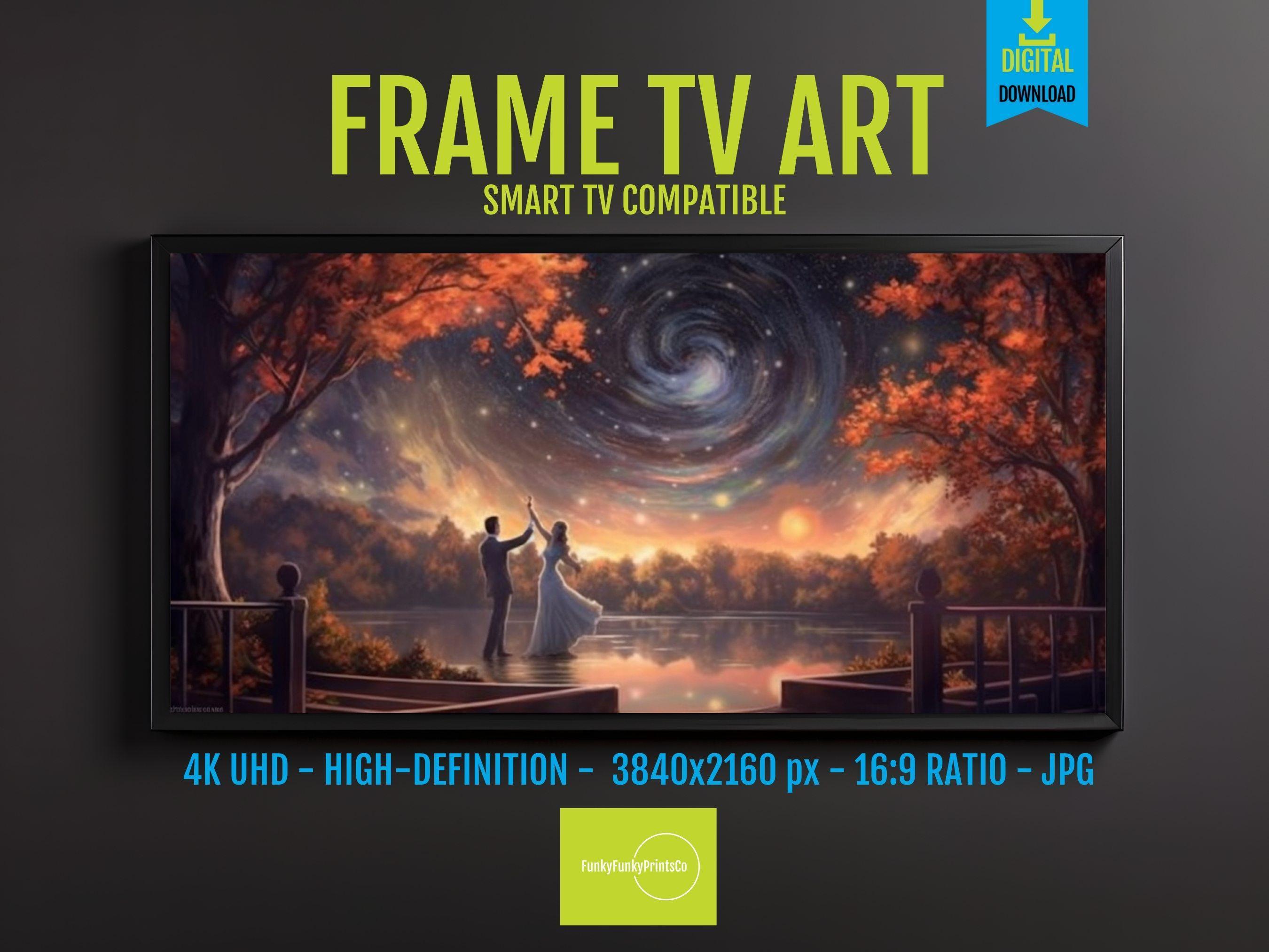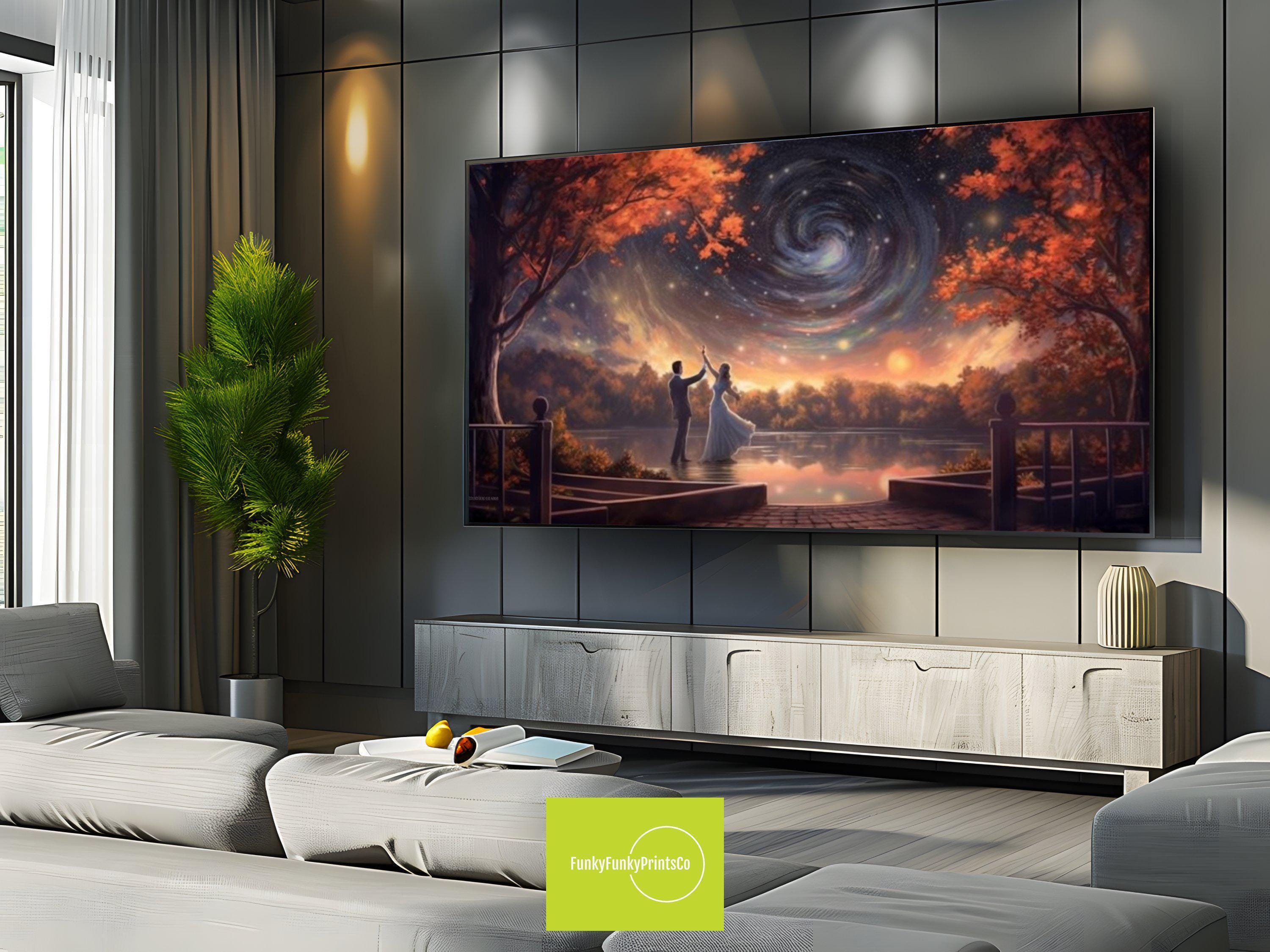 Experience the enchanting beauty of autumn with this cozy fall landscape, perfectly captured in a romantic tv artwork that brings warmth to your living space. Imagine a dancing couple beneath a starry night frame, creating a serene and inviting atmosphere for any evening. This smart tv download offers a seamless way to transform your screen with 4k UHD digital art that celebrates the magic of the season.