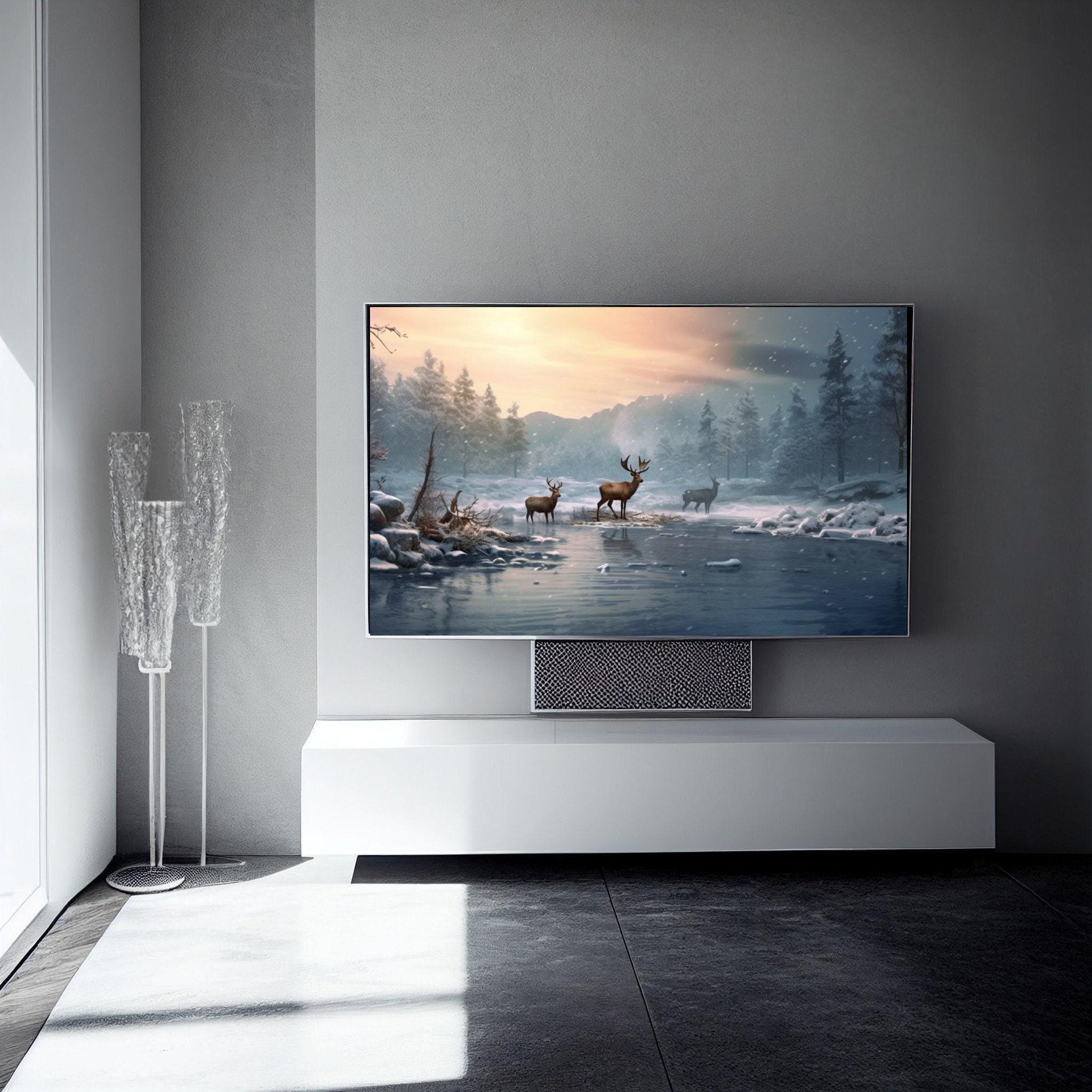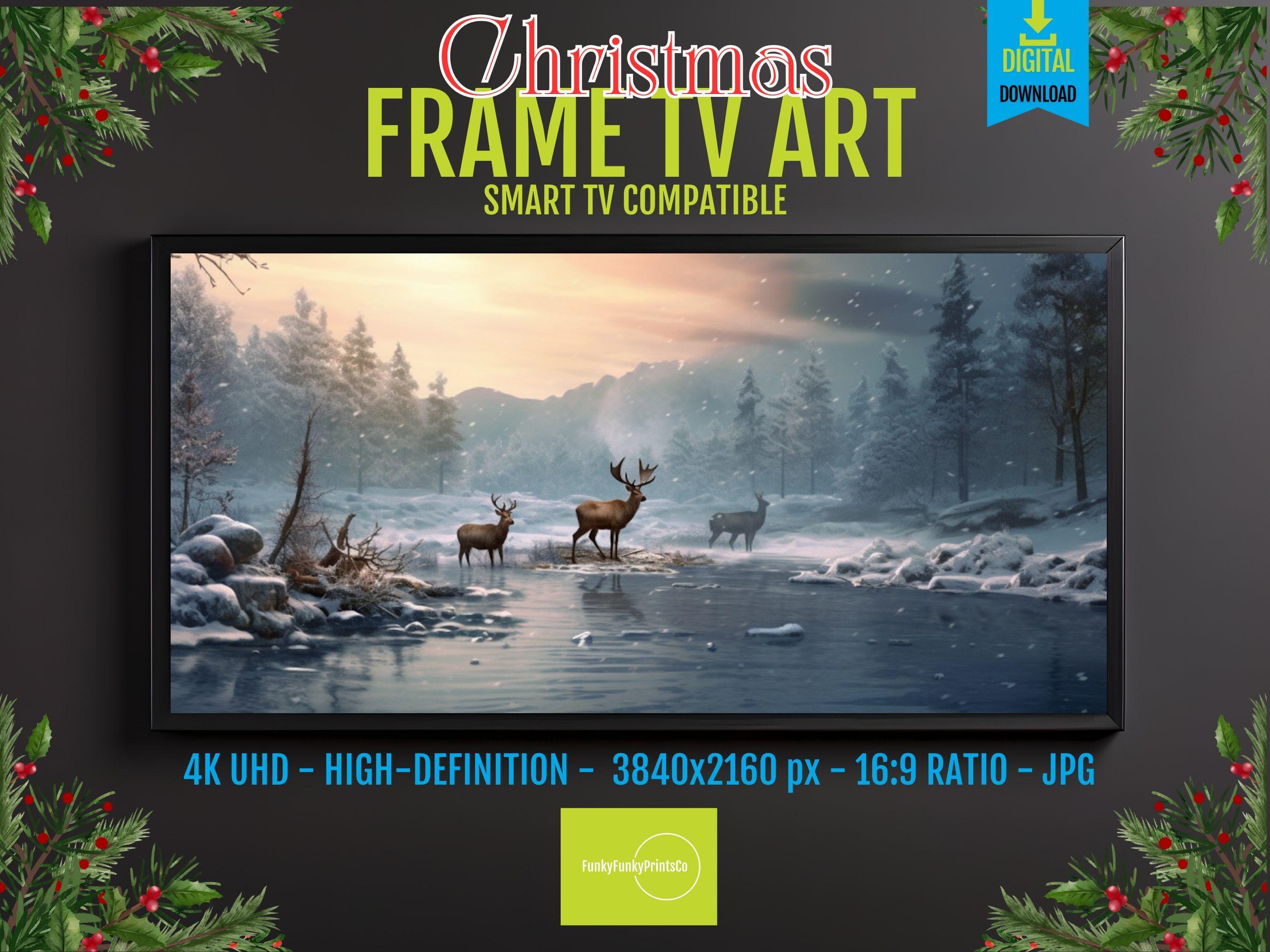 Step into a serene winter forest with this captivating digital artwork featuring a majestic deer in snowy surroundings. Perfect for enhancing your festive decor, this piece blends the charm of Christmas home decor with the crisp clarity of 4k HD digital art. Designed specifically for winter Samsung Frame TVs, it brings seasonal holiday art to life, transforming your space into a cozy winter wonderland.