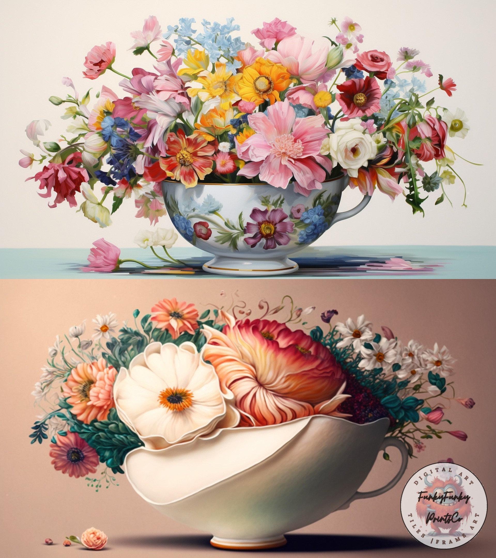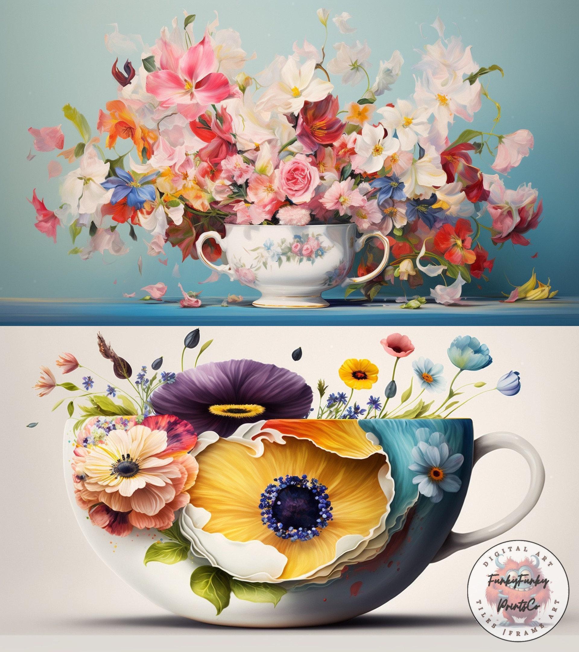 ➤ Bright, colorful digital art featuring floral tea cups that add a lively, modern wall decor element.