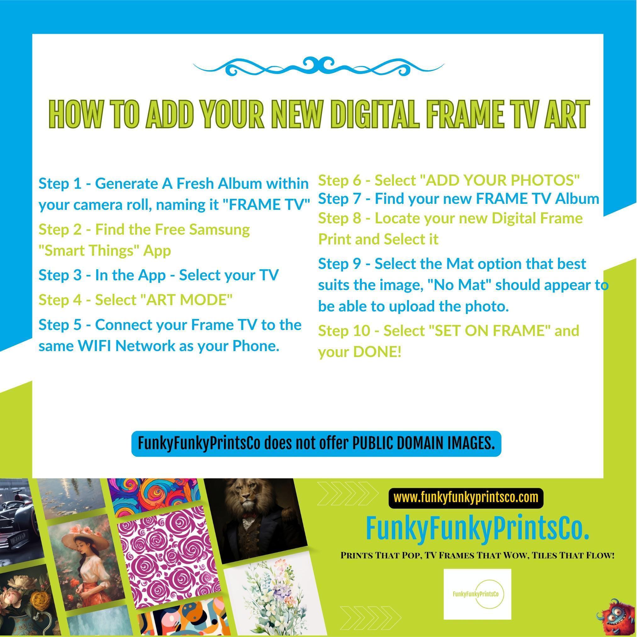 We provide a range of sizes for our digital products. For Digital Art Prints, the available sizes include 5"x7", 8"x10", 11"x14", 11"x17", 16"x20", 18"x24", 20"x30", 24"x36", and A2 (23.4"x16.5"). Our Seamless tile prints have a resolution of 300dpi and dimensions of 3600px x 3600px, equivalent to 12"x12". The Frame TV Art is in Ultra High Definition (UHD) with a resolution of 3840:2160, suitable for 16:9 ratio TVs. All our products are digital downloads and can be instantly accessed after purchase.