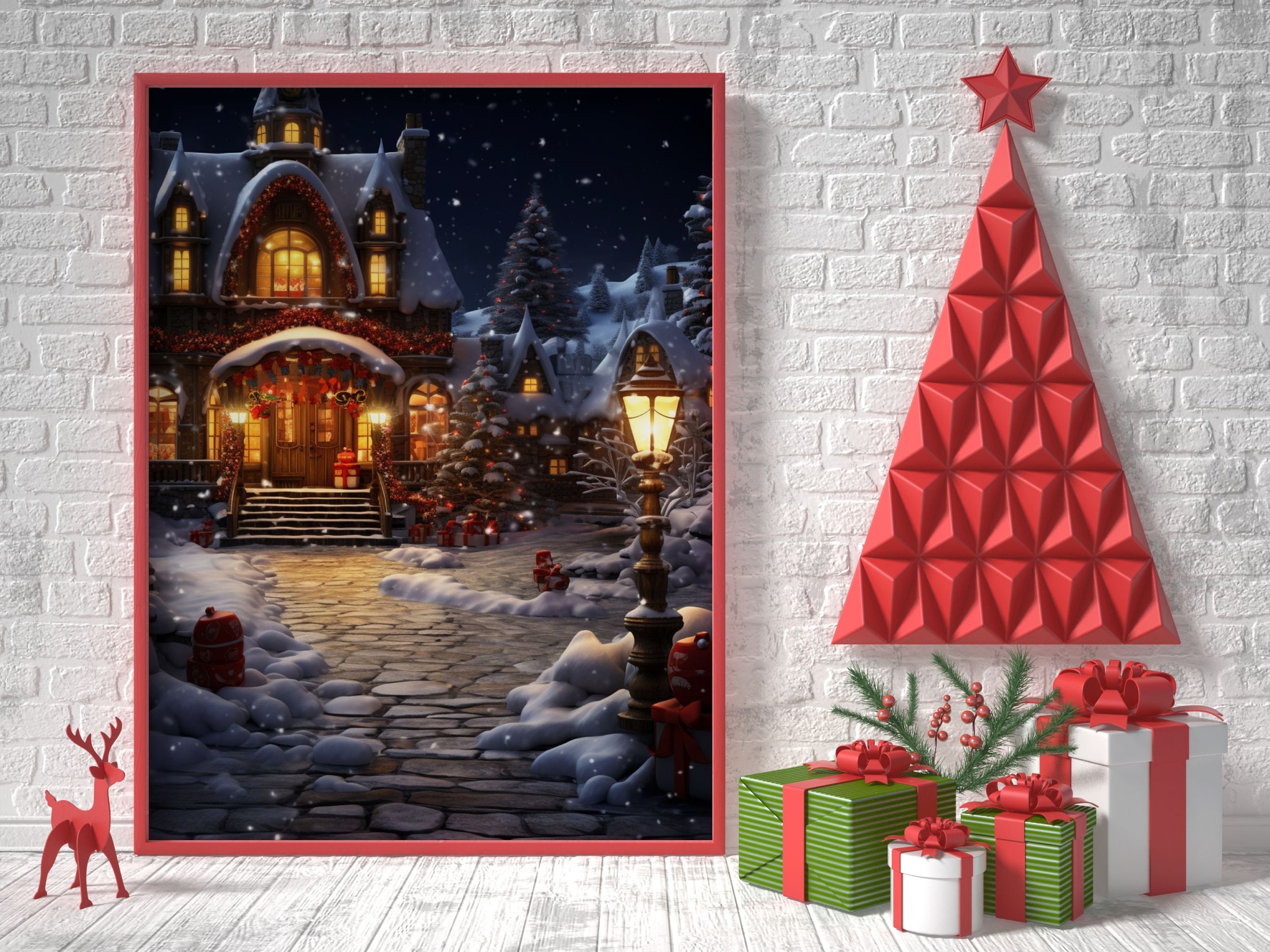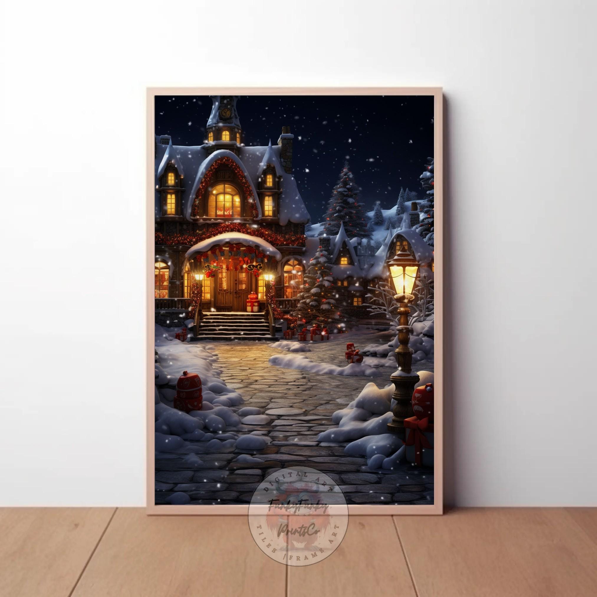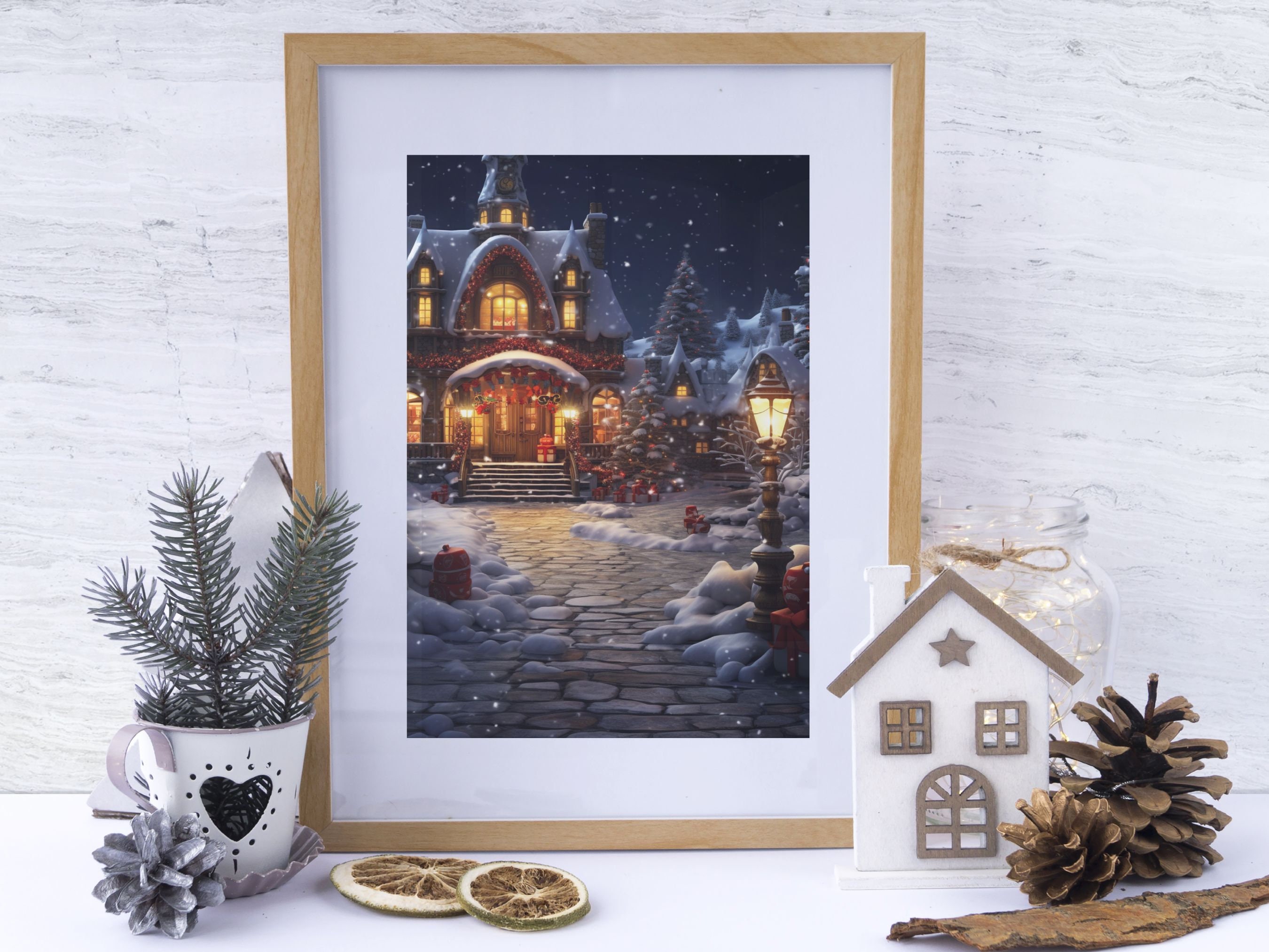 Perfect for holiday home decor, this artwork brings the cozy charm of a Christmas cottage into any room. Instantly downloadable, it's easy to print and display, making it a convenient and stylish addition to your holiday decorations. Celebrate the winter wonderland season with this stunning piece of art. Download now and enjoy the festive spirit with this delightful Christmas decor!