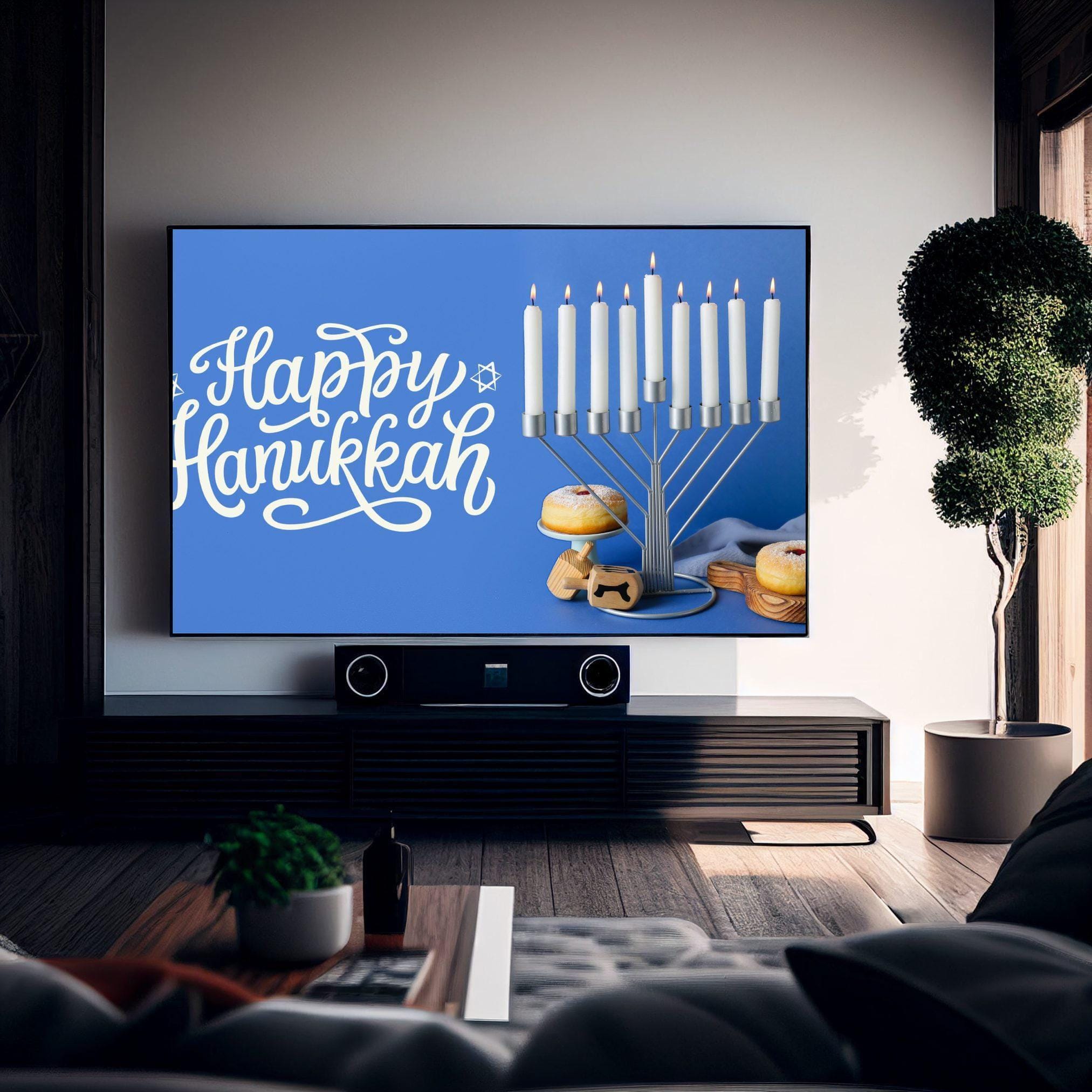 Celebrate the warmth and tradition of Hanukkah with this beautifully crafted digital art, designed specifically for your Samsung Frame TV. Inspired by the joyous menorah lighting and playful dreidel motif, this unique TV decoration brings a modern touch to your Jewish holiday decor. Perfect for enhancing your home festival decor, it captures the spirit of the 8 nights screensaver in vibrant 4K resolution.