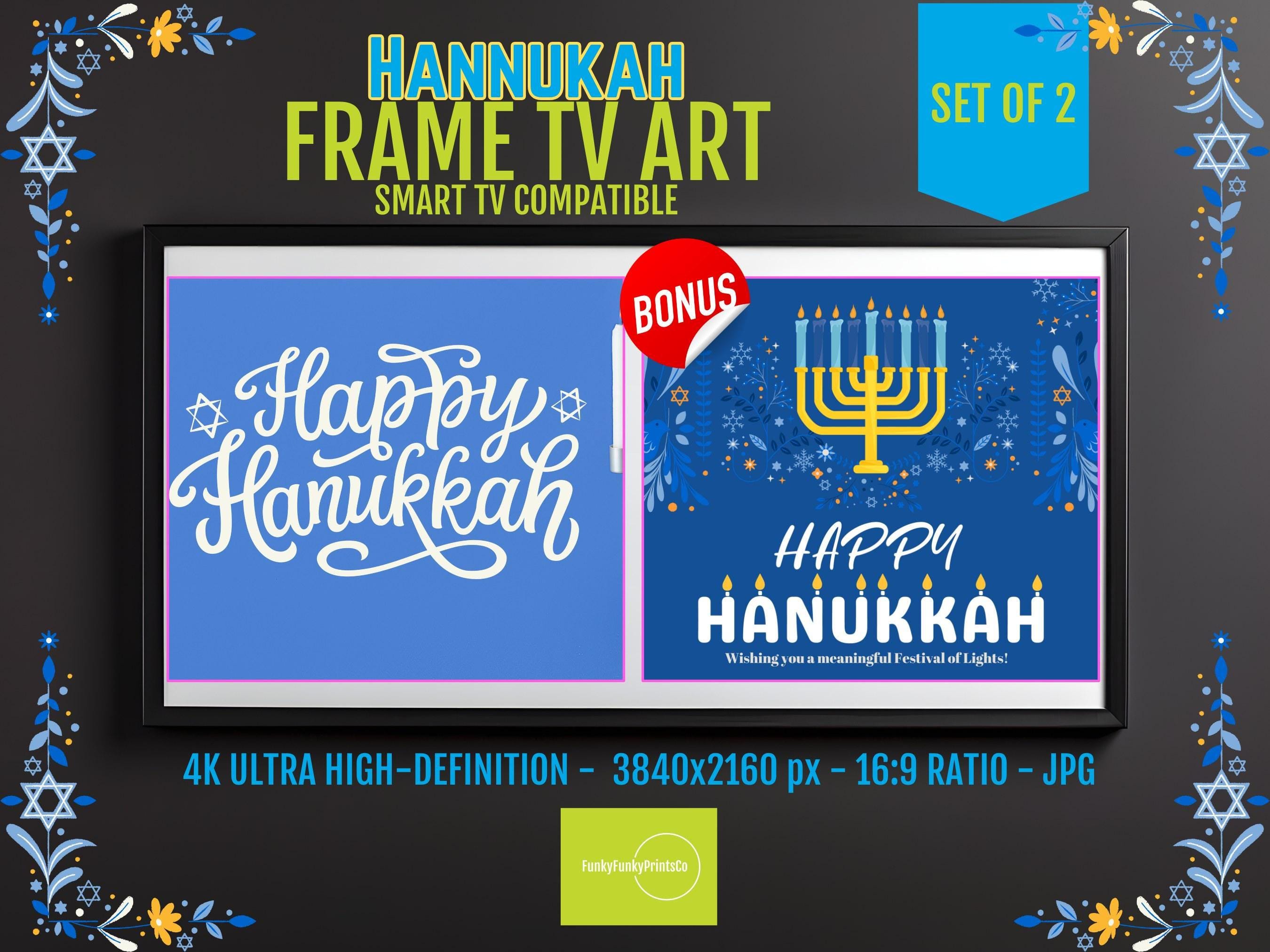 Celebrate the warmth and tradition of Hanukkah with this beautifully crafted digital art, designed specifically for your Samsung Frame TV. Inspired by the joyous menorah lighting and playful dreidel motif, this unique TV decoration brings a modern touch to your Jewish holiday decor. Perfect for enhancing your home festival decor, it captures the spirit of the 8 nights screensaver in vibrant 4K resolution.