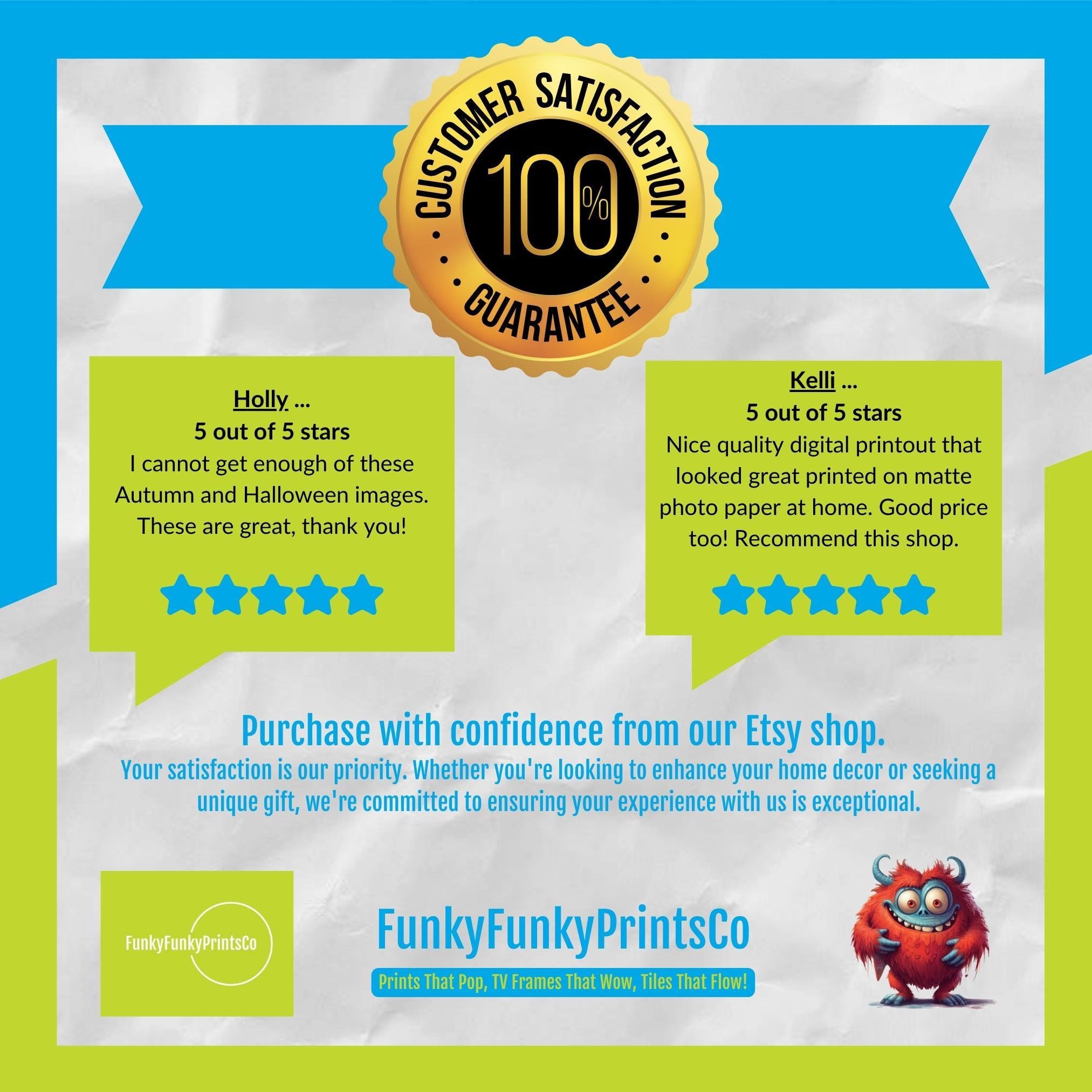 FunkyFunkyPrintsCo is committed to providing high-quality digital downloads that meet or exceed customer expectations. In the unlikely event that you are not satisfied with your purchase, we offer a 100% satisfaction guarantee. Simply reach out to us and we will do everything we can to make it right.