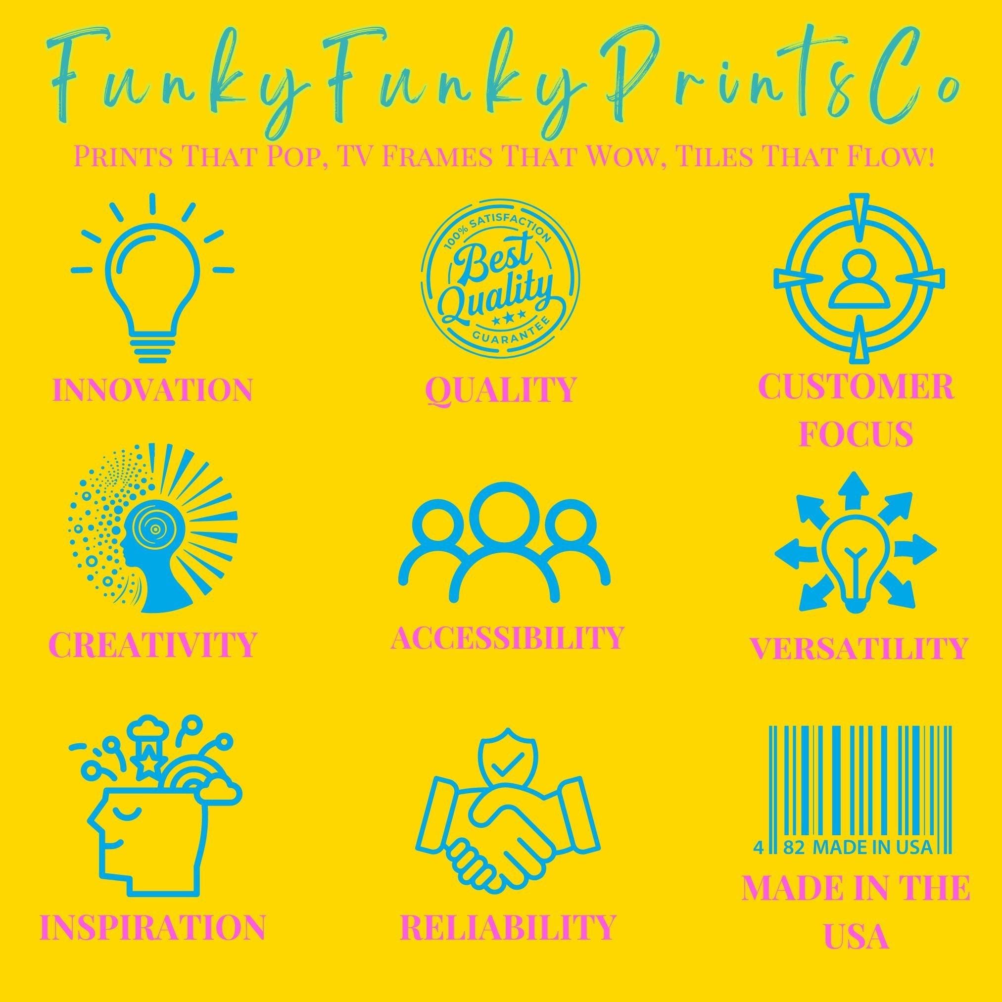 At FunkyFunkyPrintsCo, Rob and Will infuse every creation with passion and whimsy inspired by their childhood love of design. Explore our full collection for more vibrant, joyful pieces that brighten your home. Follow us for updates and new releases on Instagram, Pinterest, Facebook, and Twitter: