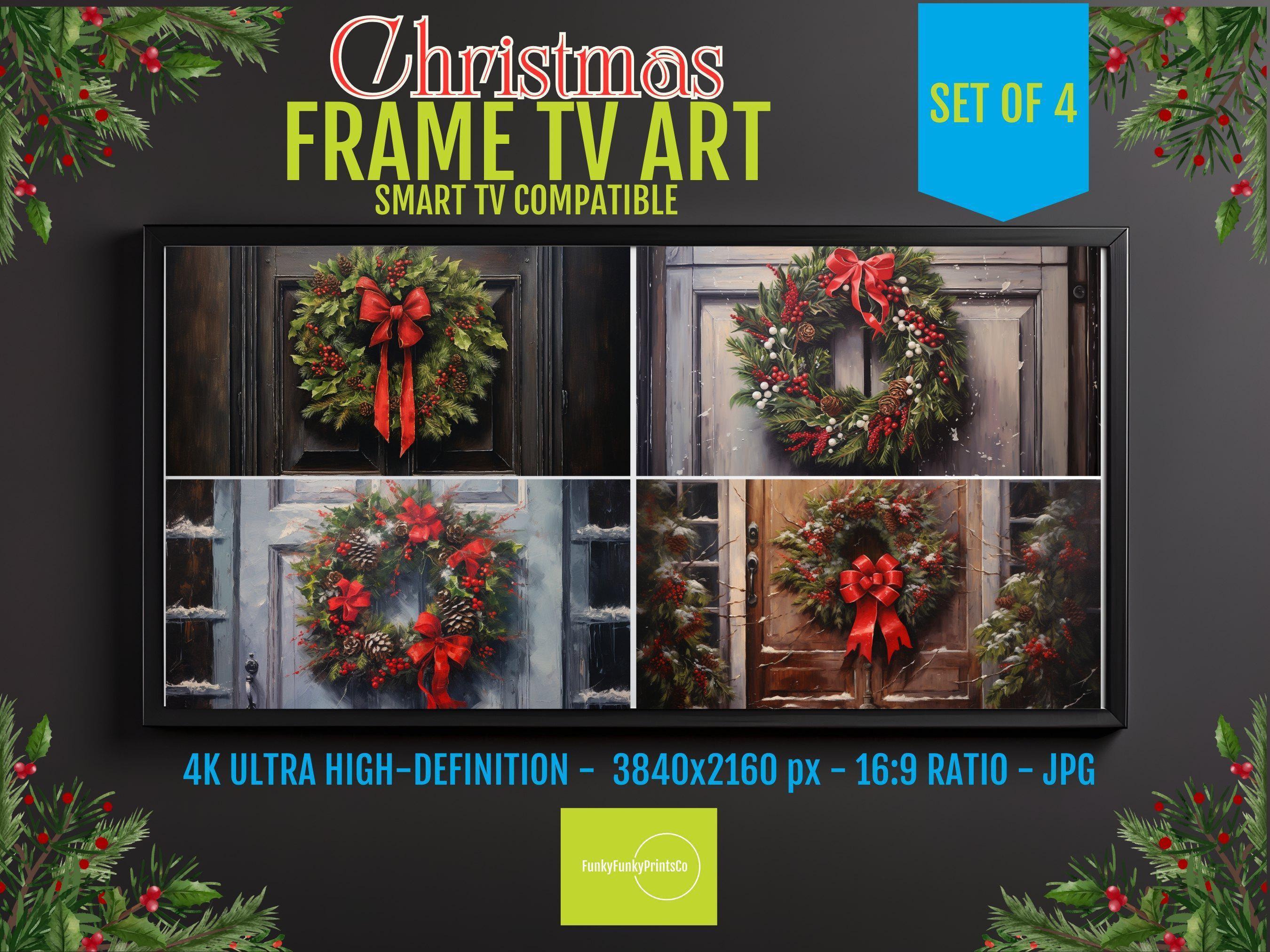 Transform your living room this holiday season with charming farmhouse holiday decor designed specifically for your Samsung Frame TV. Our Christmas wreaths bring a cozy, festive spirit right to your screen with stunning 4K HD digital art that feels warm and inviting. This instant download set of four unique designs effortlessly blends rustic holiday decor with modern technology to brighten your home.
