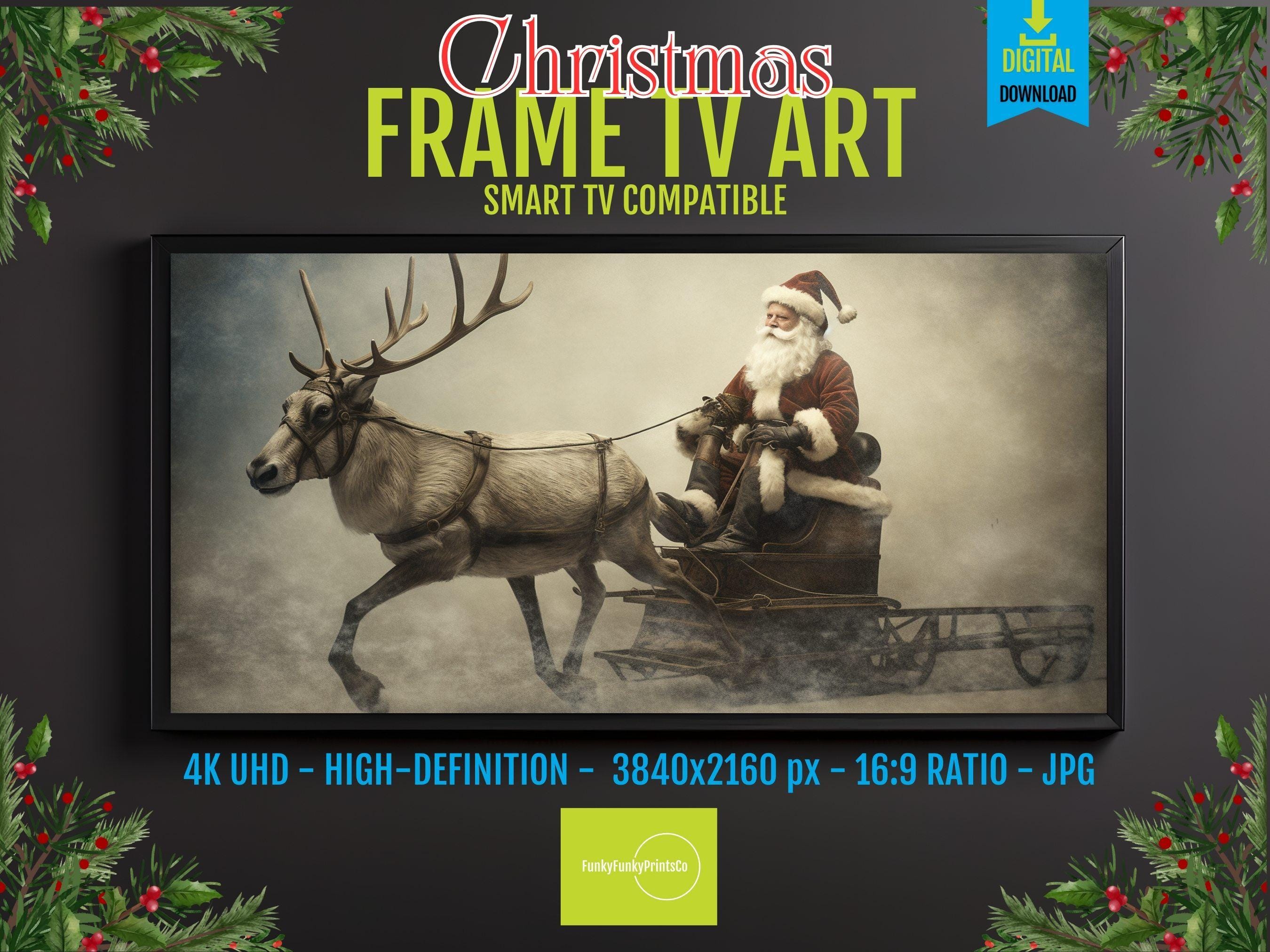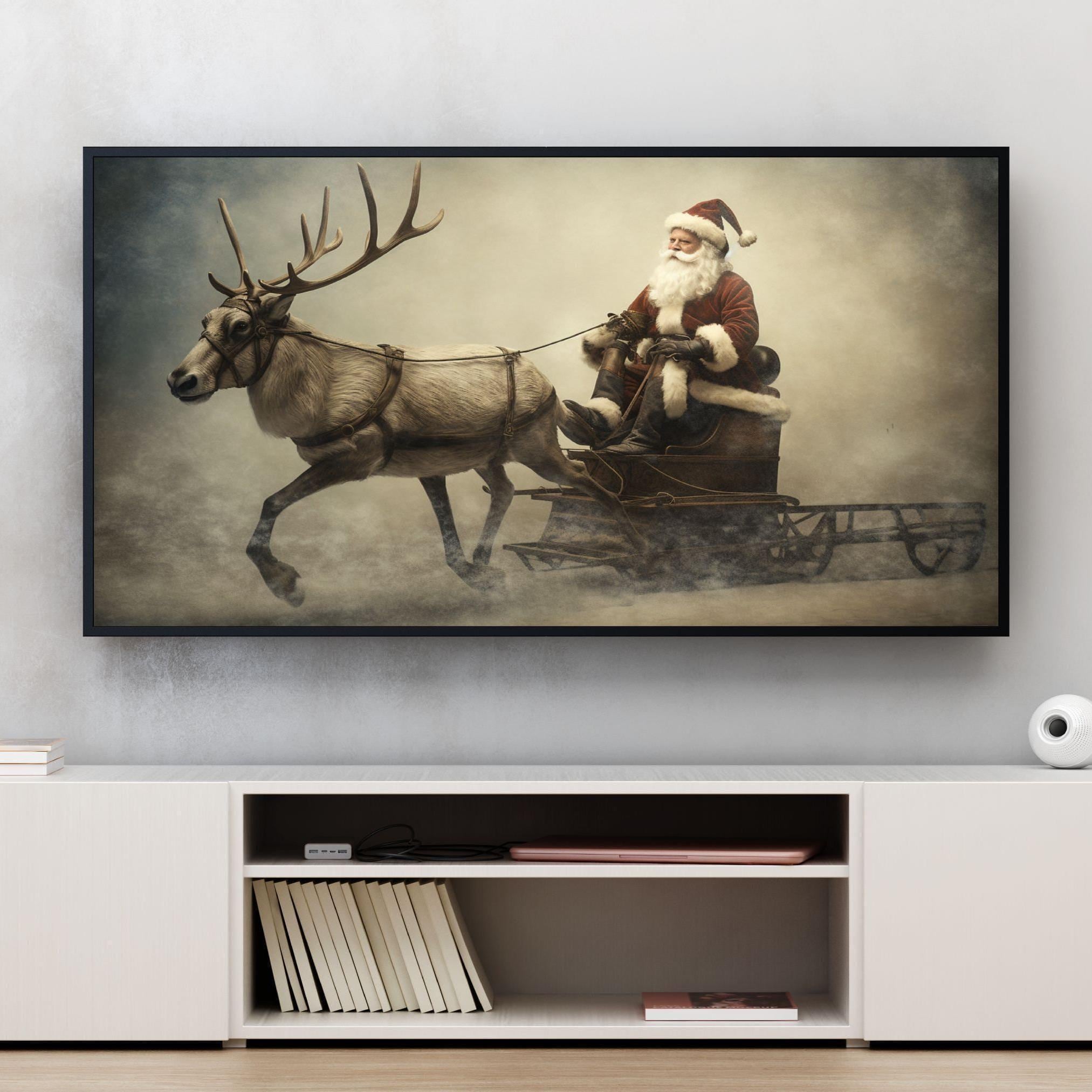 Step into a nostalgic holiday scene with this charming Santa Claus sleigh artwork, designed to bring warmth and festive spirit to your home. Perfect for those seeking a digital Xmas display that captures the magic of Father Christmas and his reindeer in stunning 4K HD clarity. This vintage Christmas frame TV art transforms any screen into a seasonal home decor centerpiece that delights and inspires.