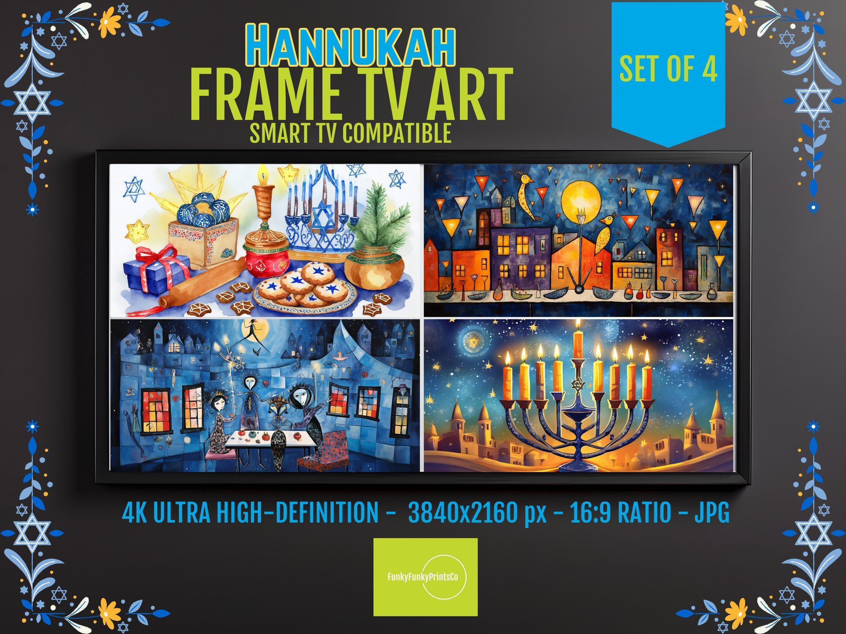 Celebrate the warmth and light of Hanukkah with this vibrant digital art designed especially for your Samsung Frame TV. Featuring joyful Hanukkah art that showcases a glowing menorah and festive dreidel game decor, this 4K HD digital art instantly transforms your holiday home display into a captivating seasonal gallery. Perfect as a Hanukkah gift idea or a meaningful addition to your own celebrations, this instant download art brings tradition and modern technology together beautifully.