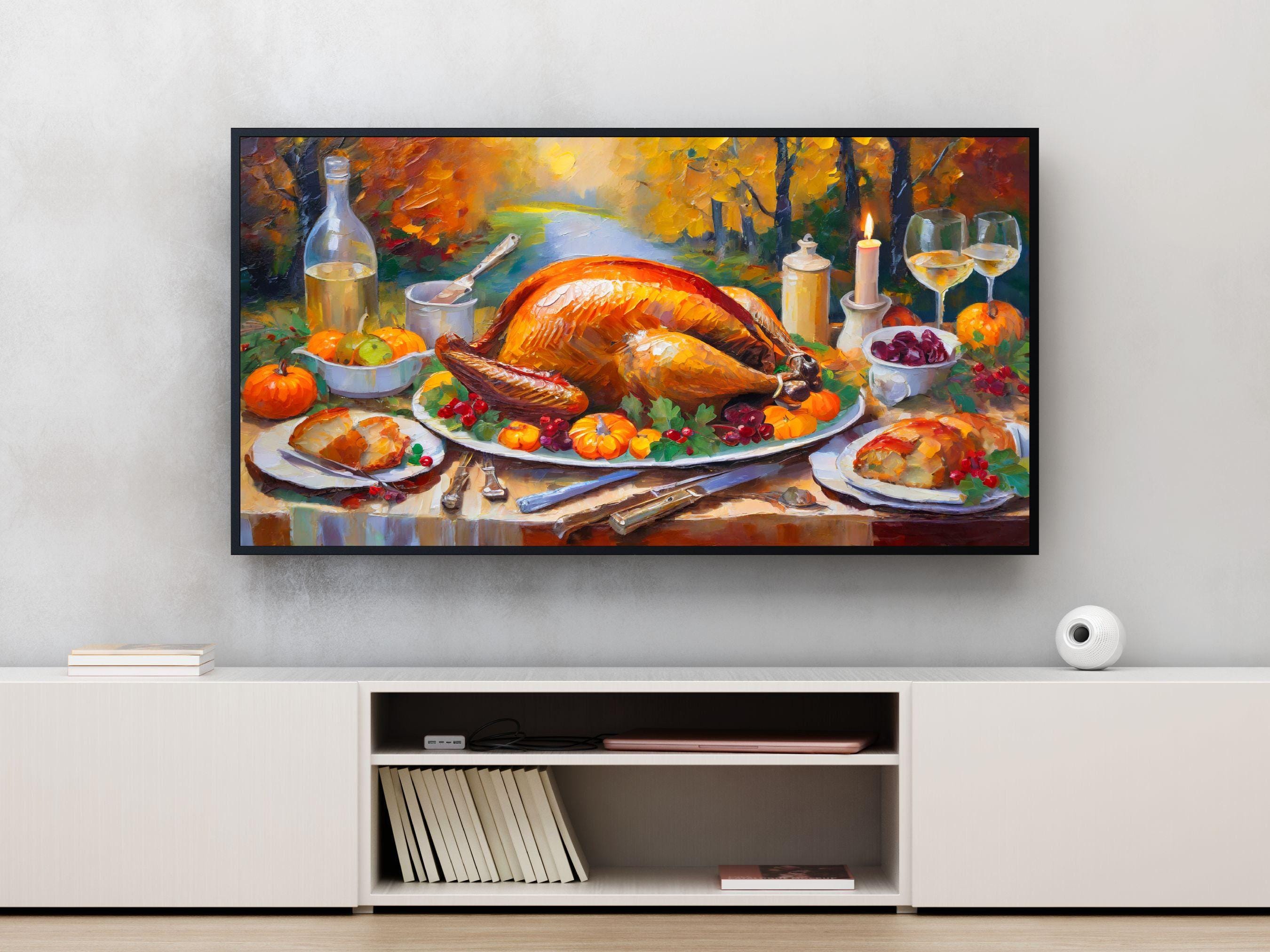 Enhance your Thanksgiving decor with this stunning TV art that showcases the heartwarming tradition of cutting the turkey. The high-definition quality provides a crisp and vibrant display, making it a standout piece in your collection of holiday decorations.
