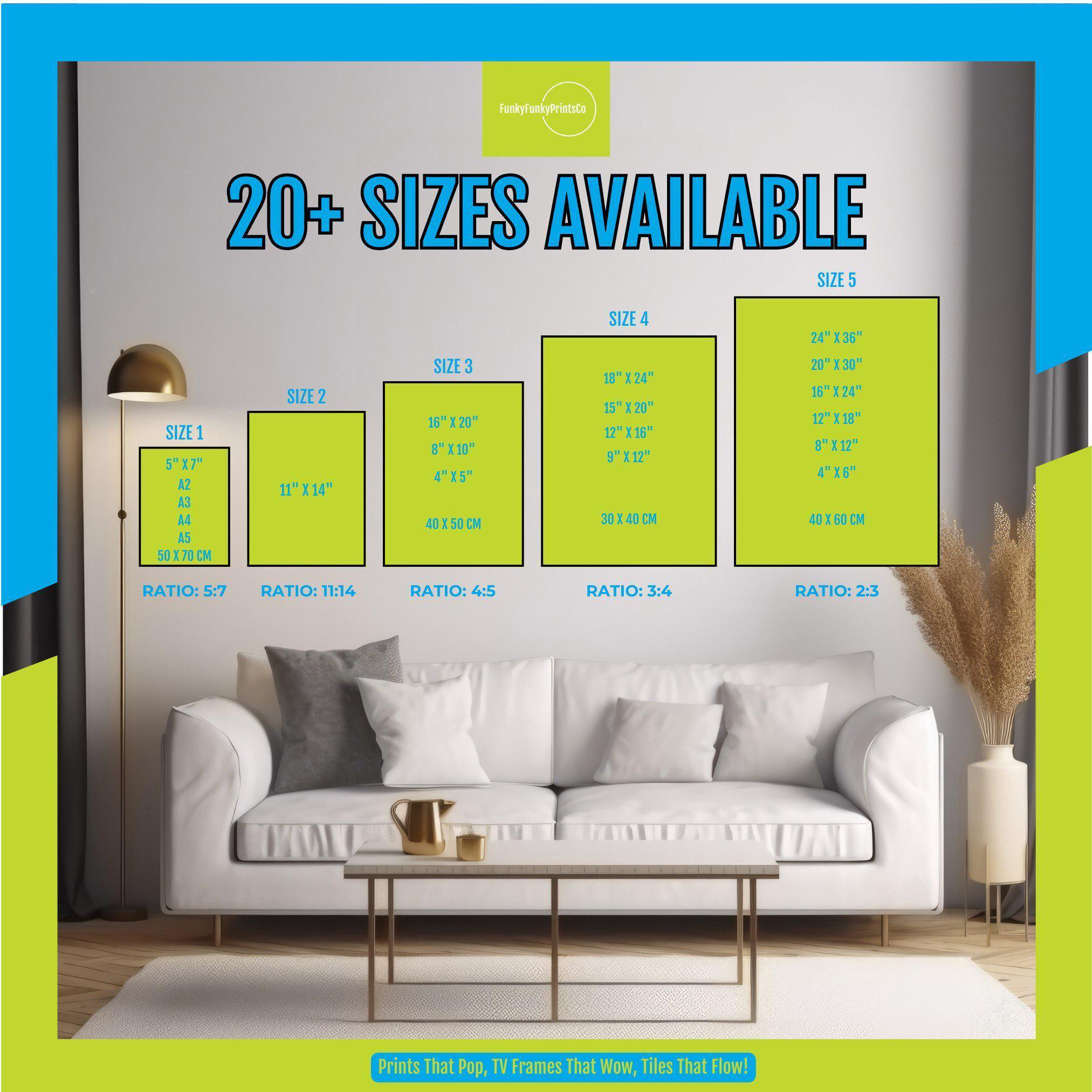 We provide a range of sizes for our digital products. For Digital Art Prints, the available sizes include 5"x7", 8"x10", 11"x14", 11"x17", 16"x20", 18"x24", 20"x30", 24"x36", and A2 (23.4"x16.5"). Our Seamless tile prints have a resolution of 300dpi and dimensions of 3600px x 3600px, equivalent to 12"x12". The Frame TV Art is in Ultra High Definition (UHD) with a resolution of 3840:2160, suitable for 16:9 ratio TVs. All our products are digital downloads and can be instantly accessed after purchase.