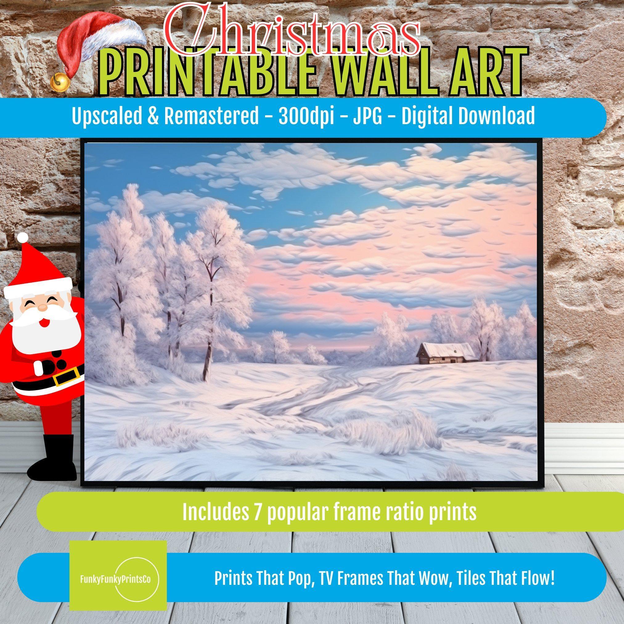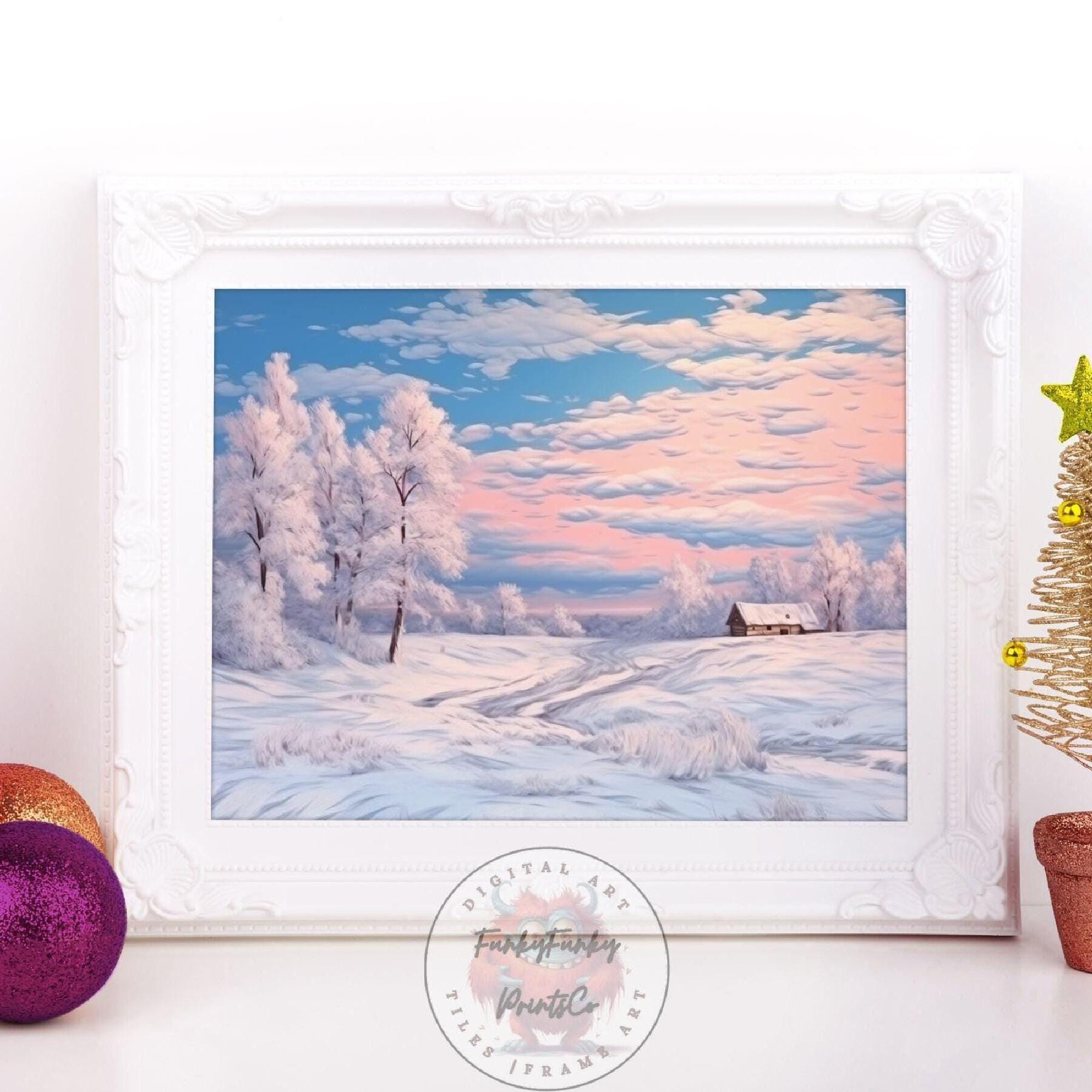 Transform your home into a serene winter haven with this Winter Wonderland PRINTABLE Wall Art. This enchanting snowy landscape features a picturesque cottage surrounded by snow-covered trees under a beautiful pink sky, creating a captivating and tranquil focal point for any room. Perfect for those who appreciate the peaceful beauty of winter, this digital download brings the magic of a snowy wonderland into your home decor.