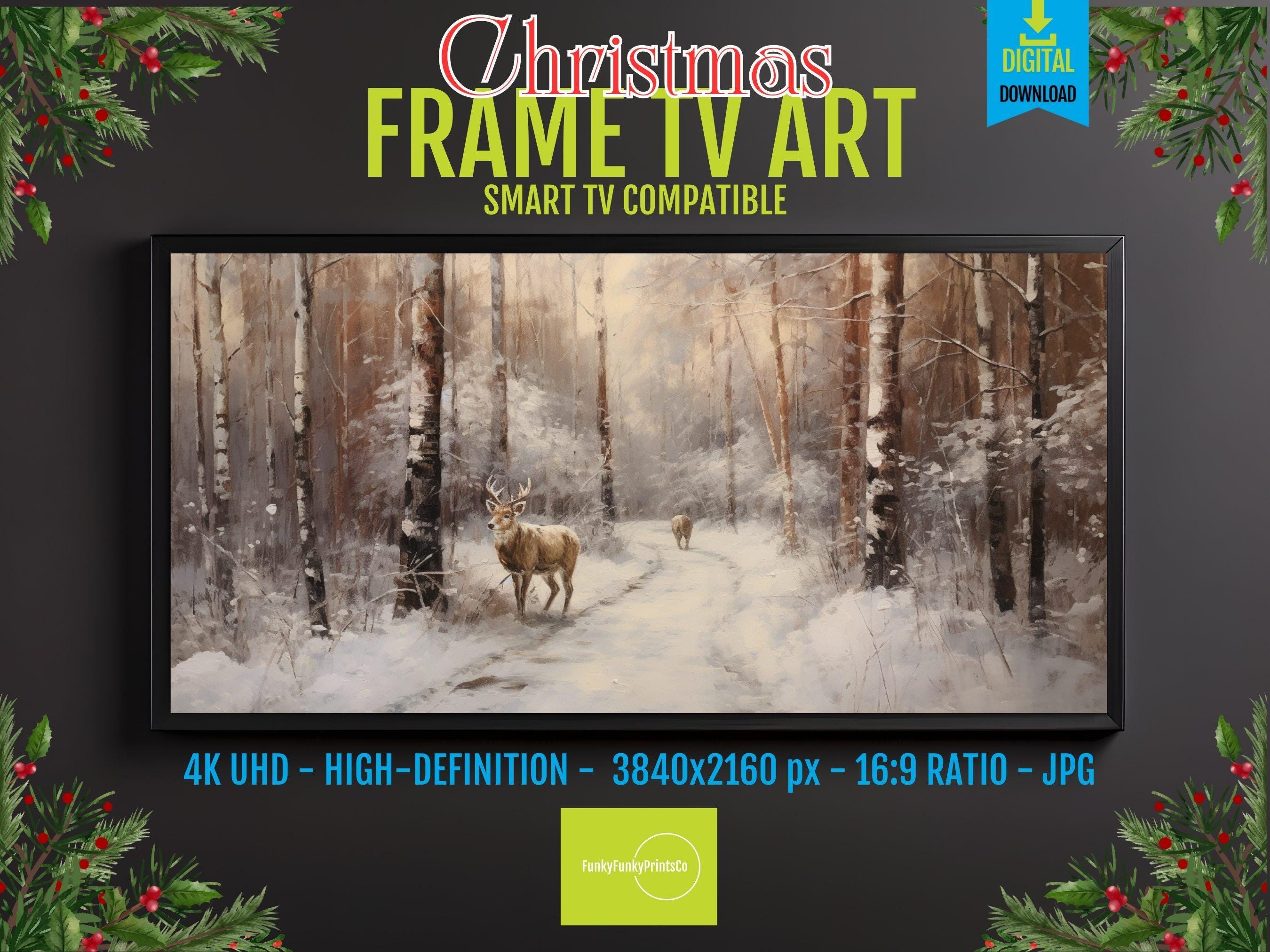 Step into a tranquil winter wonderland with this snowy forest digital art, designed to bring cozy winter decor right to your living room. Perfectly crafted as a Samsung Frame TV screensaver, this winter oil painting transforms your TV into a festive holiday TV display that captures the serene beauty of snow-covered landscapes. Celebrate the season with this digital download art that adds a peaceful and elegant touch to your Christmas room decor.