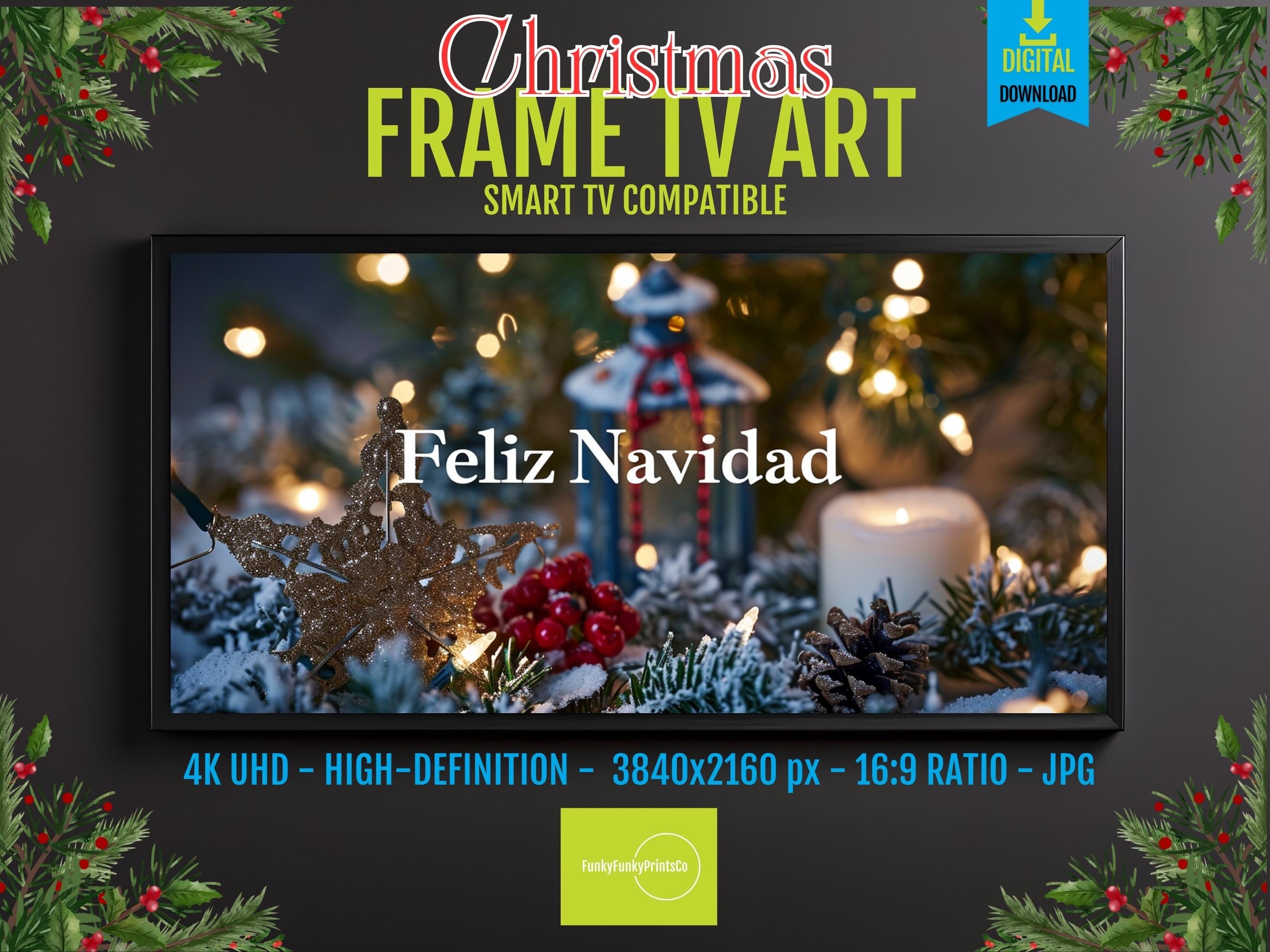 Bring the magic of a winter wonderland into your living room with this Art Feliz Navidad digital download, specially crafted for Samsung Frame TV displays. This festive TV artwork transforms your screen into a seasonal TV display filled with holiday cheer and sparkling details. Perfect for those seeking high-resolution art that captures the spirit of the holidays with ease and style.