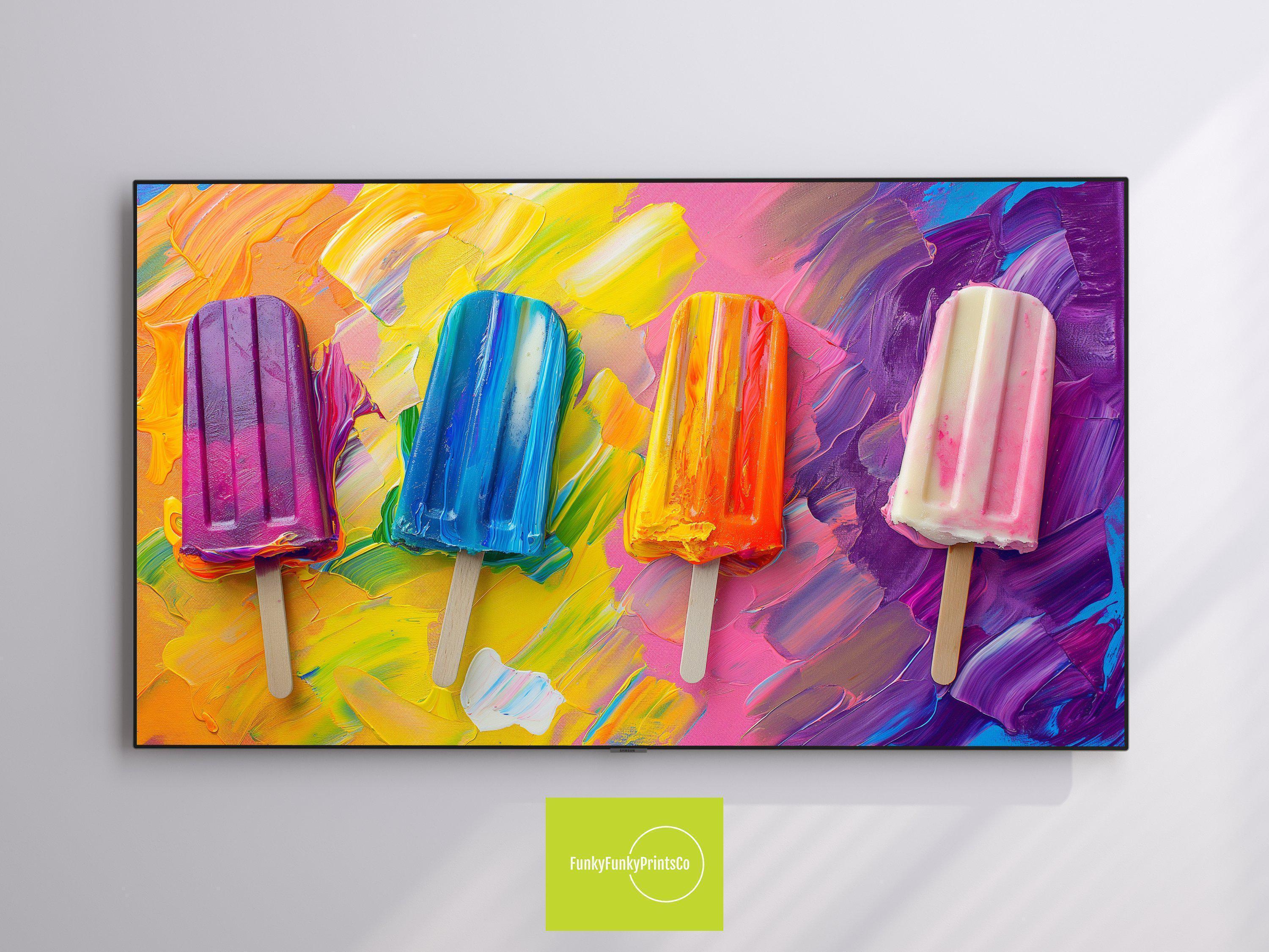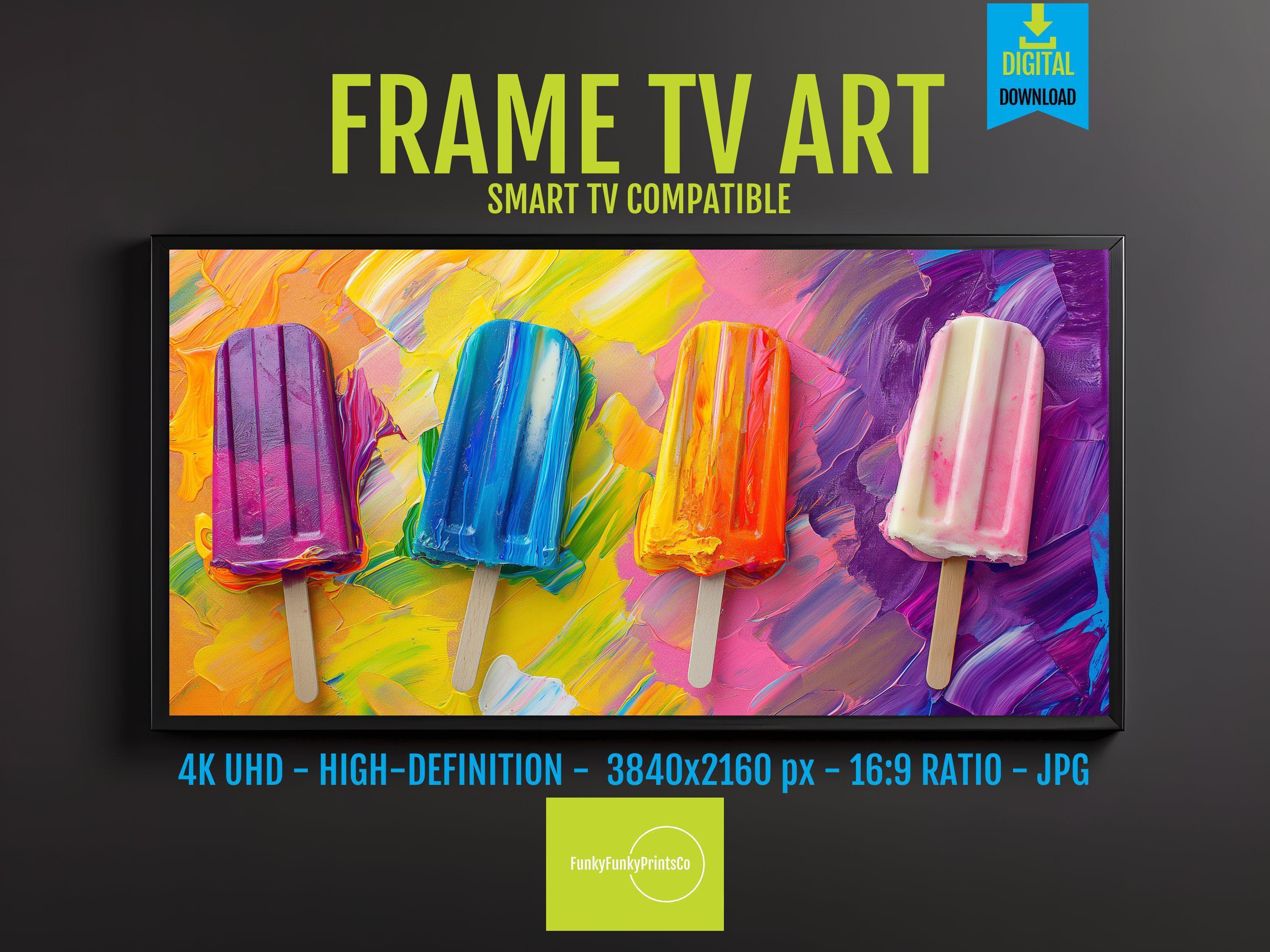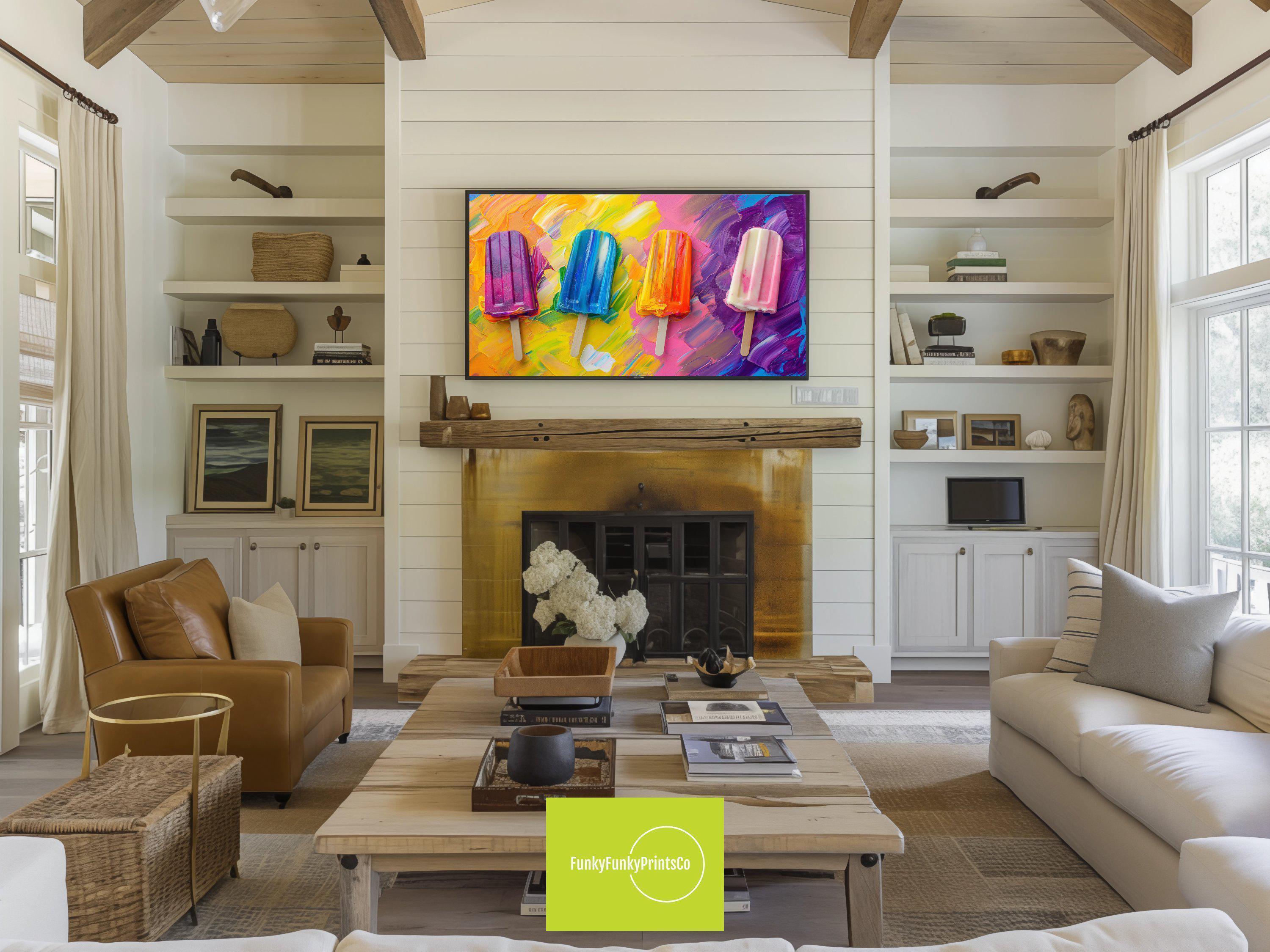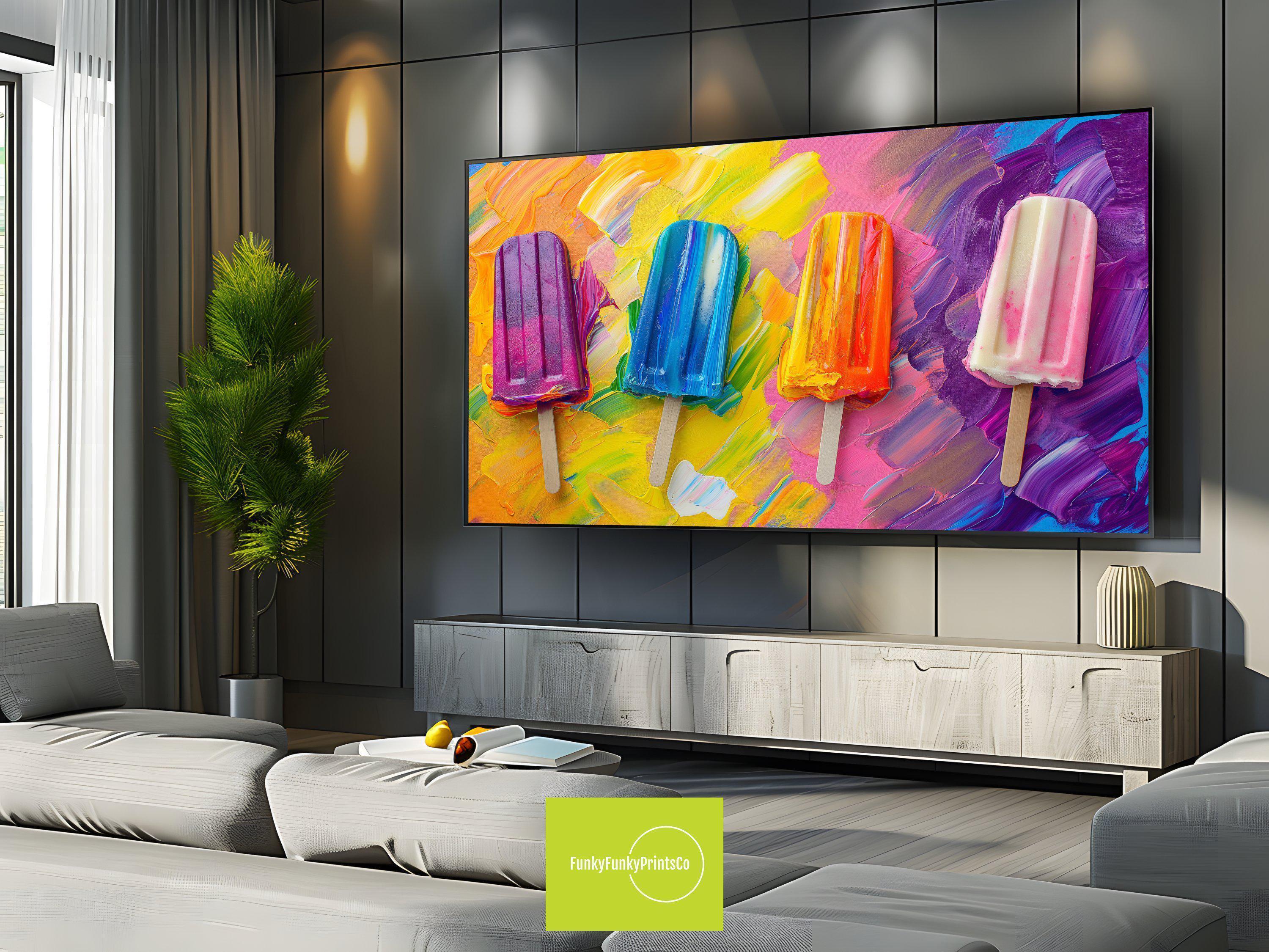 Celebrate the vibrant spirit of summer with our colorful Summer Popsicle Art, designed specifically for your Samsung Frame TV. This playful summer treat decor instantly transforms your living space with bright, cheerful TV artwork that captures the essence of sunny days and fun times. Perfect as a fun home screensaver or holiday TV art for 4th of July celebrations, this 4k instant download brings a splash of joy and warmth to any room.