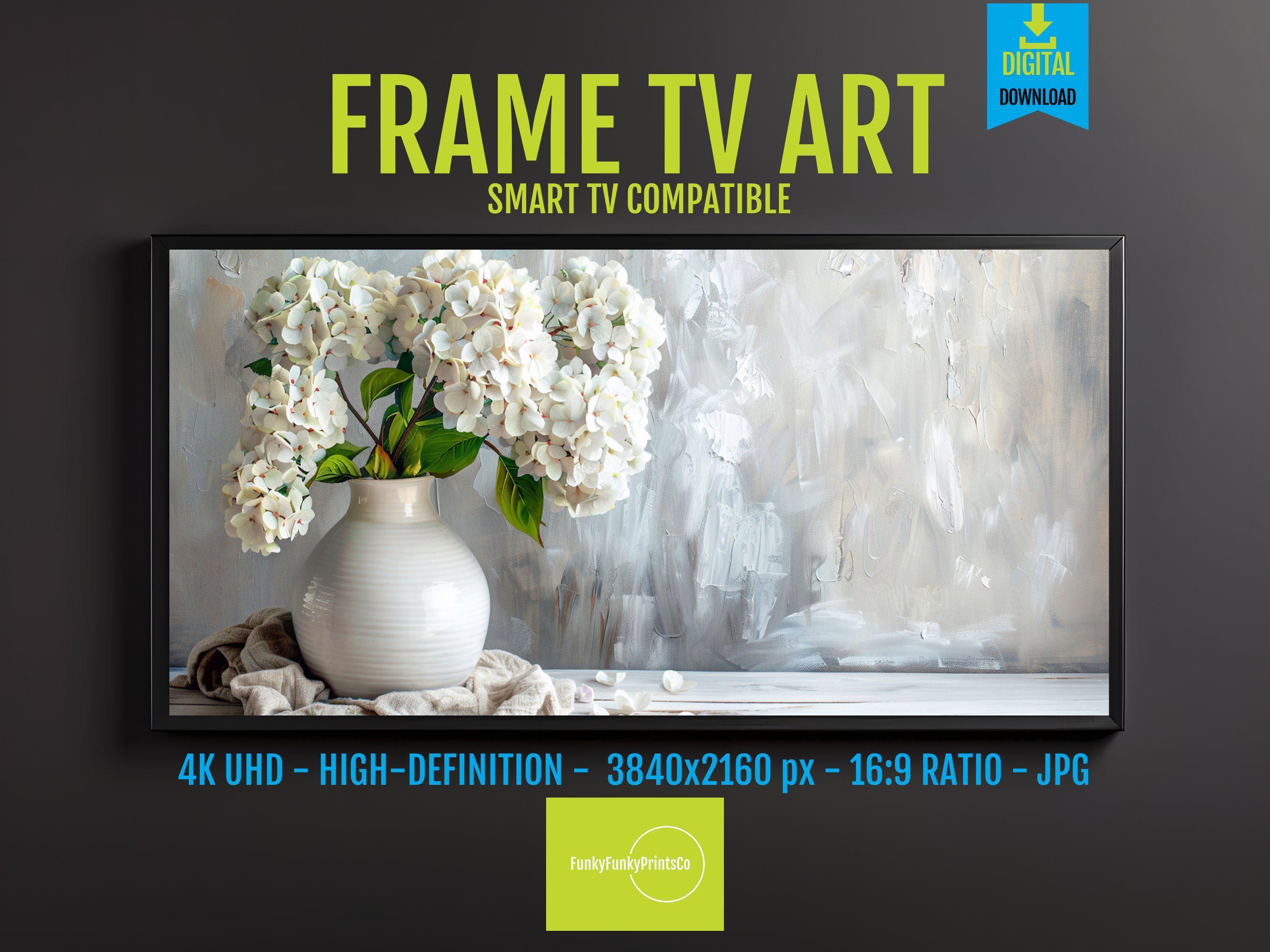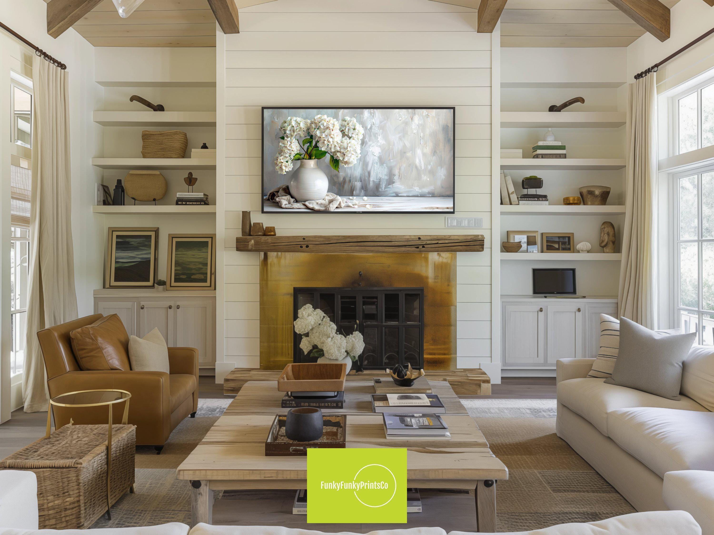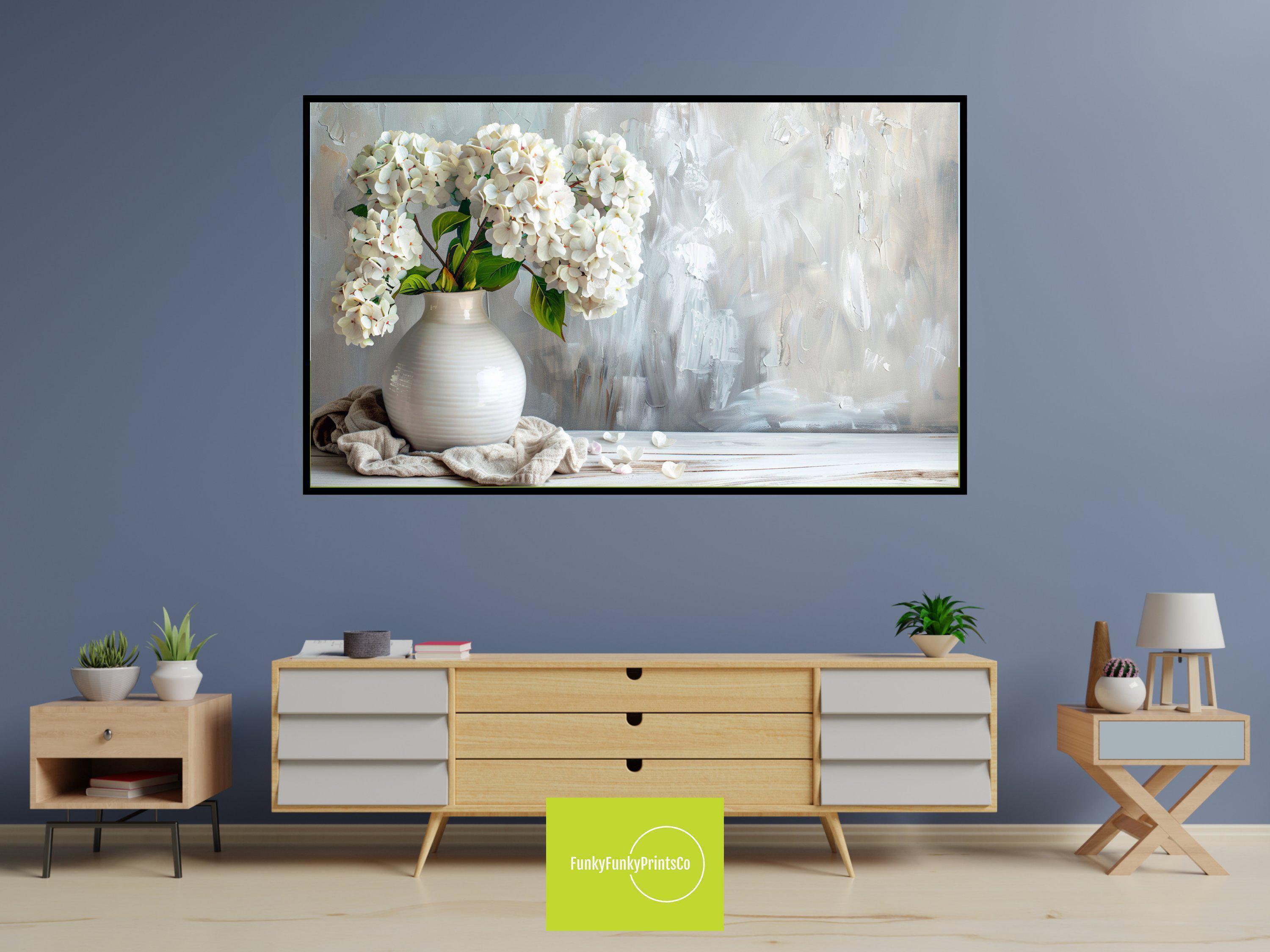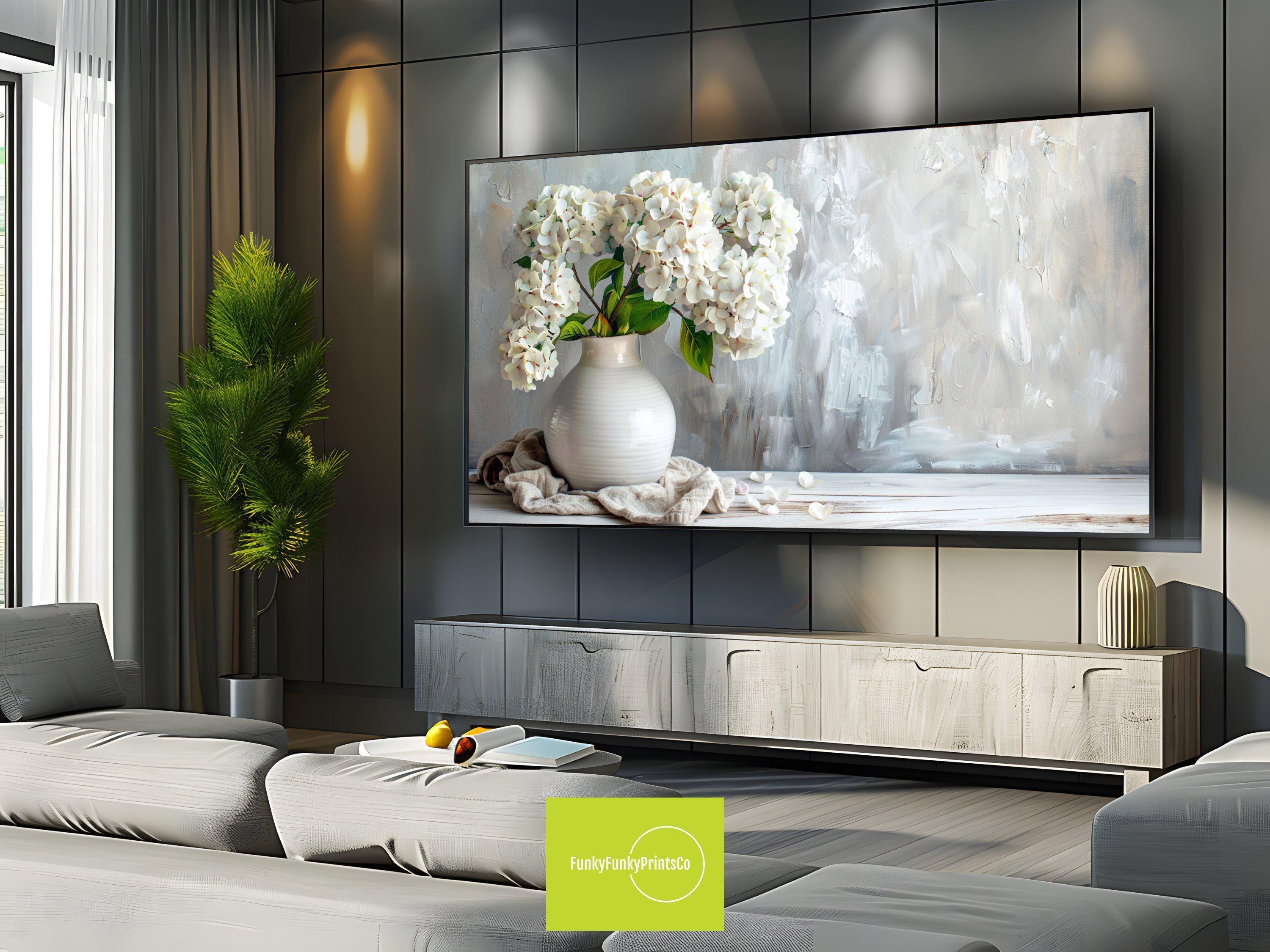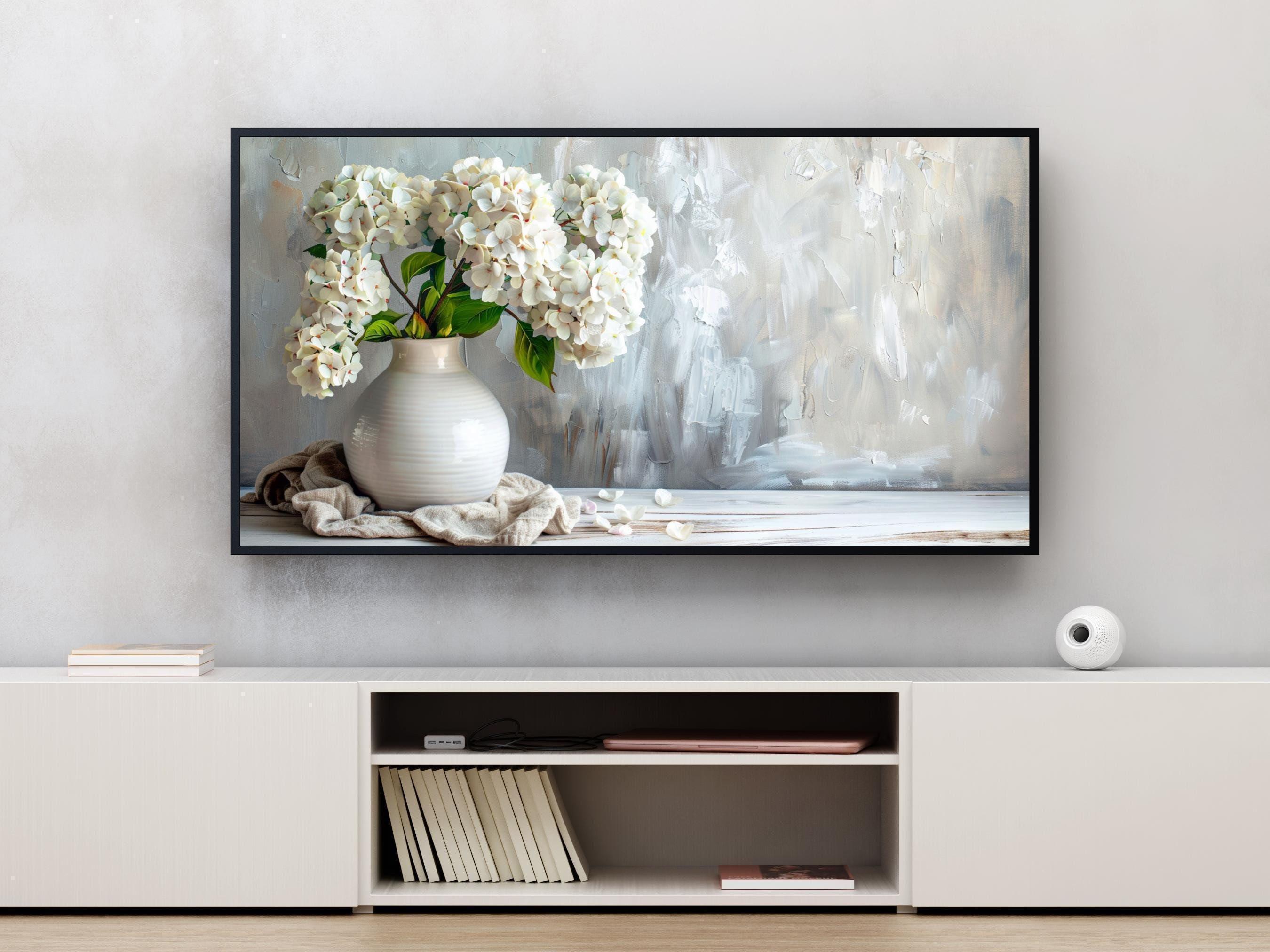 Transform your living space with this elegant floral digital download, featuring a serene white hydrangea vase that brings rustic elegance gift charm to your Samsung Frame TV. The soft white flowers bloom gently in pastel hues, creating a feminine home art piece that blends seamlessly into any décor. Designed in stunning 4k HD digital art, this charming vase print offers a timeless floral tv artwork experience perfect for adding subtle beauty to your rustic living room.