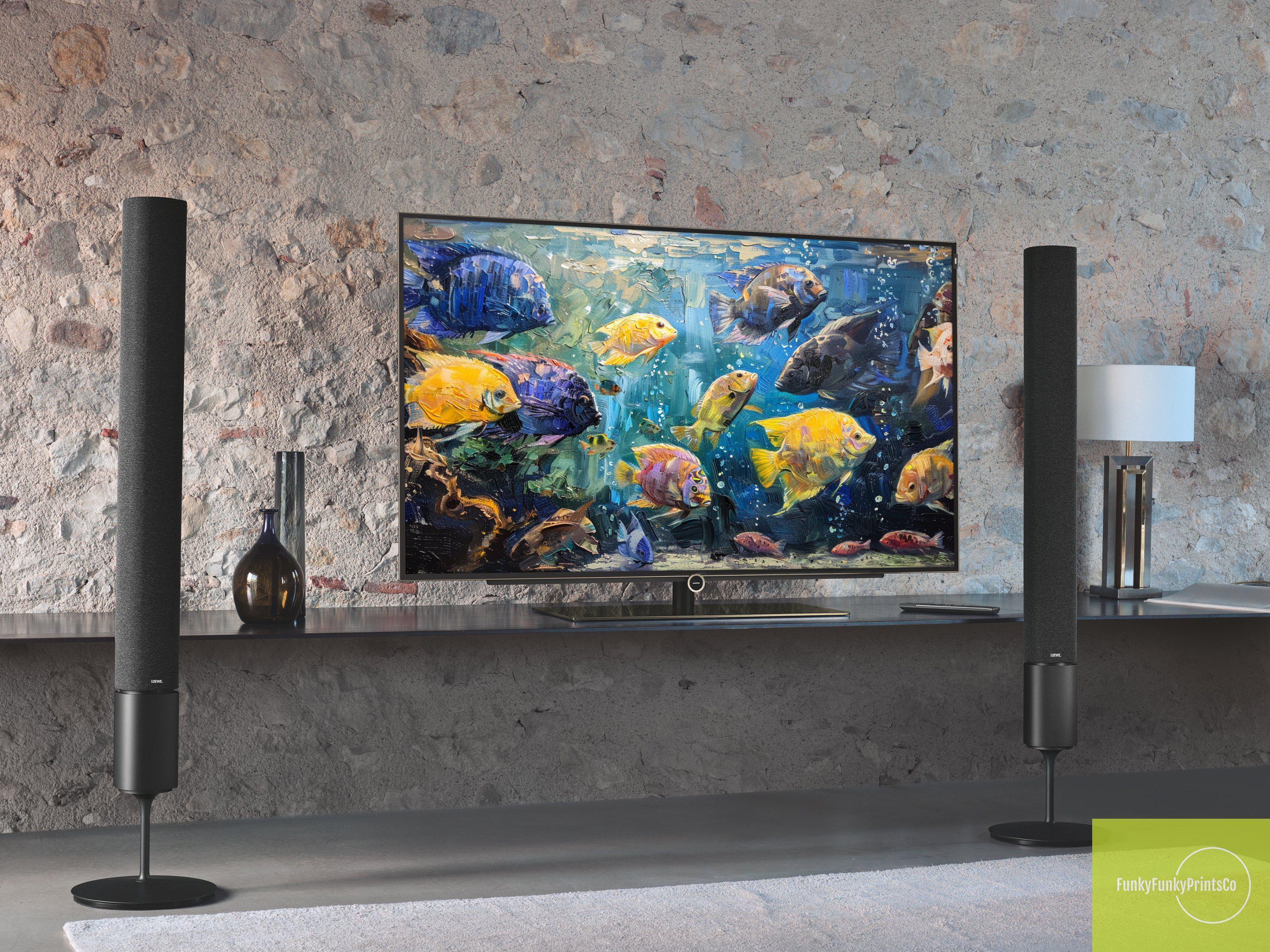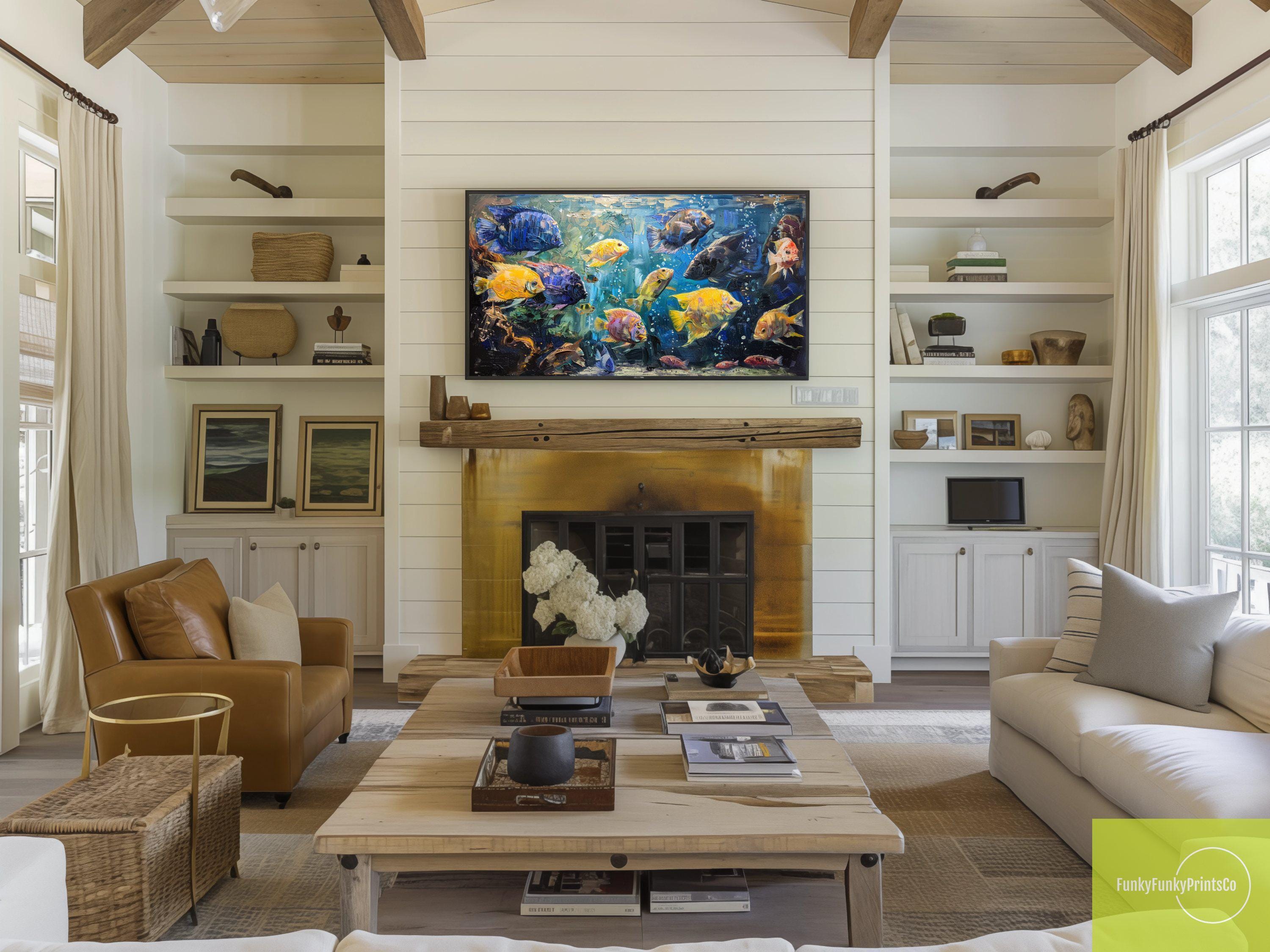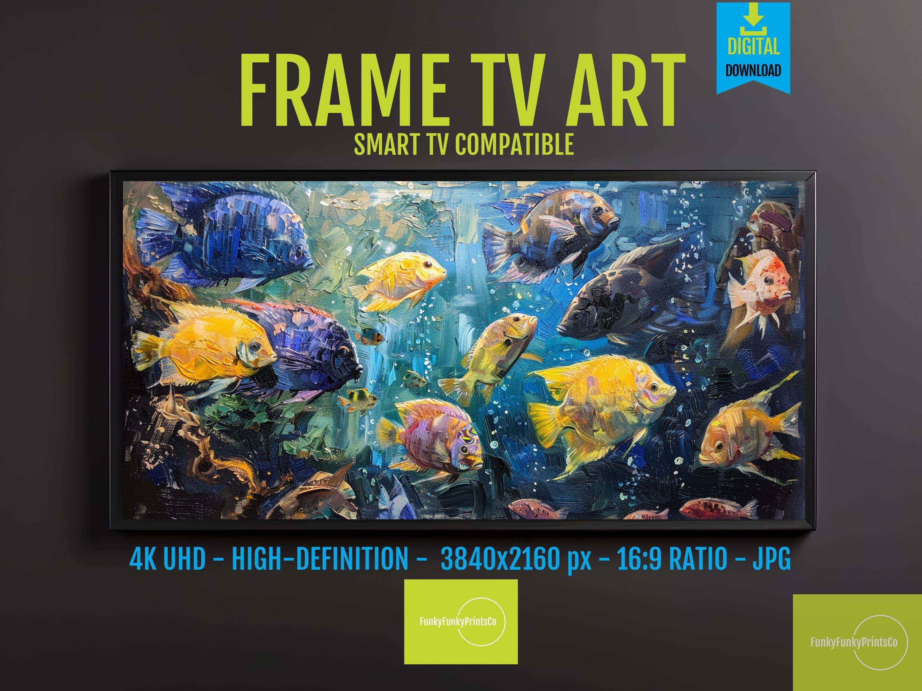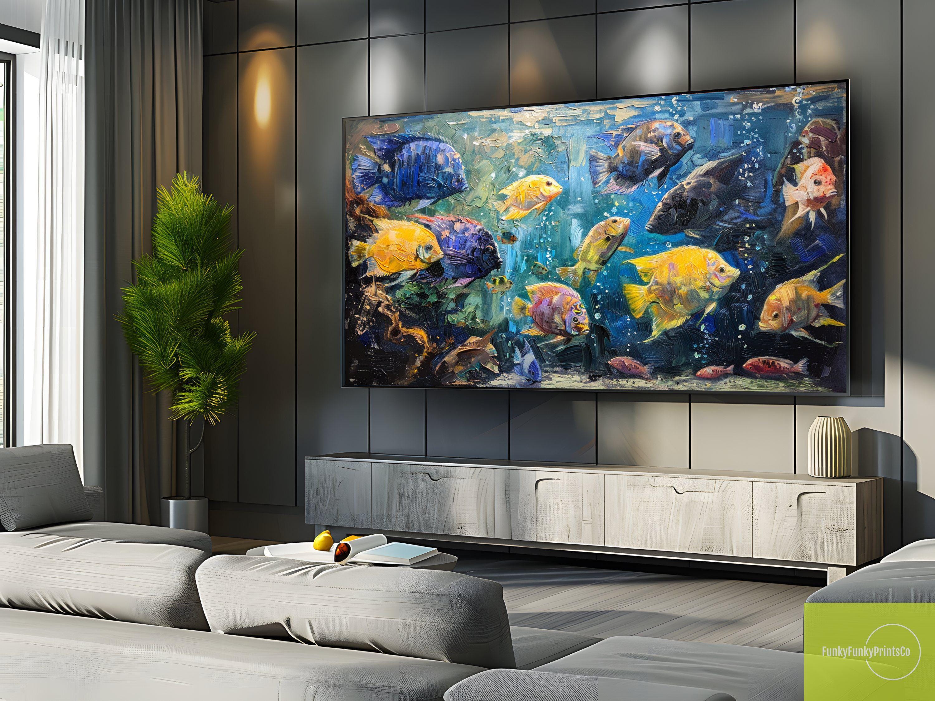 Dive into a vibrant underwater world with this tropical fish oil painting, designed to transform your Samsung Frame TV into a stunning aquatic display. This digital download 4K artwork captures colorful marine life in vivid detail, blending watercolor fish art with rich oil painting textures for a mesmerizing ocean theme decor. Perfect for anyone seeking to bring the serene beauty of an underwater aquarium into their living space.