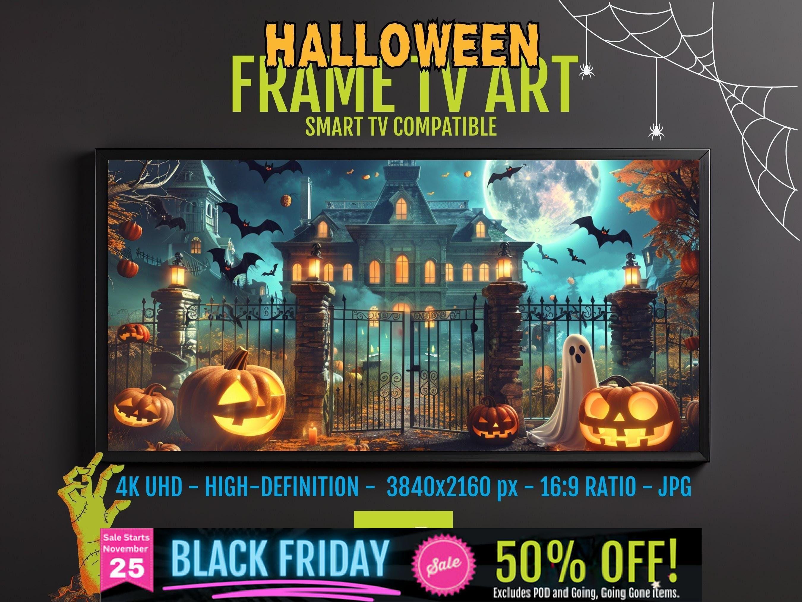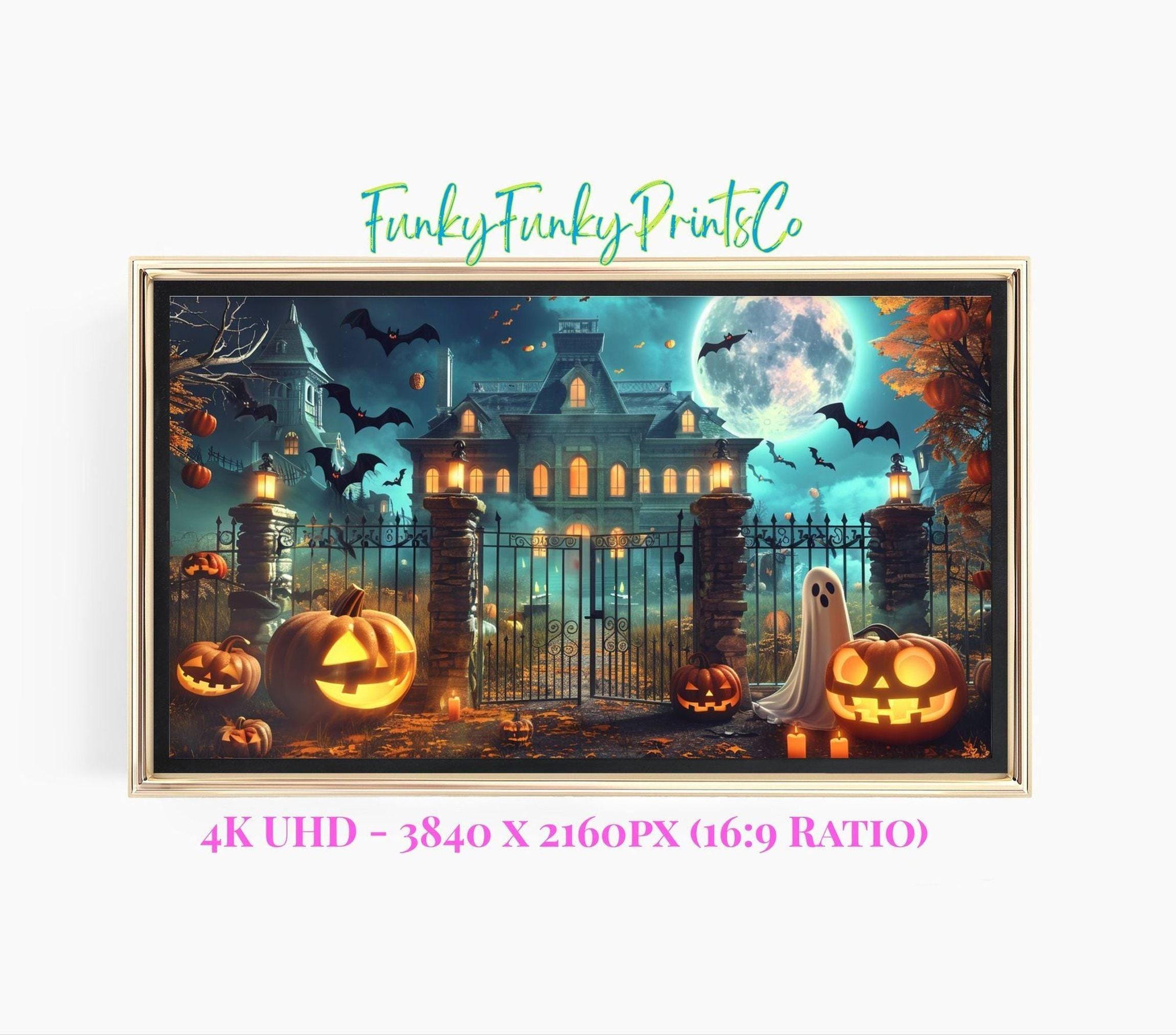 Step into a world of spooky charm with this haunted house scene, perfect for adding an eerie mansion ambiance to your Halloween home decor. This 4k digital download transforms your Samsung Frame TV into a captivating centerpiece filled with ghosts and bats art that flutter through the night sky. Celebrate the spooky season decor with a high-resolution screensaver that brings festive thrills and chilling beauty to any room.
