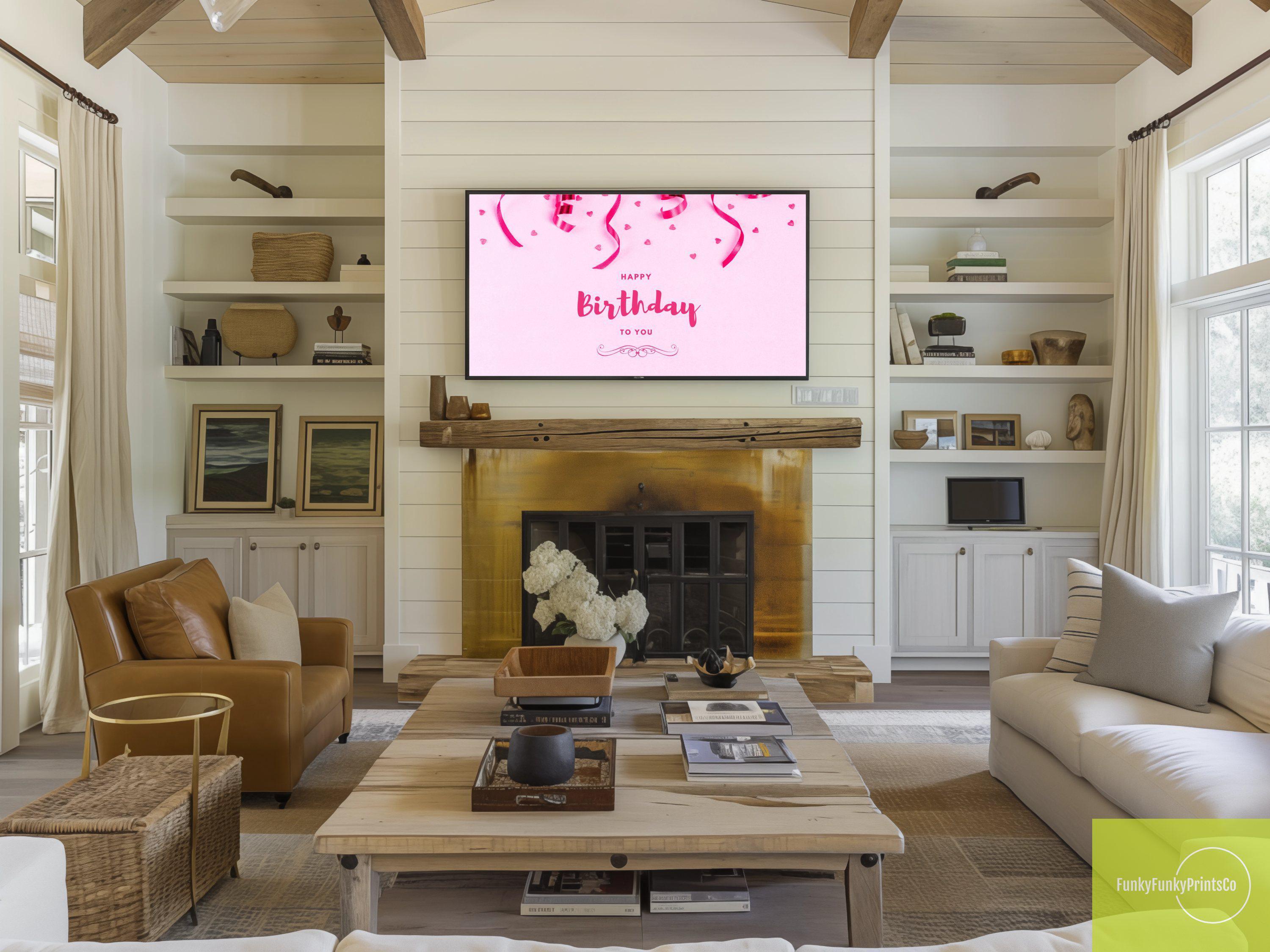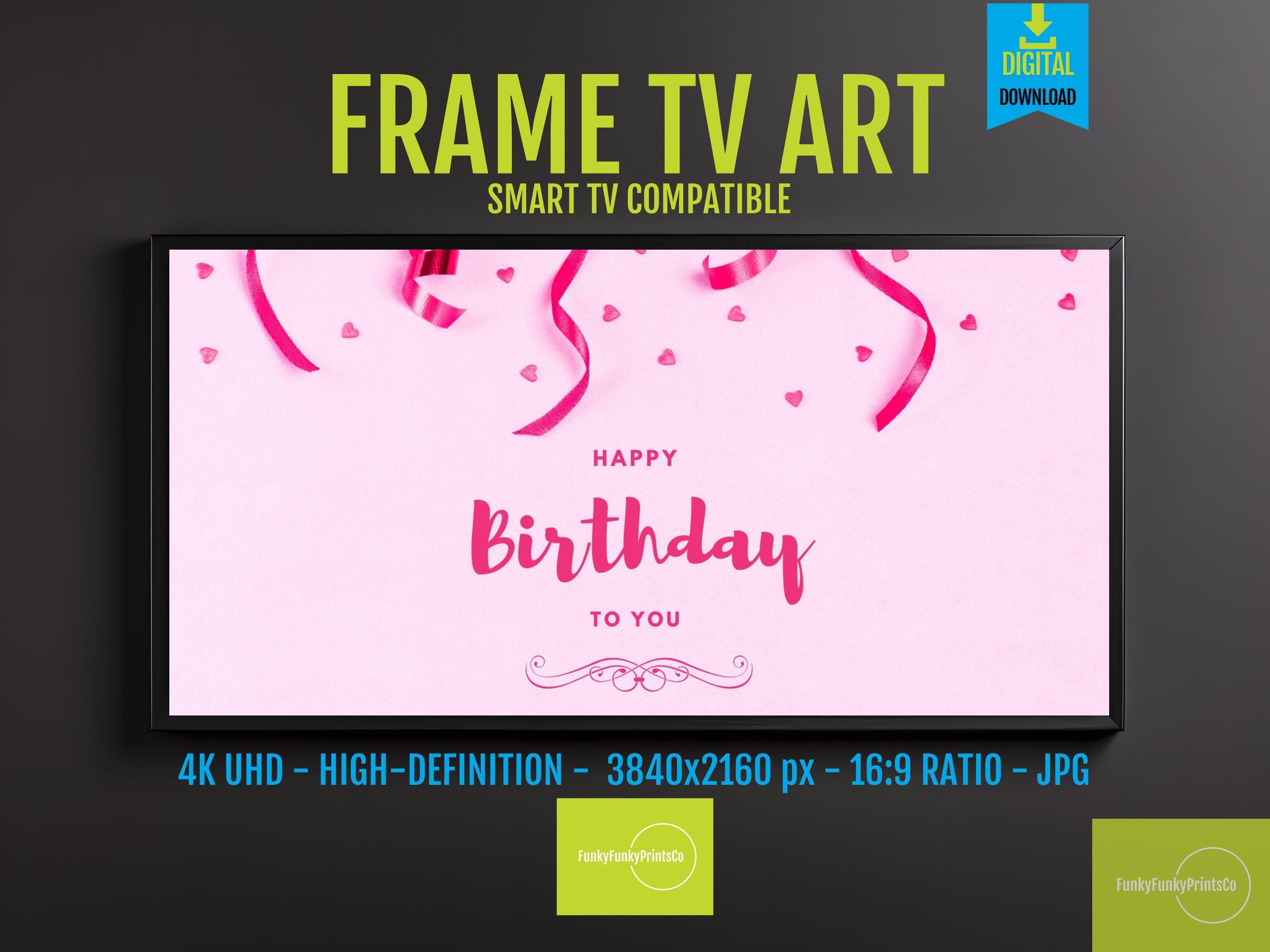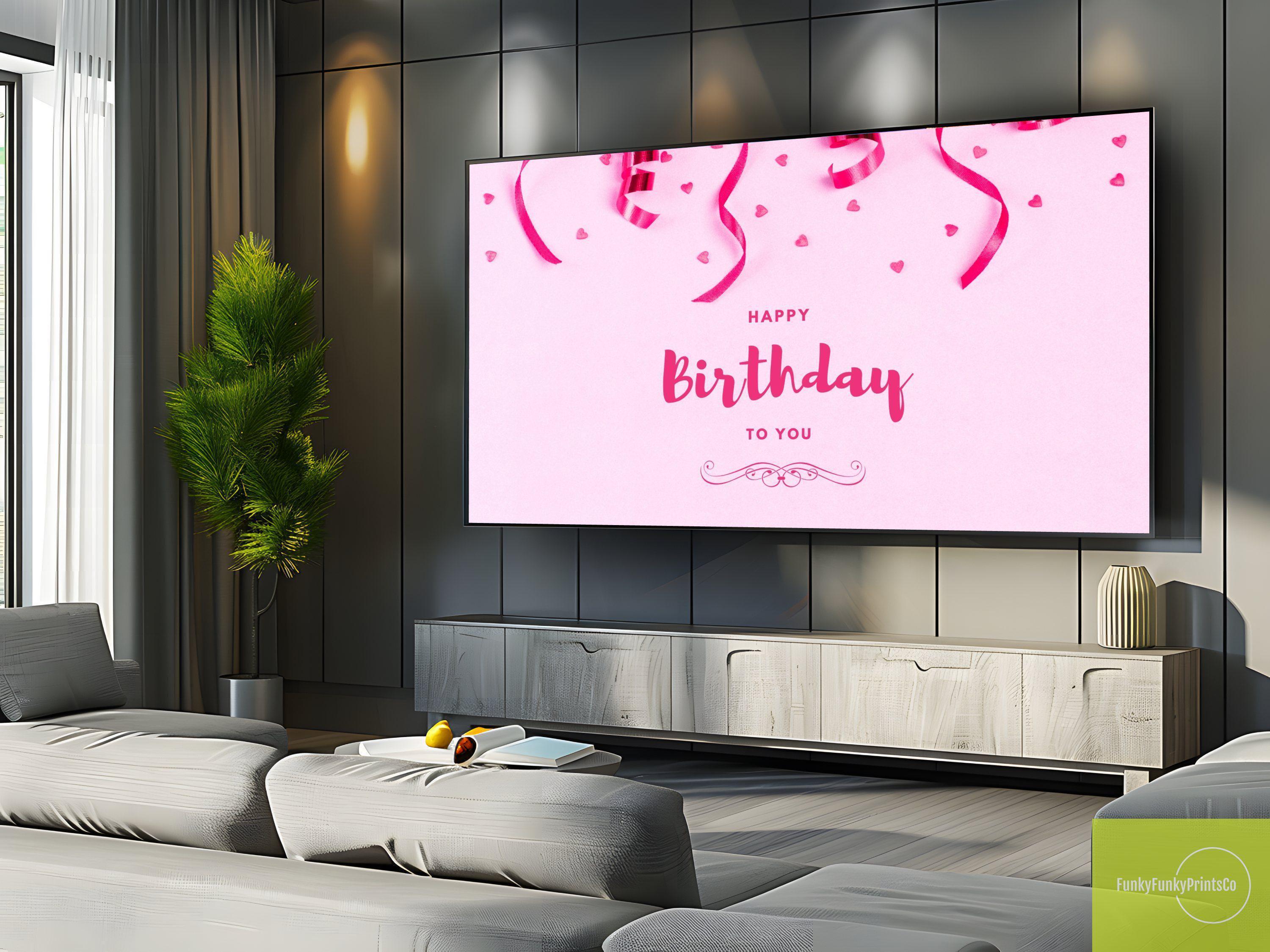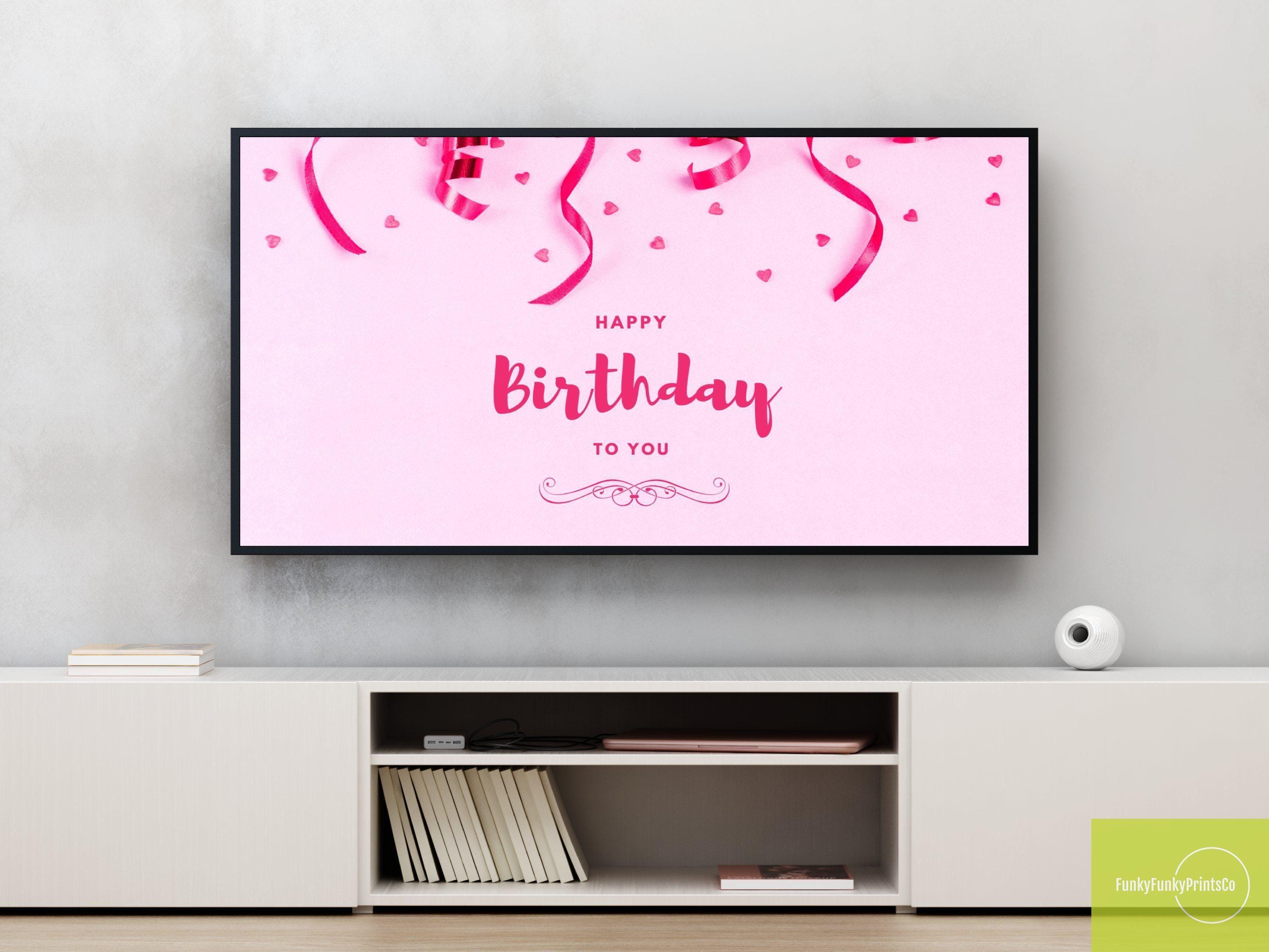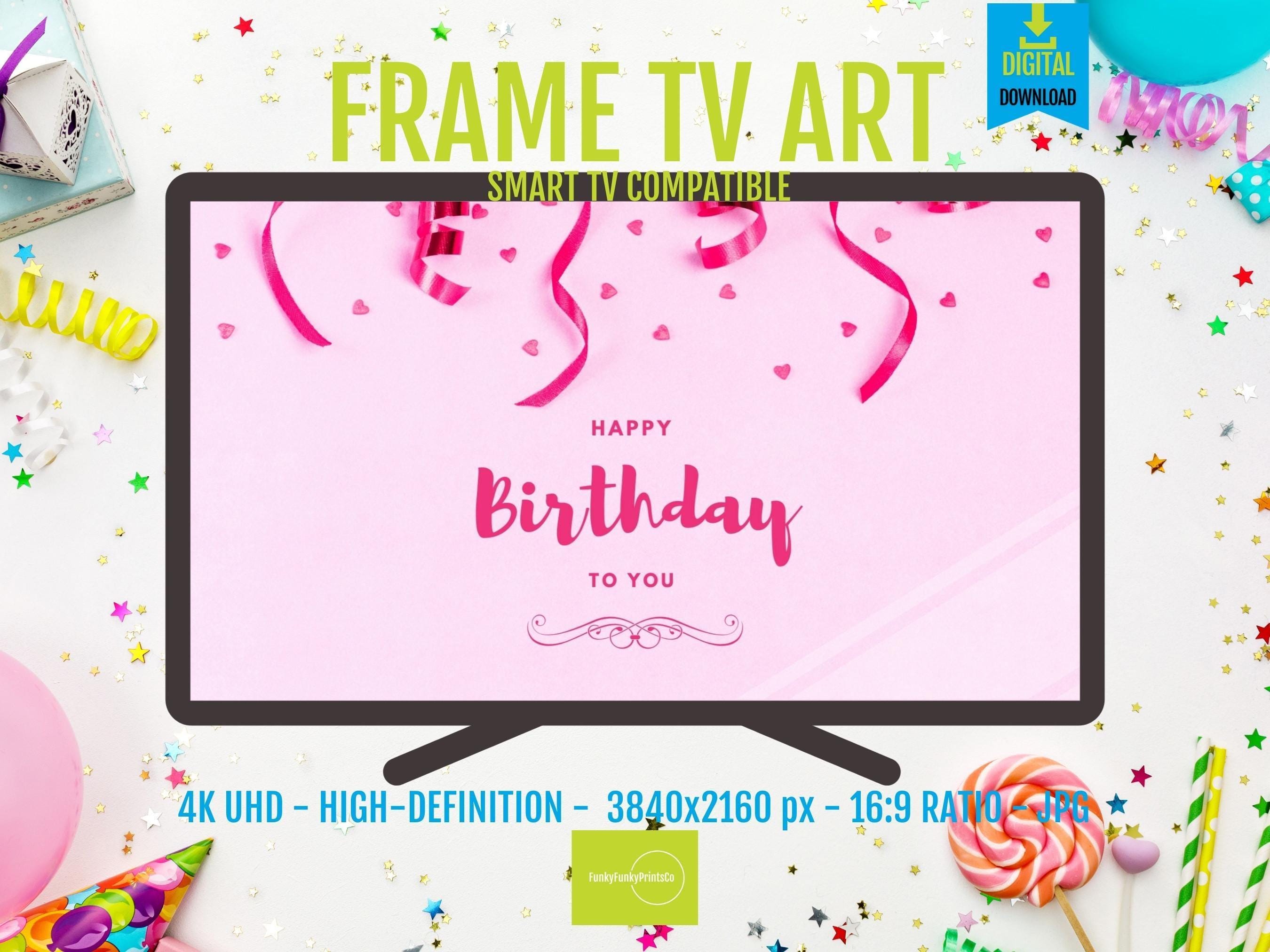 - ✅ Bright and festive Samsung Frame TV art featuring joyful pink streamers and happy birthday details