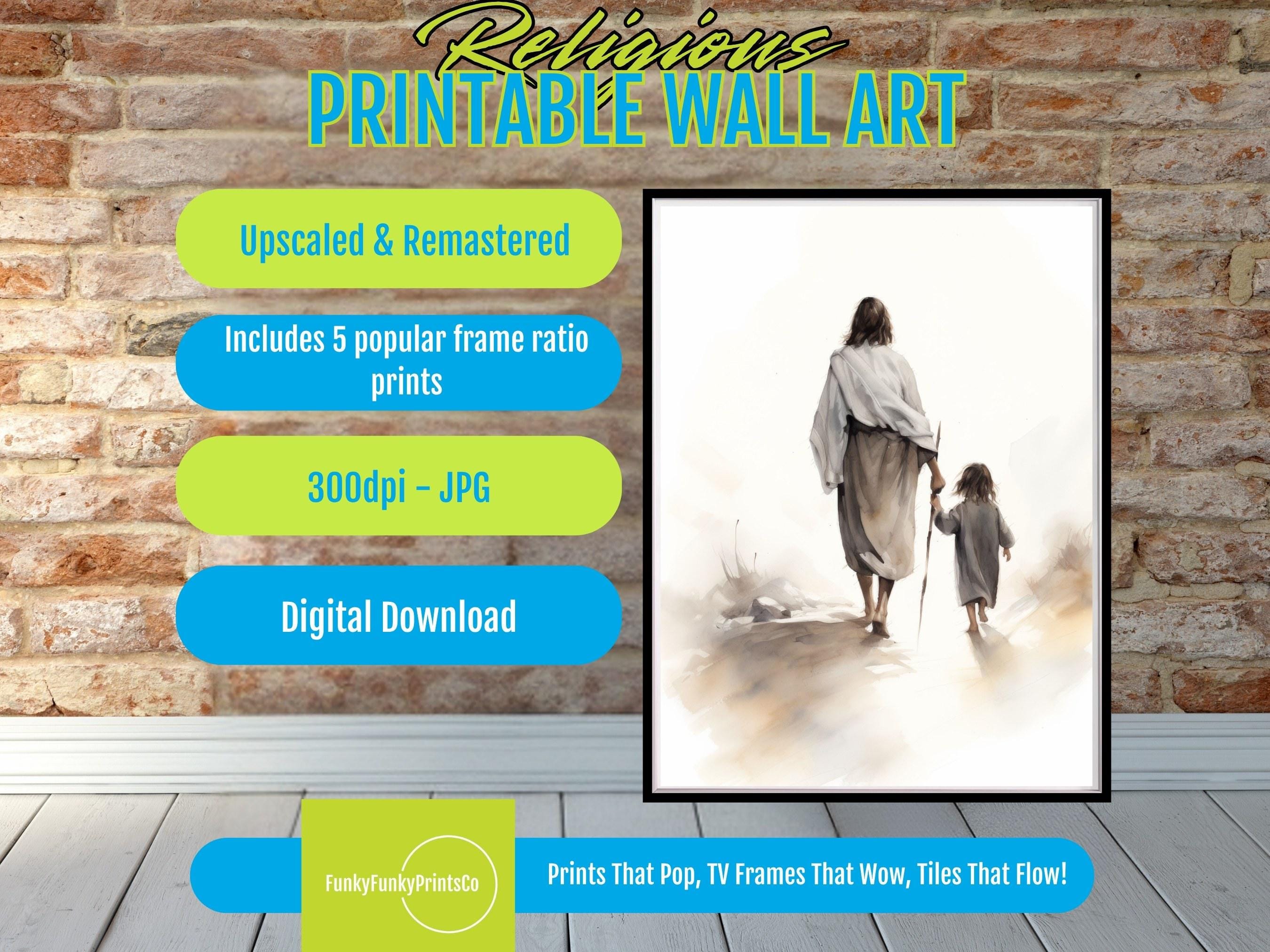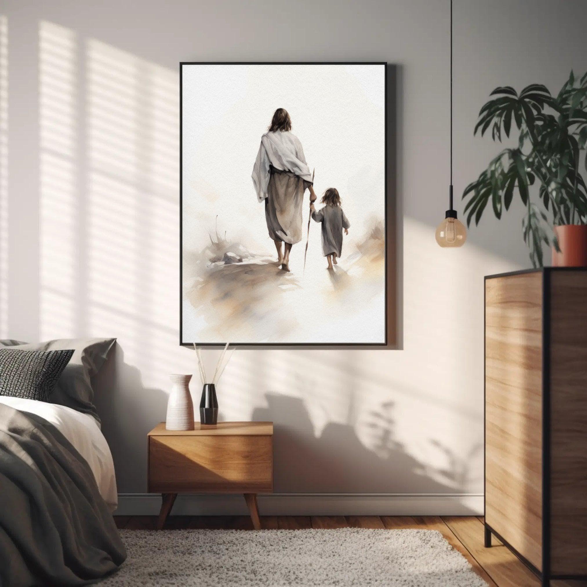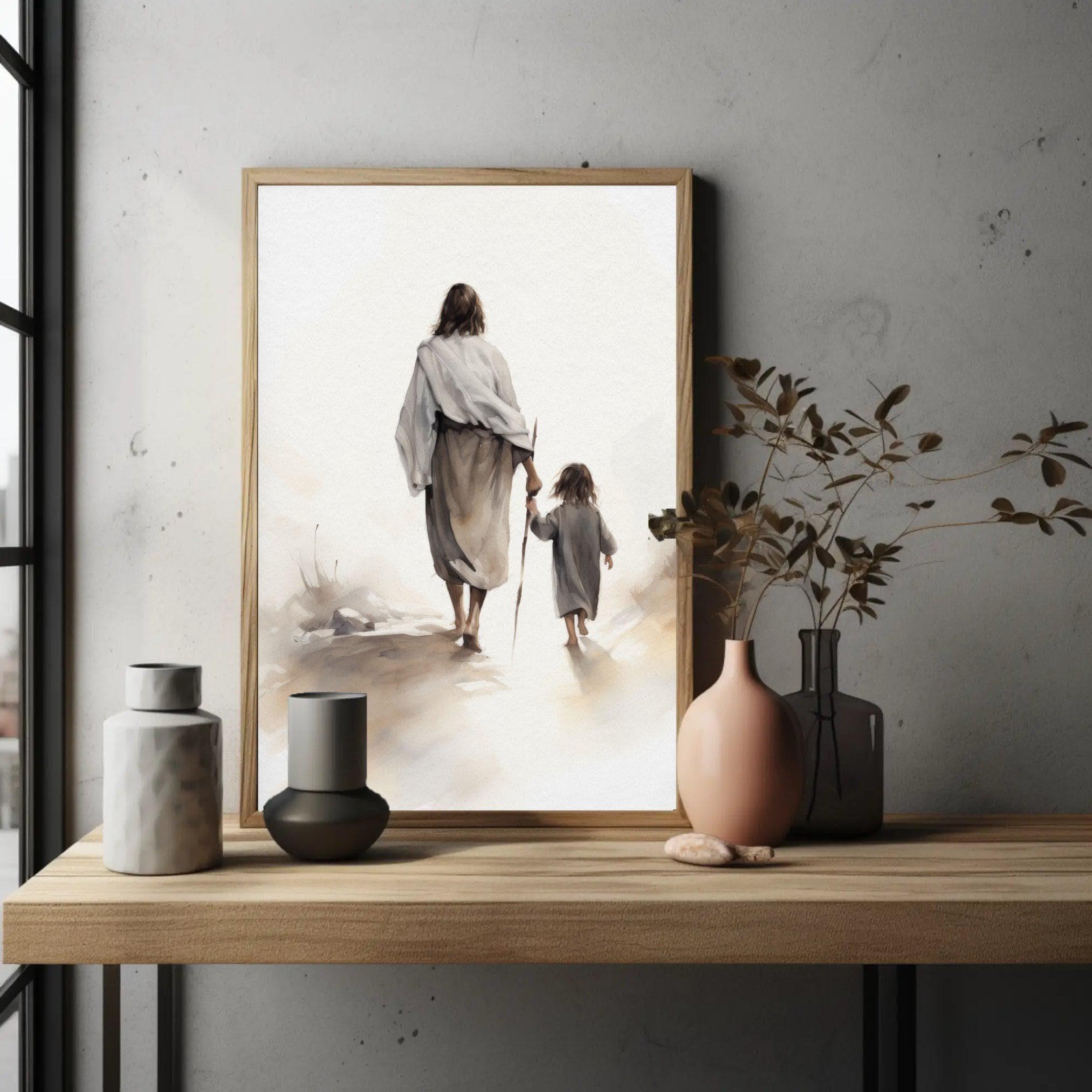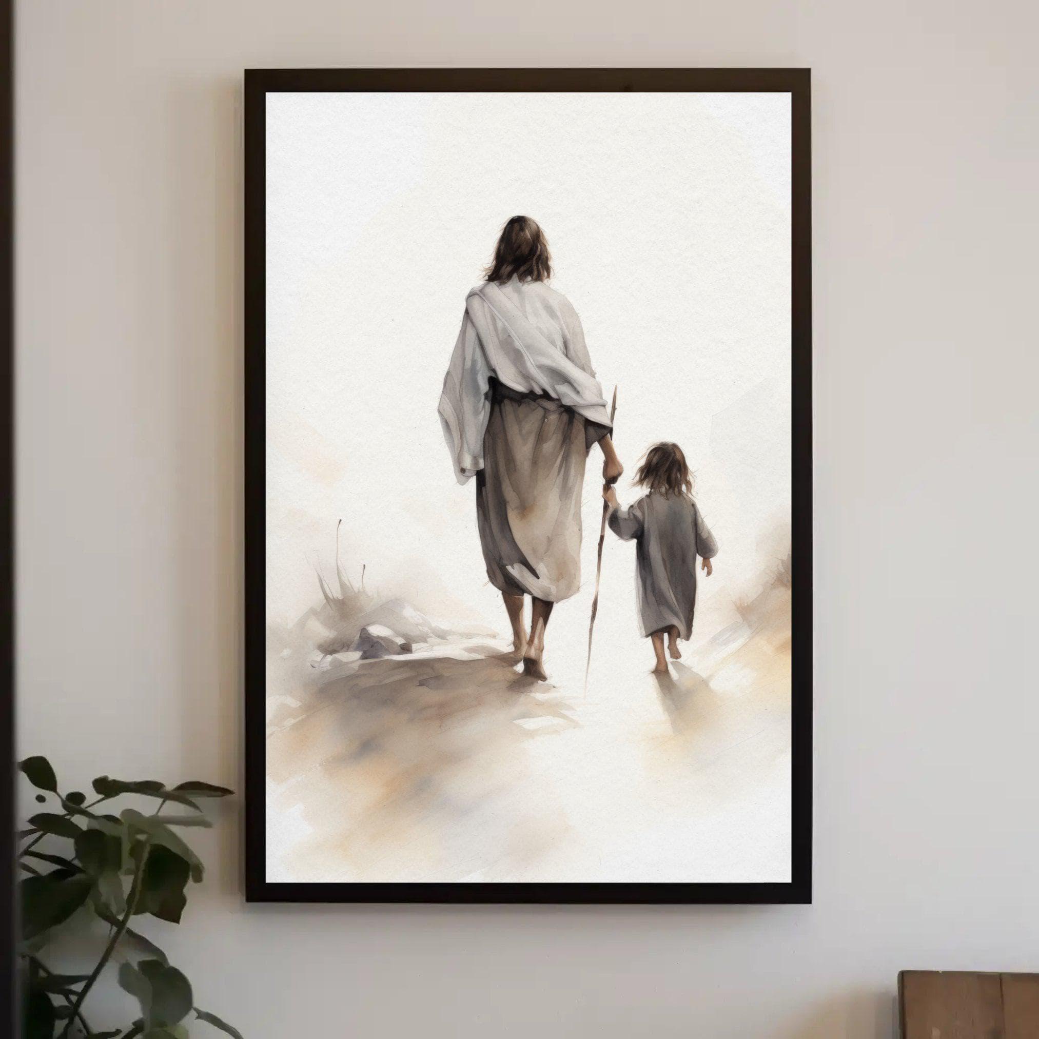 Discover a serene moment captured in this Christian wall decor that beautifully illustrates Jesus walking with a child, embodying inspirational faith and divine guidance. This digital download is a perfect addition to your spiritual home decor, offering warmth and reassurance through its heartfelt depiction. Crafted to inspire devotion, this religious art print brings a meaningful presence to any room.