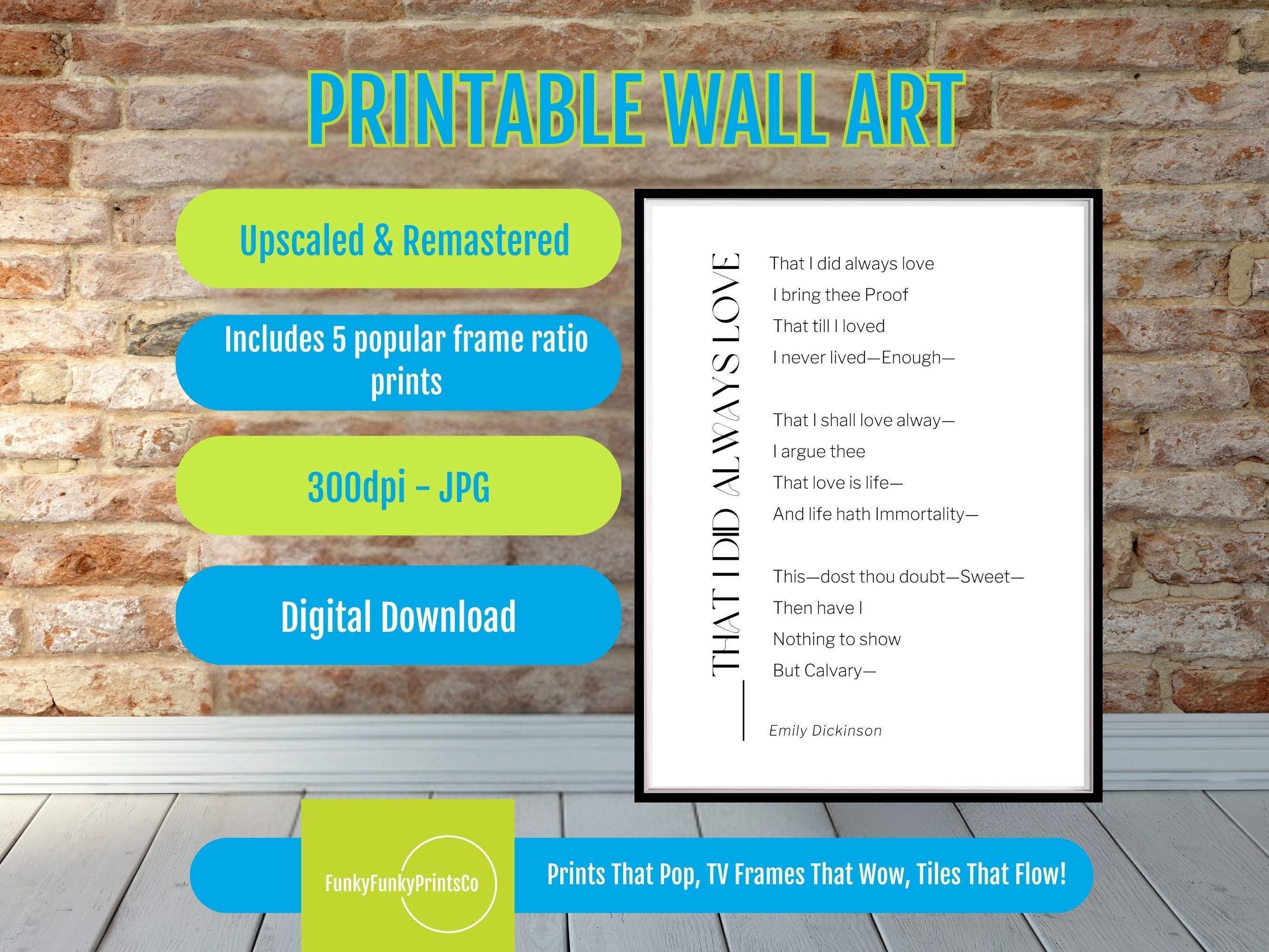 Immerse yourself in the timeless elegance of Emily Dickinson's poetry with this exquisite poetry wall art, designed as a digital download art piece that brings literary charm to any space. Inspired by Dickinson's heartfelt poem "That I Did Always Love," this printable wall art offers a minimalist yet meaningful addition to your home library art or study room decor. Perfect for poetry lovers and those seeking a modern wall accent, it effortlessly combines classic words with contemporary style.