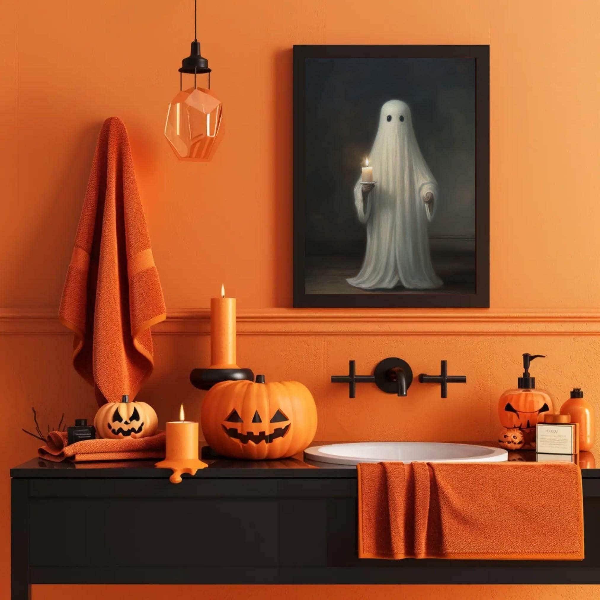 As autumn leaves gently fall, this candlelit vintage ghost art casts a warm, eerie glow that perfectly embodies cozy autumn vibes. Designed to enchant your space, this printable ghost art brings a touch of haunted house magic to your seasonal decor. Whether you're seeking Halloween ghost wall charm or timeless spooky decor, this piece adds mysterious ambiance to any room.