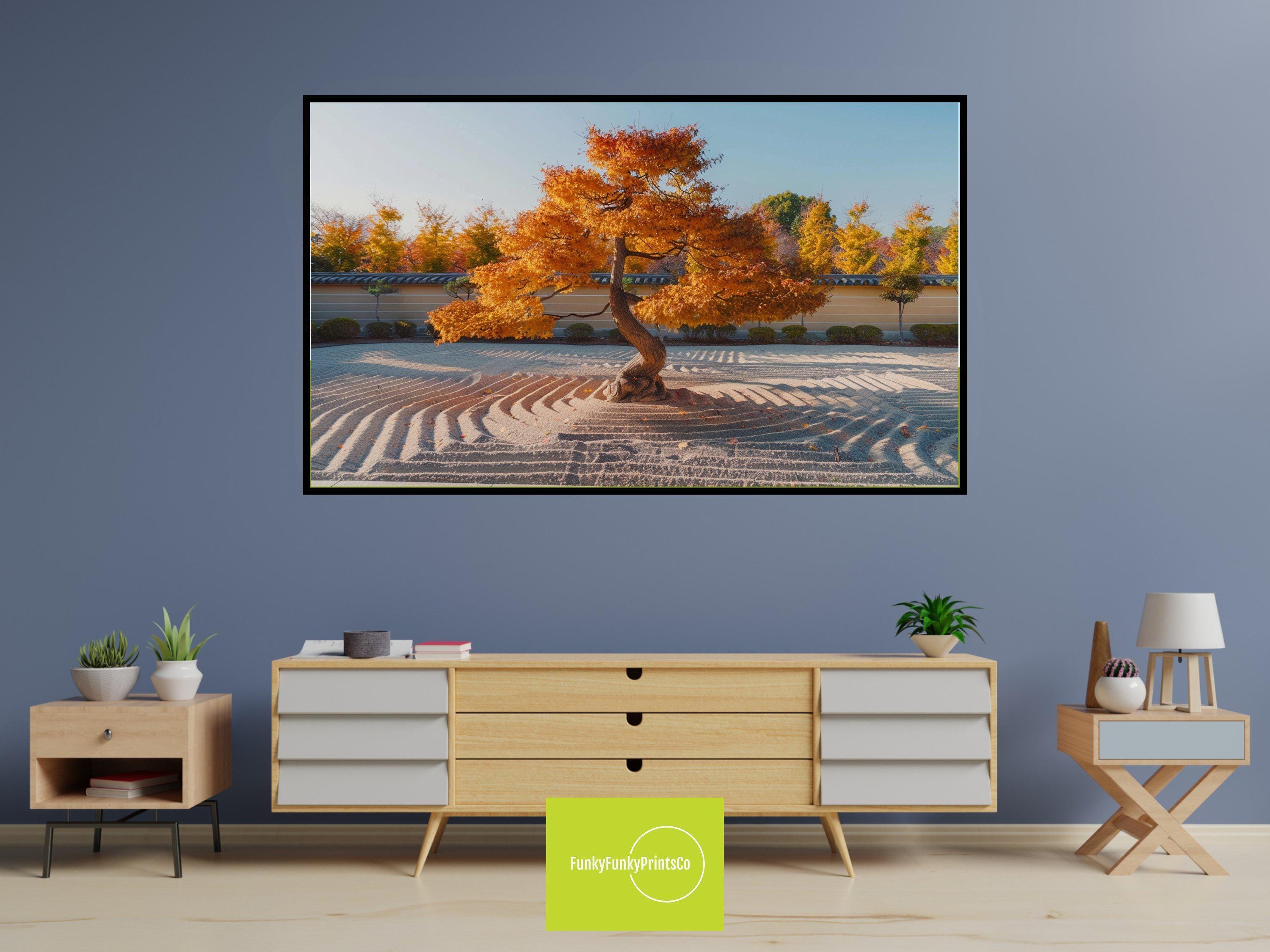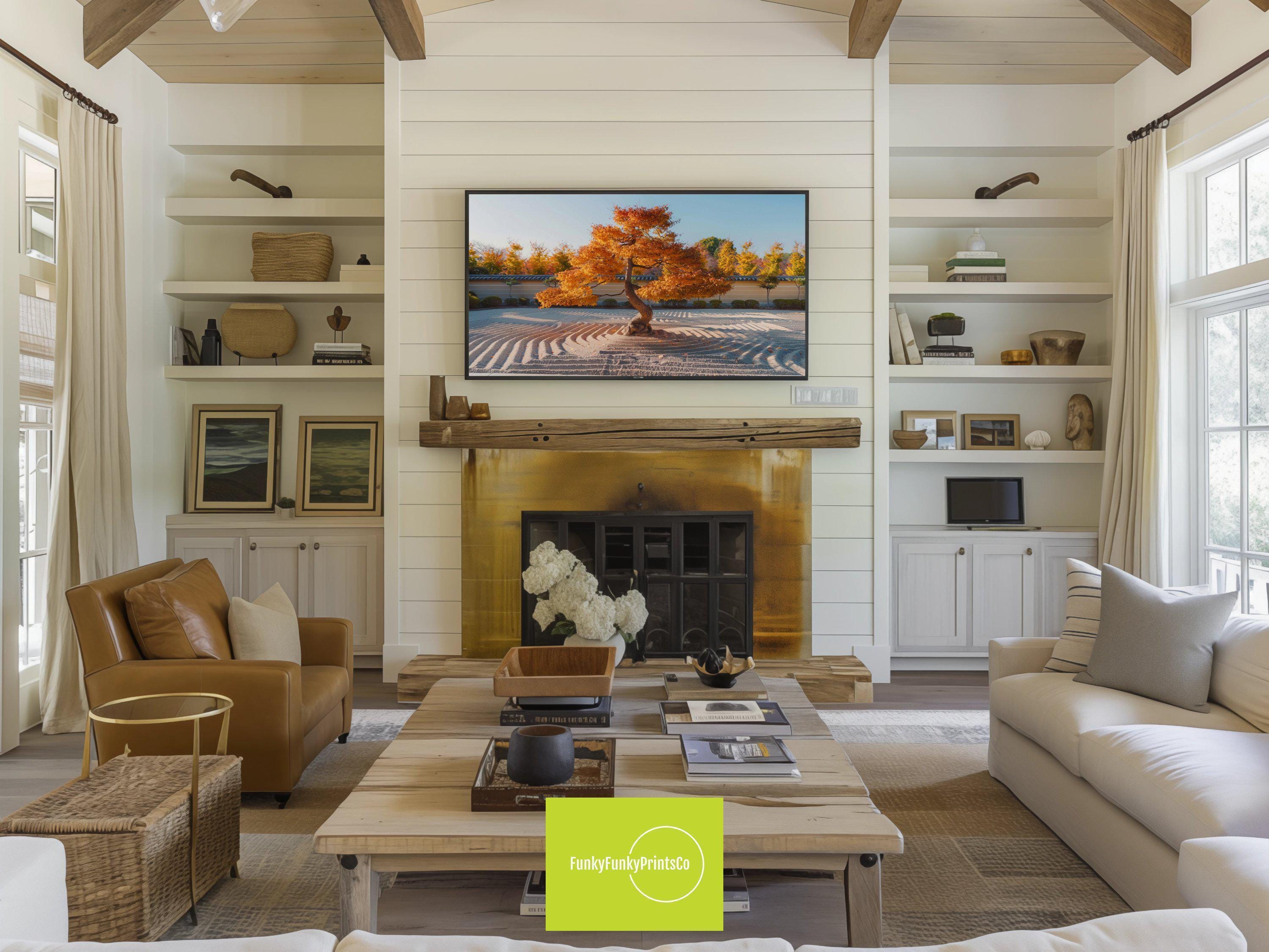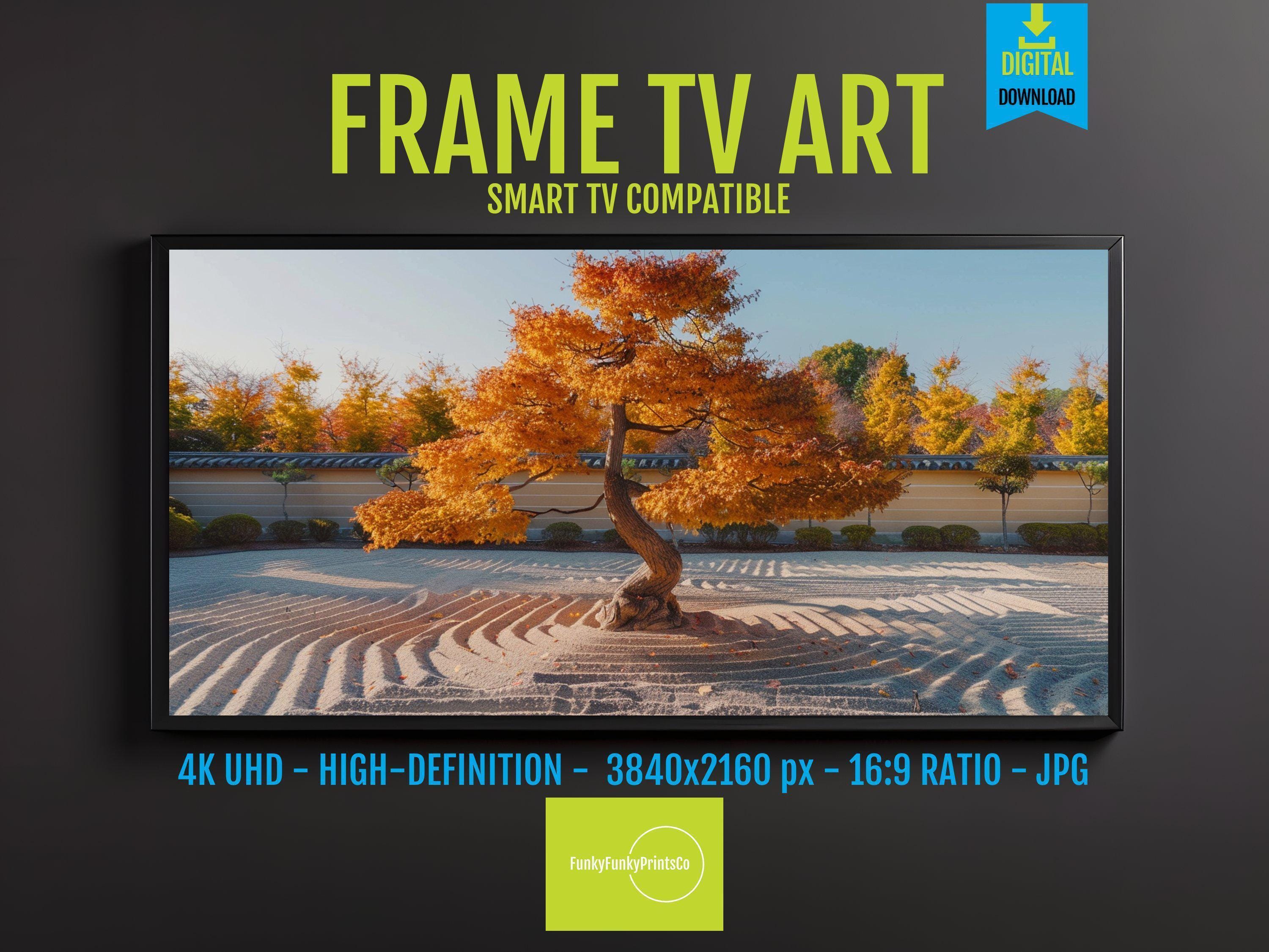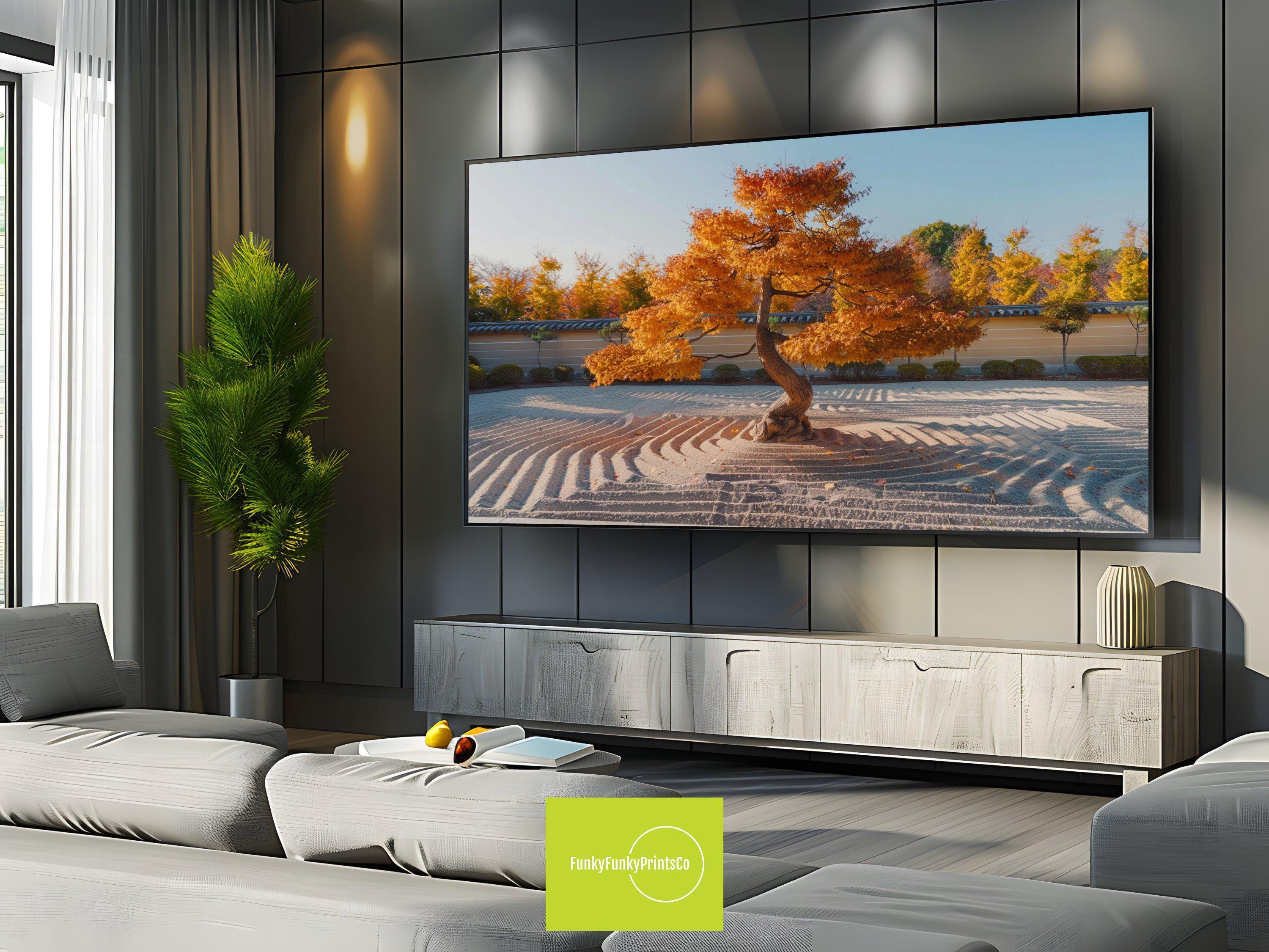 Transform your Samsung Frame TV into a serene autumn retreat with this calming autumn decor digital download. Featuring a peaceful Japanese zen garden and vibrant autumn trees, this 4K UHD TV art creates a tranquil TV screen that brings fall nature display beauty right into your living room or office. Designed to evoke relaxation and harmony, itโs the perfect way to refresh your space with nature-inspired art.
