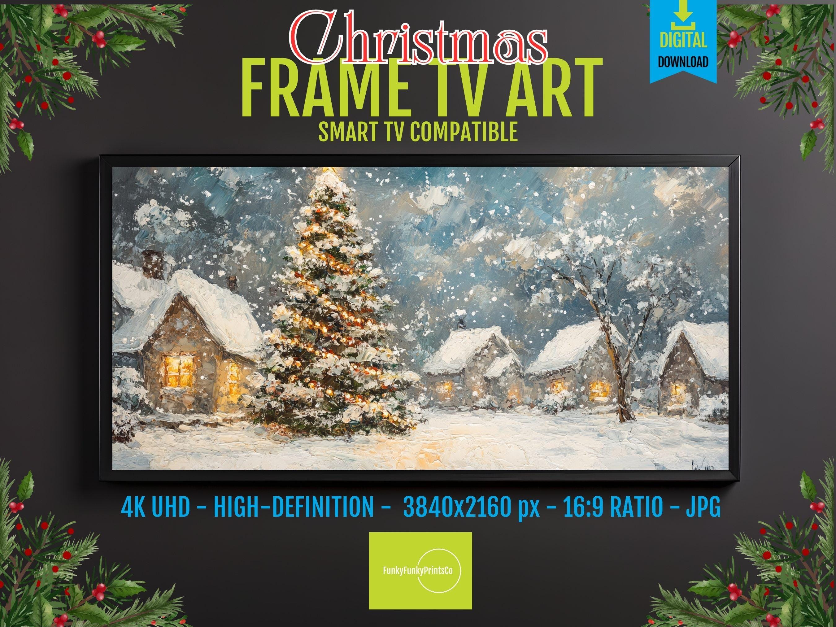 Transform your living space with this glowing tree art designed specifically for Samsung Frame TVs, bringing a warm winter ambiance right into your cozy living room. This festive holiday digital artwork captures the magic of the season with vibrant 4K HD quality, perfectly optimized for a 16:9 aspect ratio. Whether you're looking to enhance your holiday decor or add a rustic holiday charm, this smart TV screensaver offers an elegant and inviting seasonal display.