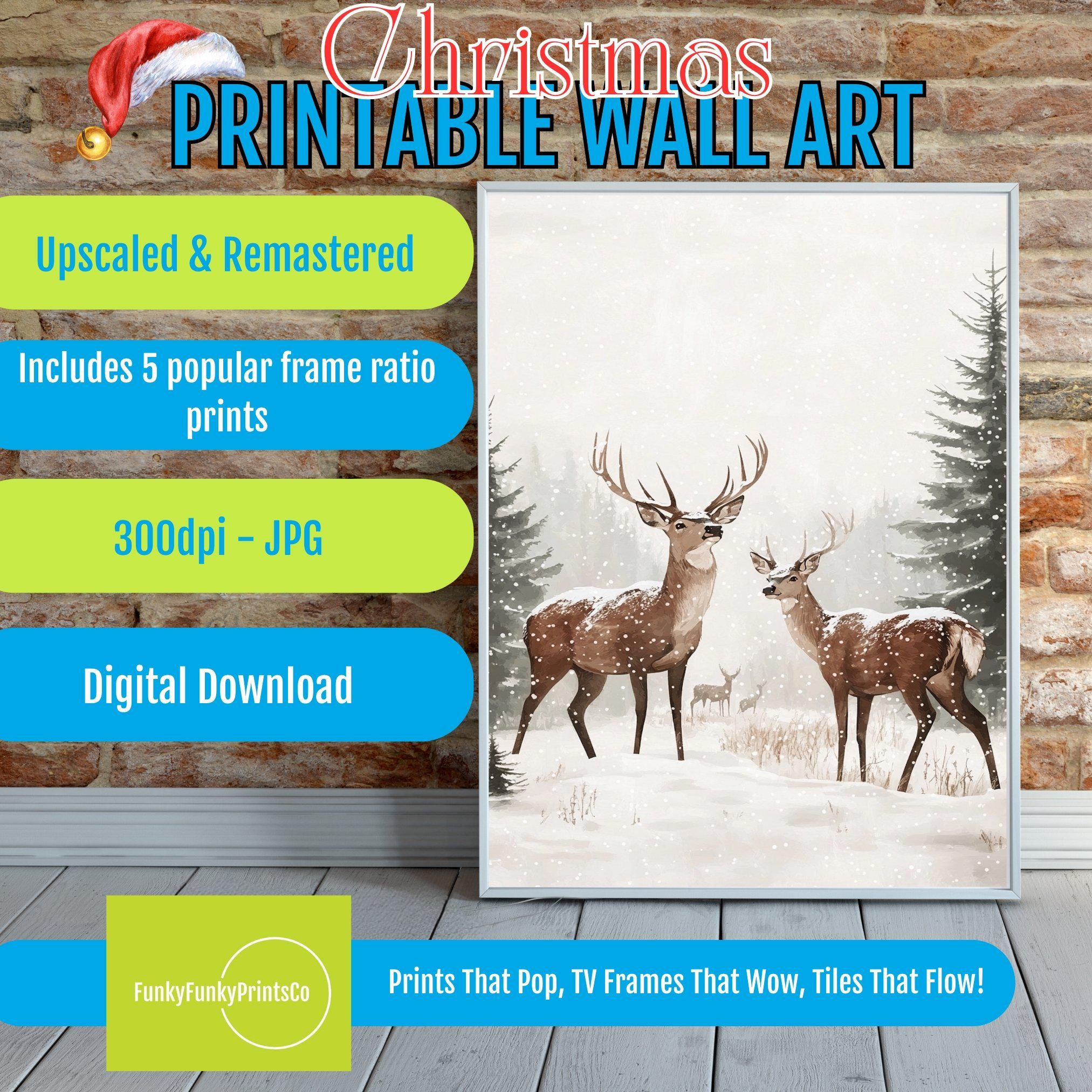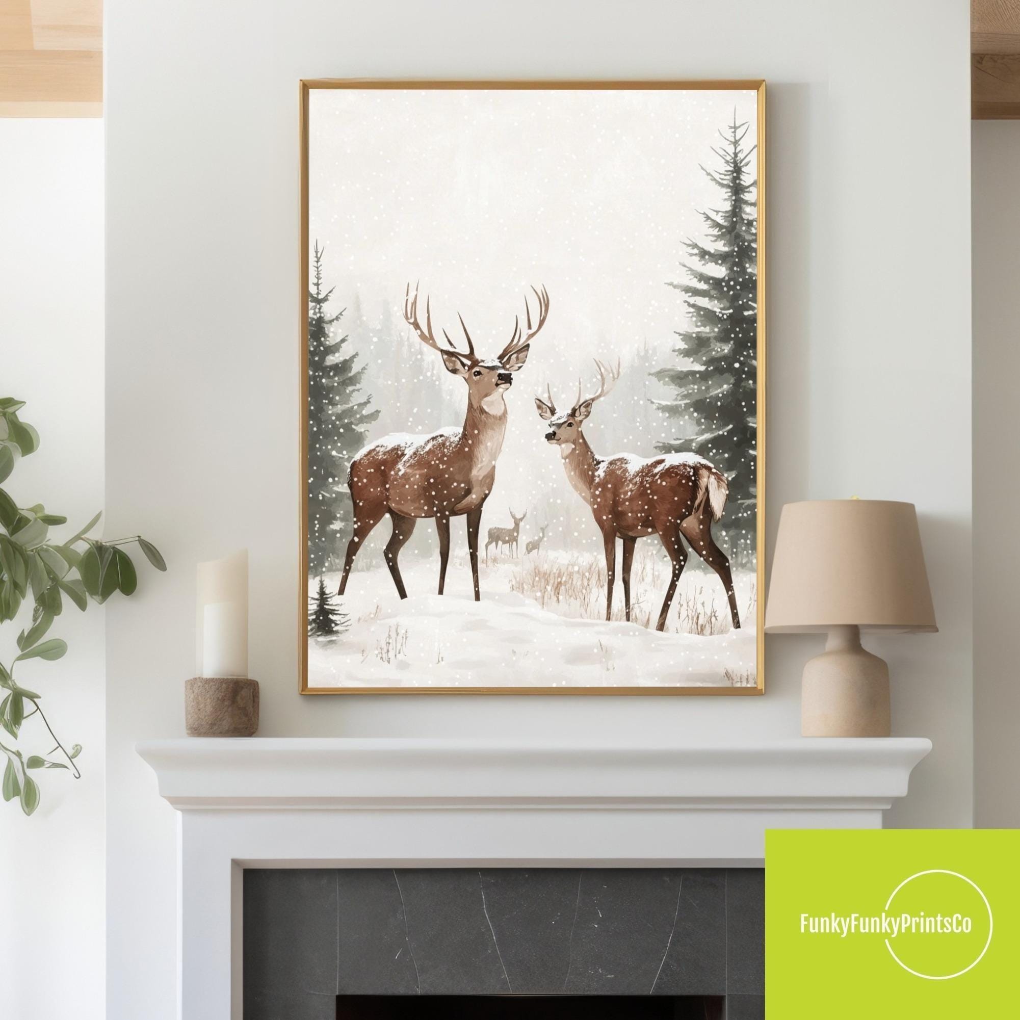 Transform your space with this vintage deer print in a snowy field, perfect for nature and animal lovers and rustic home decor enthusiasts. This printable wall art captures the serene beauty of winter wildlife, making it an ideal gift or holiday decoration. Download this scenic winter print today and bring a touch of the forest into your home with this charming digital artwork.