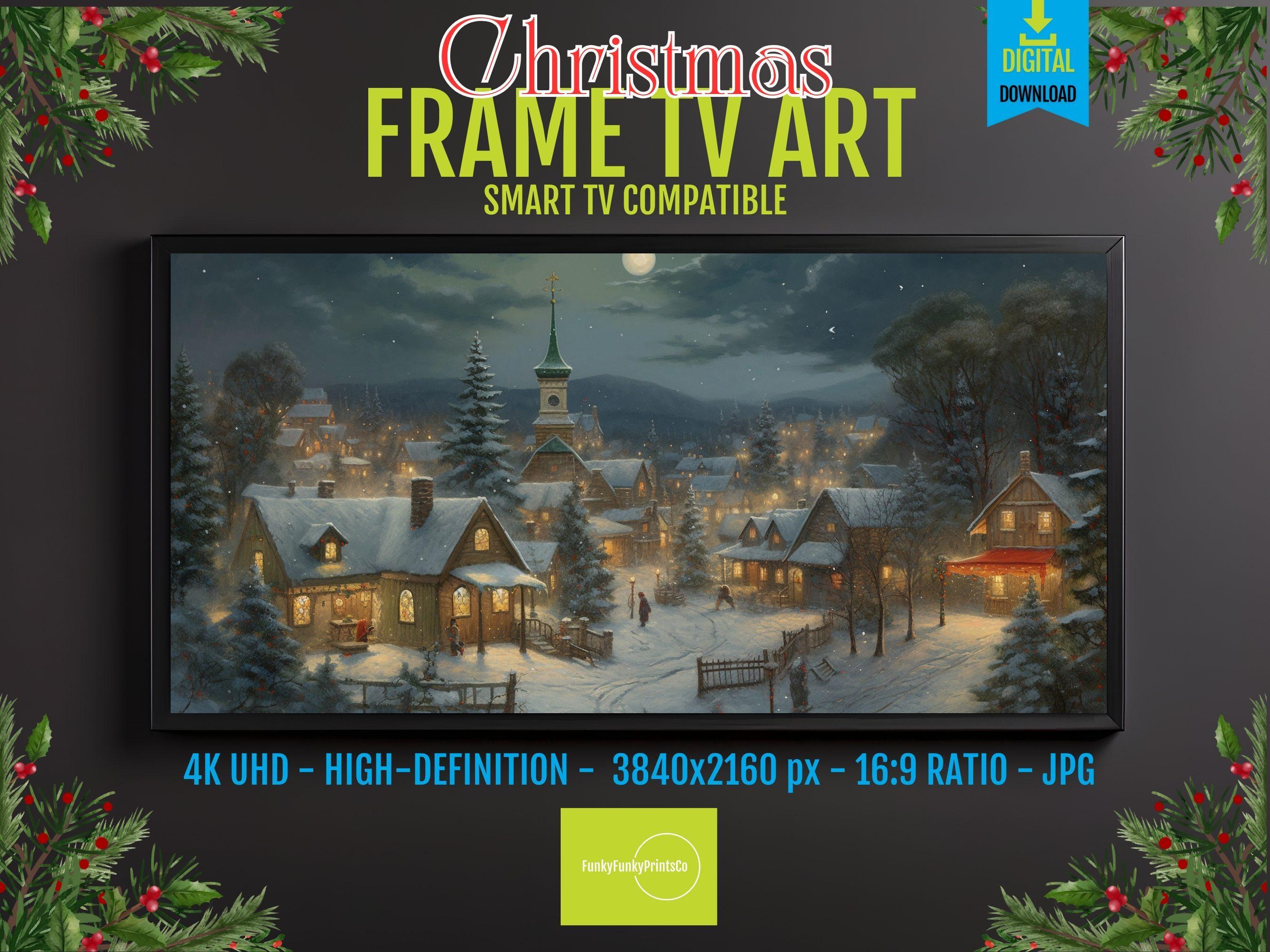 Step into a cozy snowy village where twinkling lights and festive cheer come alive on your Frame TV Christmas display. This 4K snowy holiday screensaver transforms your Samsung Frame decor into a magical winter wonderland, perfect for evoking nostalgic holiday warmth. Designed with vivid colors and intricate details, it brings a charming holiday home decor vibe right into your living space.