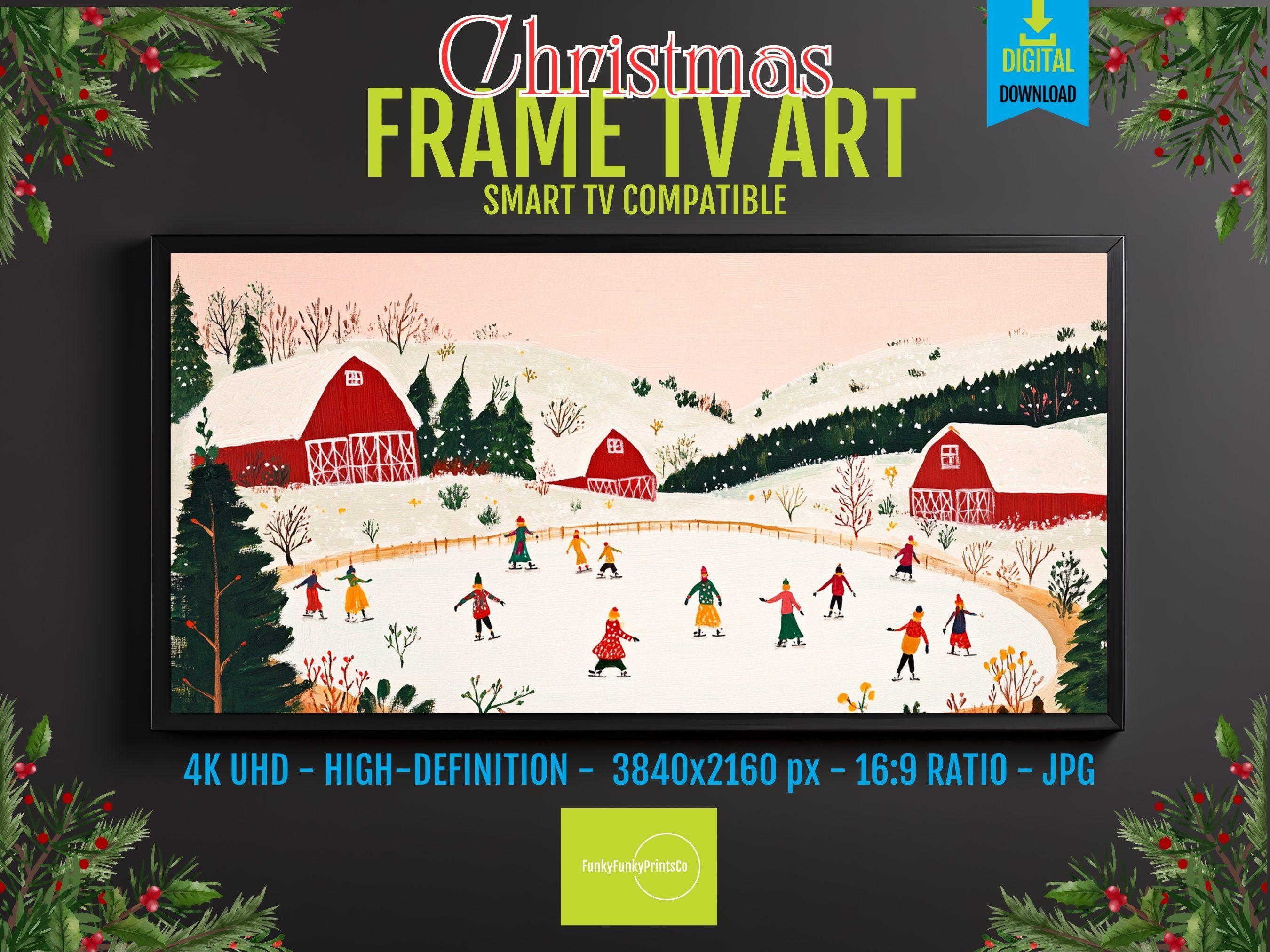 Step into a serene winter wonderland where joyful ice skaters glide gracefully across a frozen pond, framed by charming rustic barns and rolling hills. This festive winter scene art, designed specifically for Samsung Frame TV, captures the cozy spirit of the holiday season with stunning 4K HD clarity. Perfect for anyone seeking nostalgic winter ice skating vibes and a cheerful country-inspired holiday display.