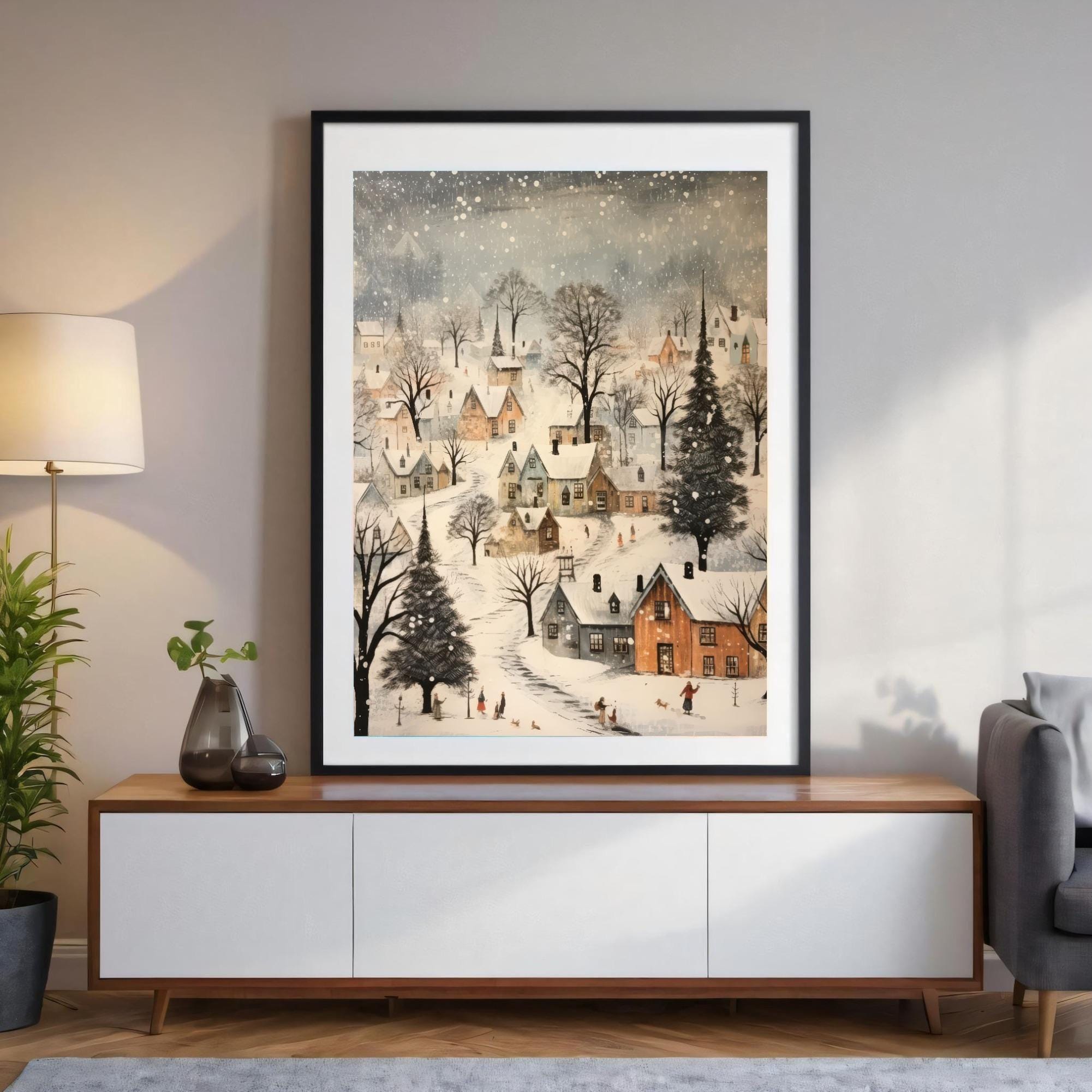 Step into a nostalgic winter wonderland with this charming vintage Christmas village print, where retro holiday wall decor meets warm seasonal colors that evoke cozy festive memories. This printable retro art captures the spirit of holiday cheer decor, perfect for adding a unique, quirky vintage style to your seasonal home ambiance. Each piece is thoughtfully designed to bring warmth and joy to your holiday walls, making every celebration feel extra special.