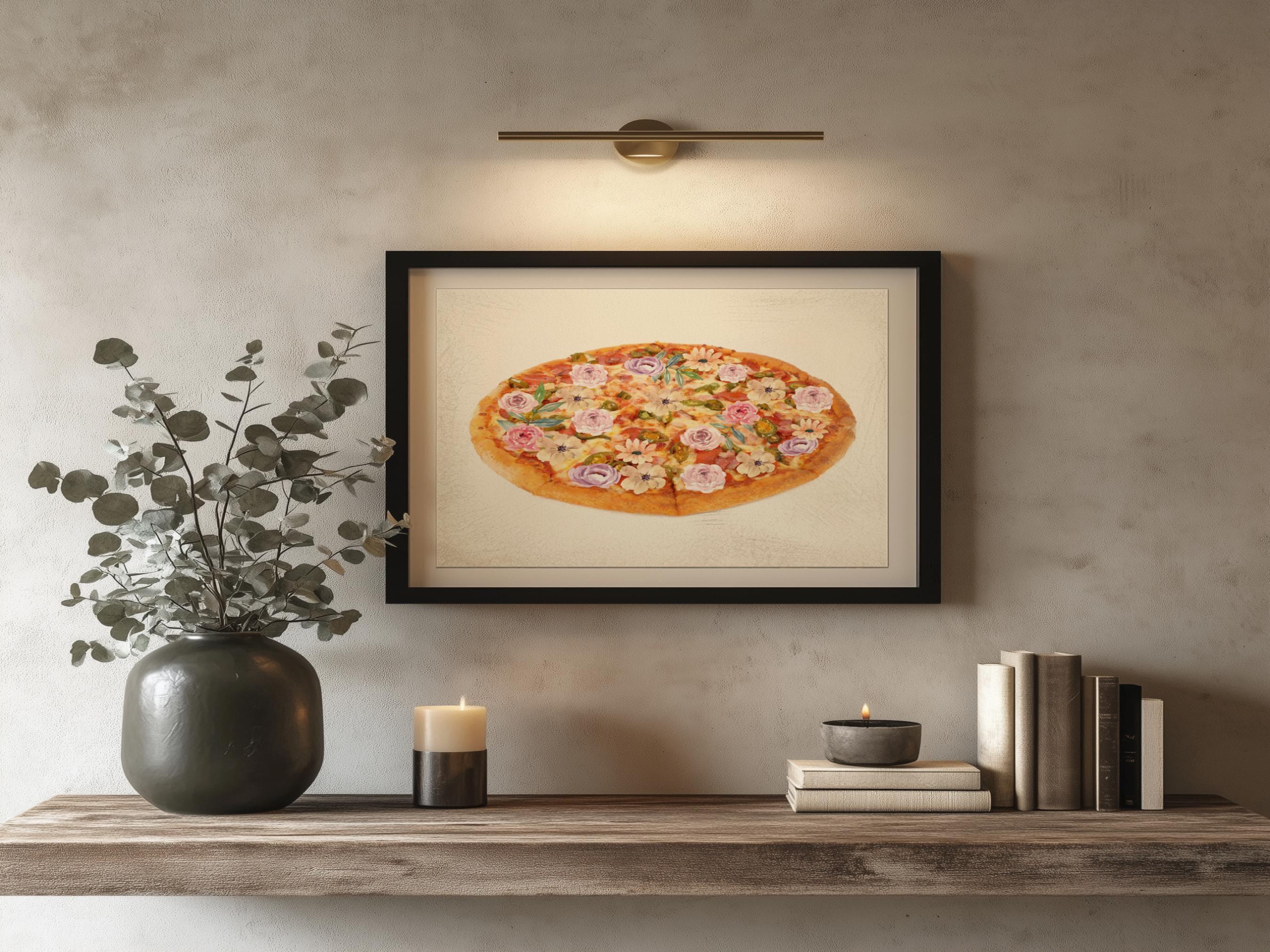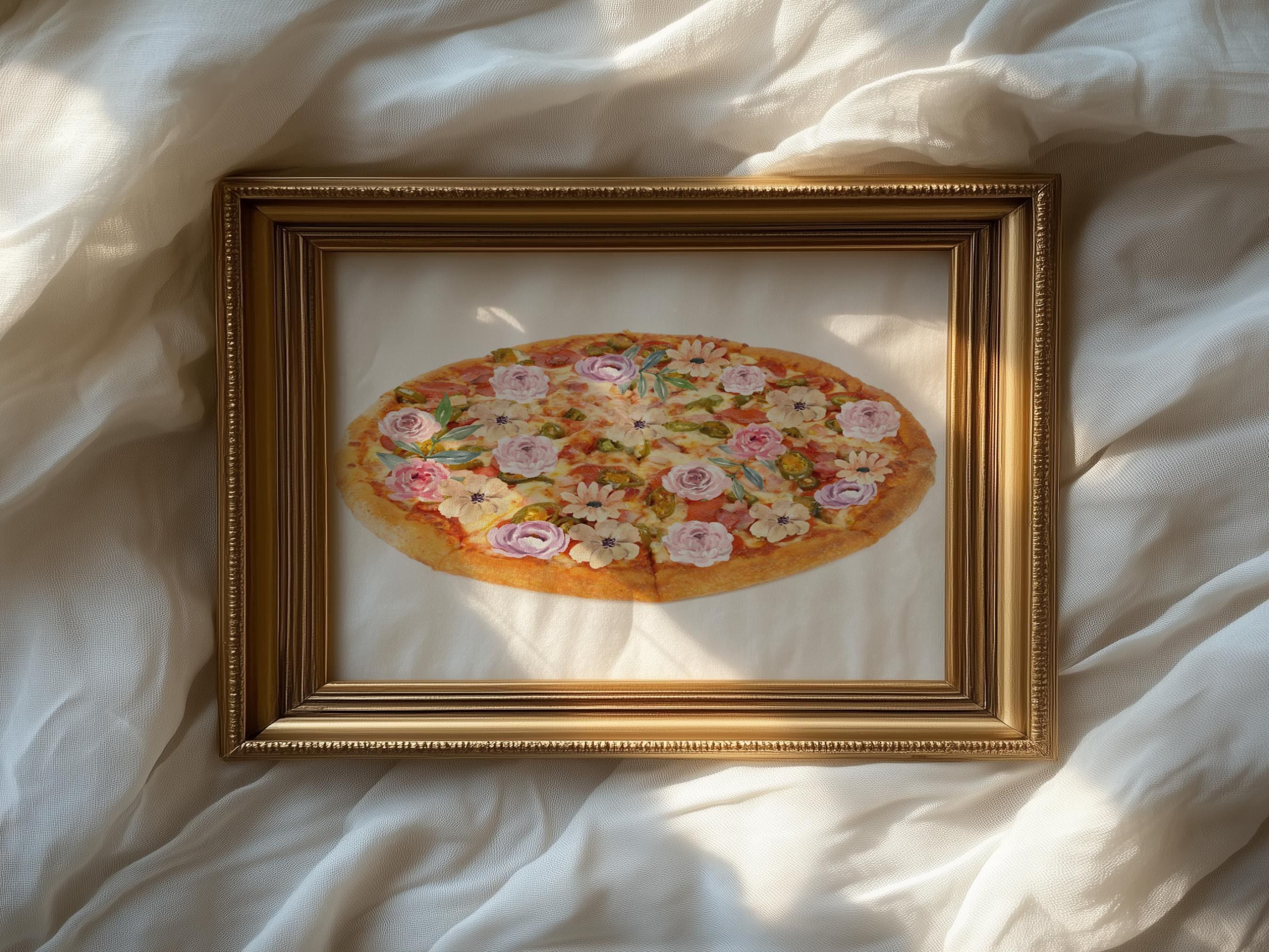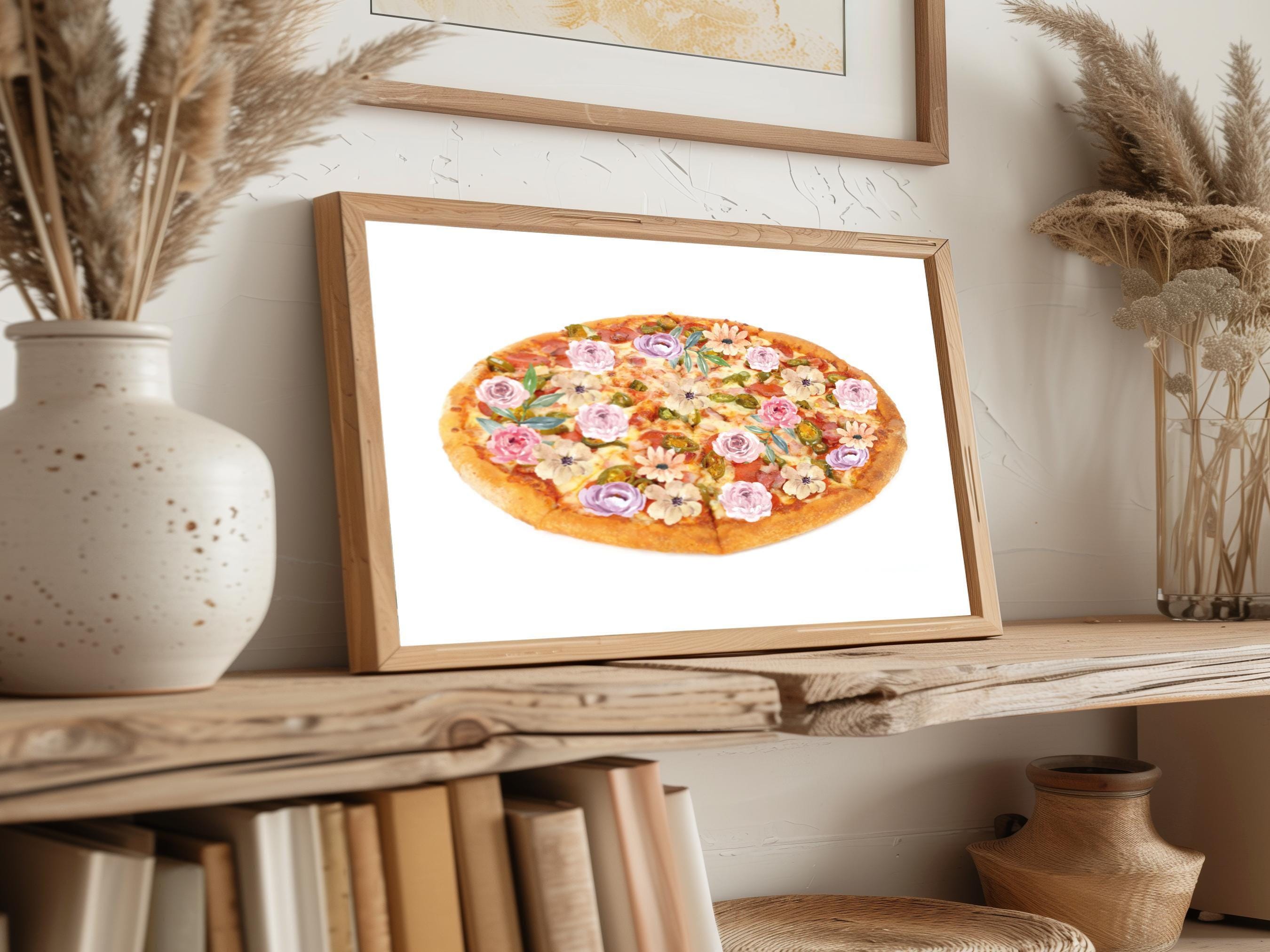 Brighten your kitchen or dining area with this whimsical floral pizza wall art, a delightful fusion of fun food wall art and quirky food lover decor. Inspired by playful watercolor techniques, this digital pizza print features a vibrant kitchen art style, blending bright colorful art with a delicate floral pattern print to create unique food artwork. Perfect as eclectic home decor, this print brings a joyful centerpiece to your kitchen or dining space and makes a quirky pizza gift for anyone who loves food.