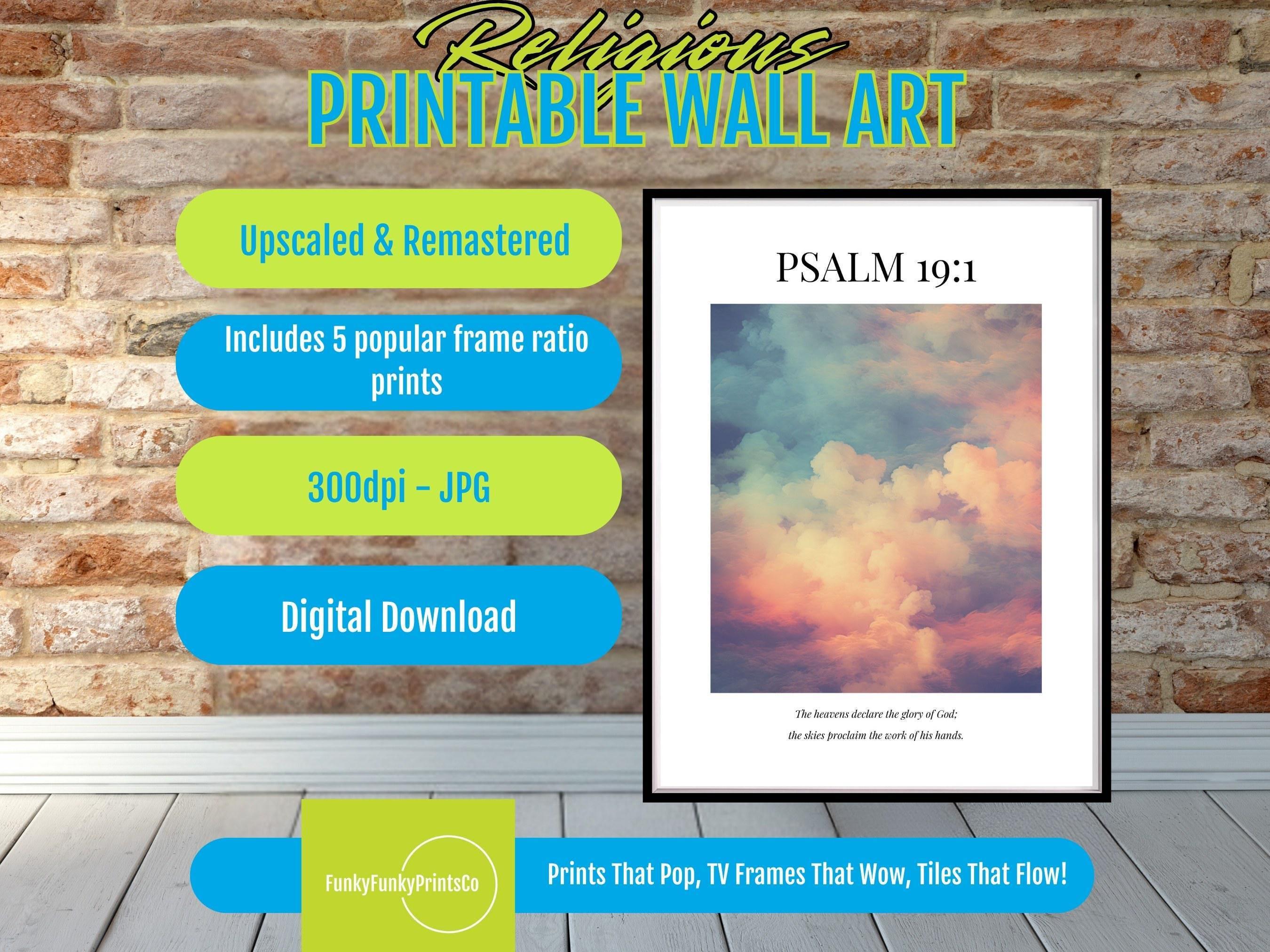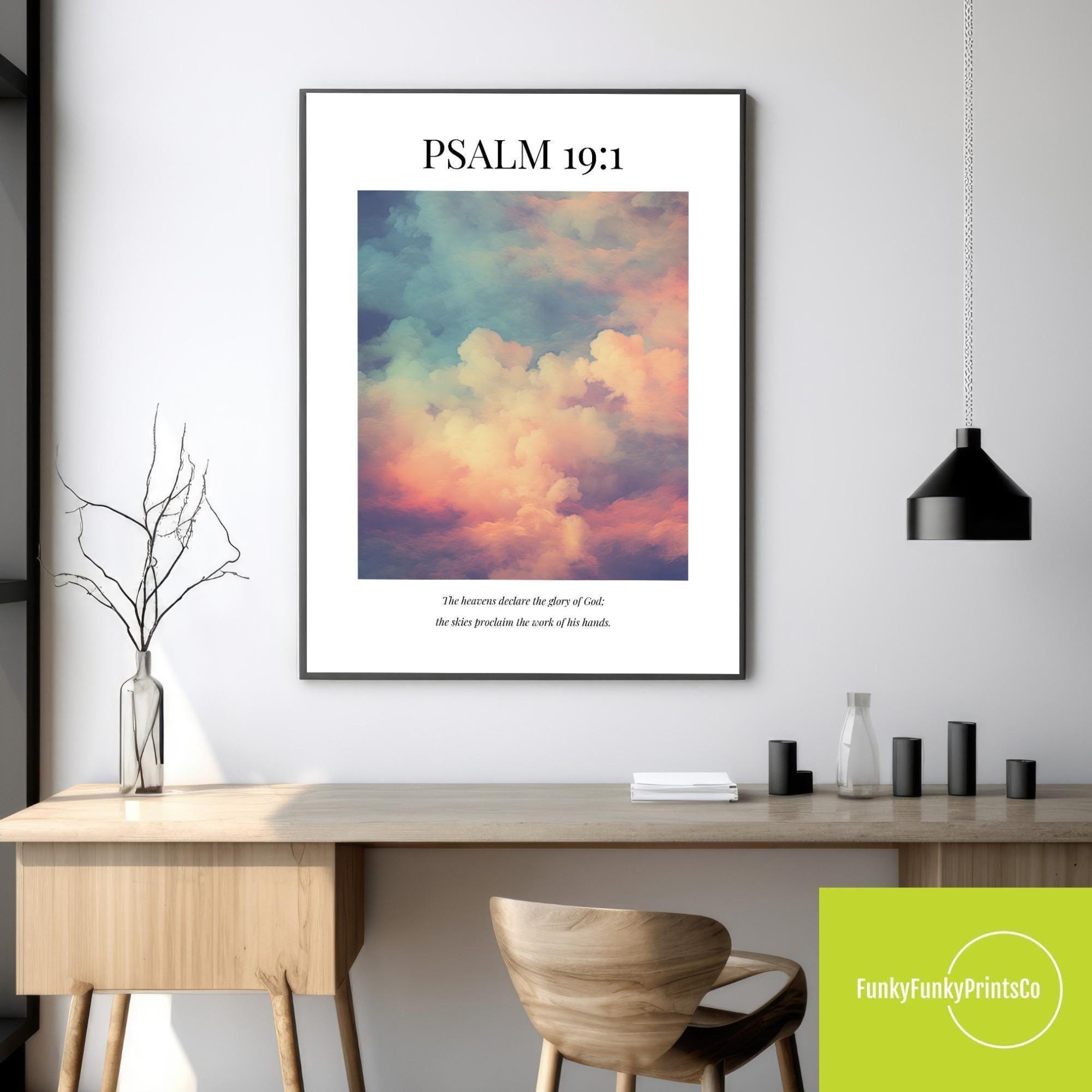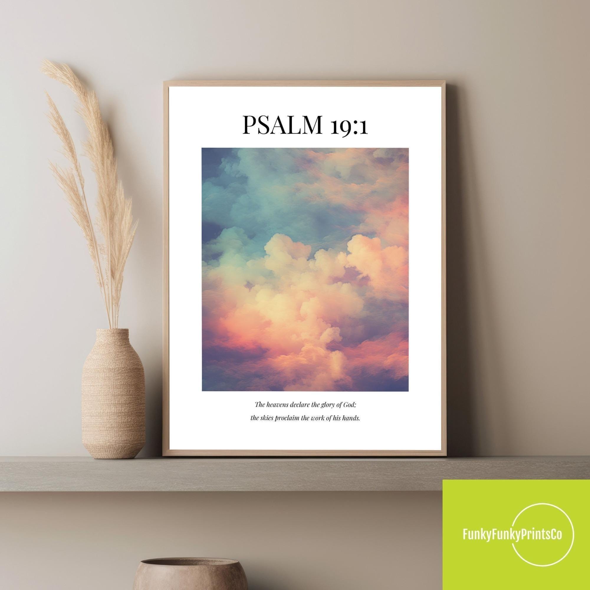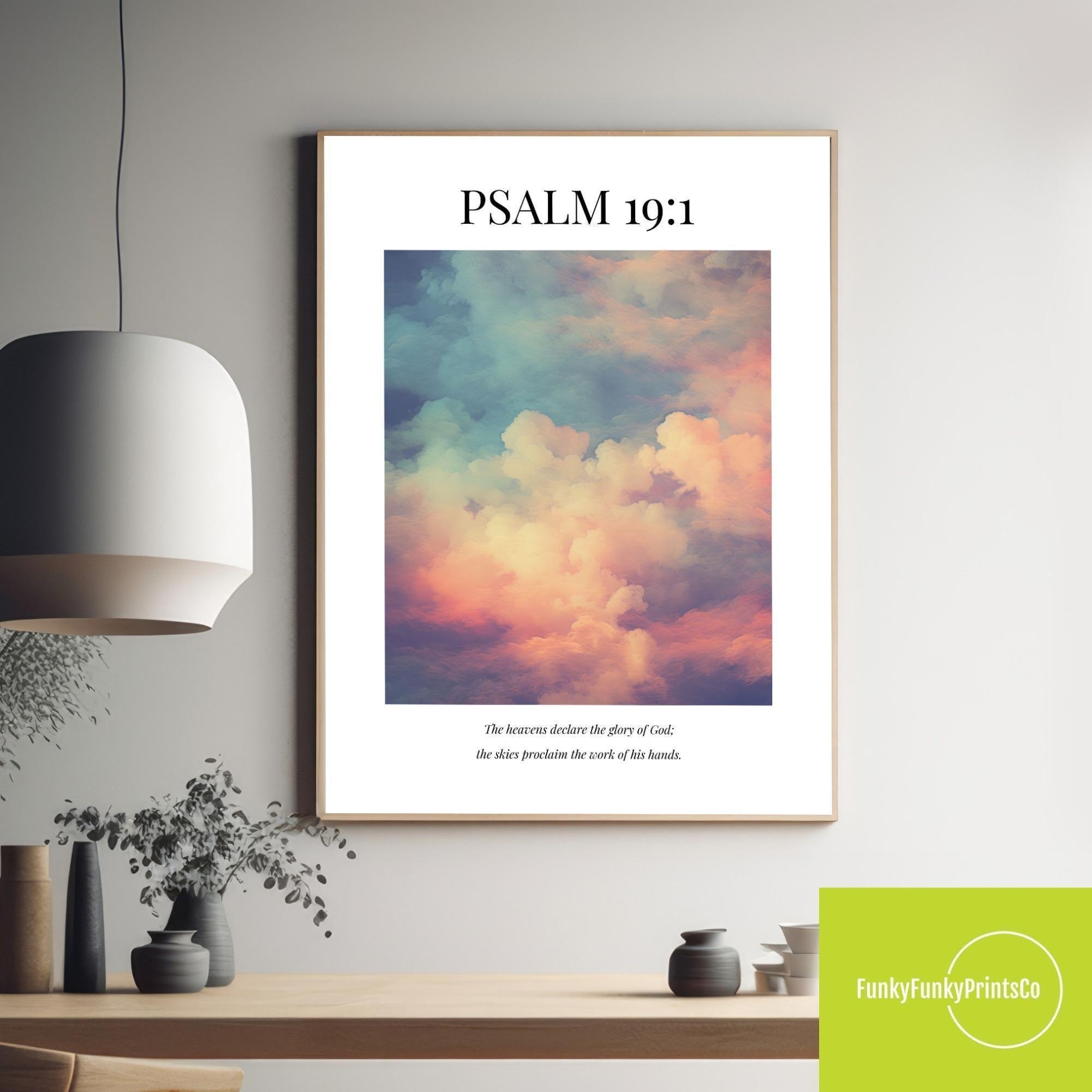 Experience the serene beauty of our Psalm 19:1 print, where faith cloud design meets inspirational art to create a peaceful sanctuary in your home. This printable faith art captures the essence of scripture wall art with a calming cloudscape, inviting moments of reflection and spiritual upliftment. Perfect for those seeking religious home decor that blends meaningful scripture with elegant digital bible print aesthetics.