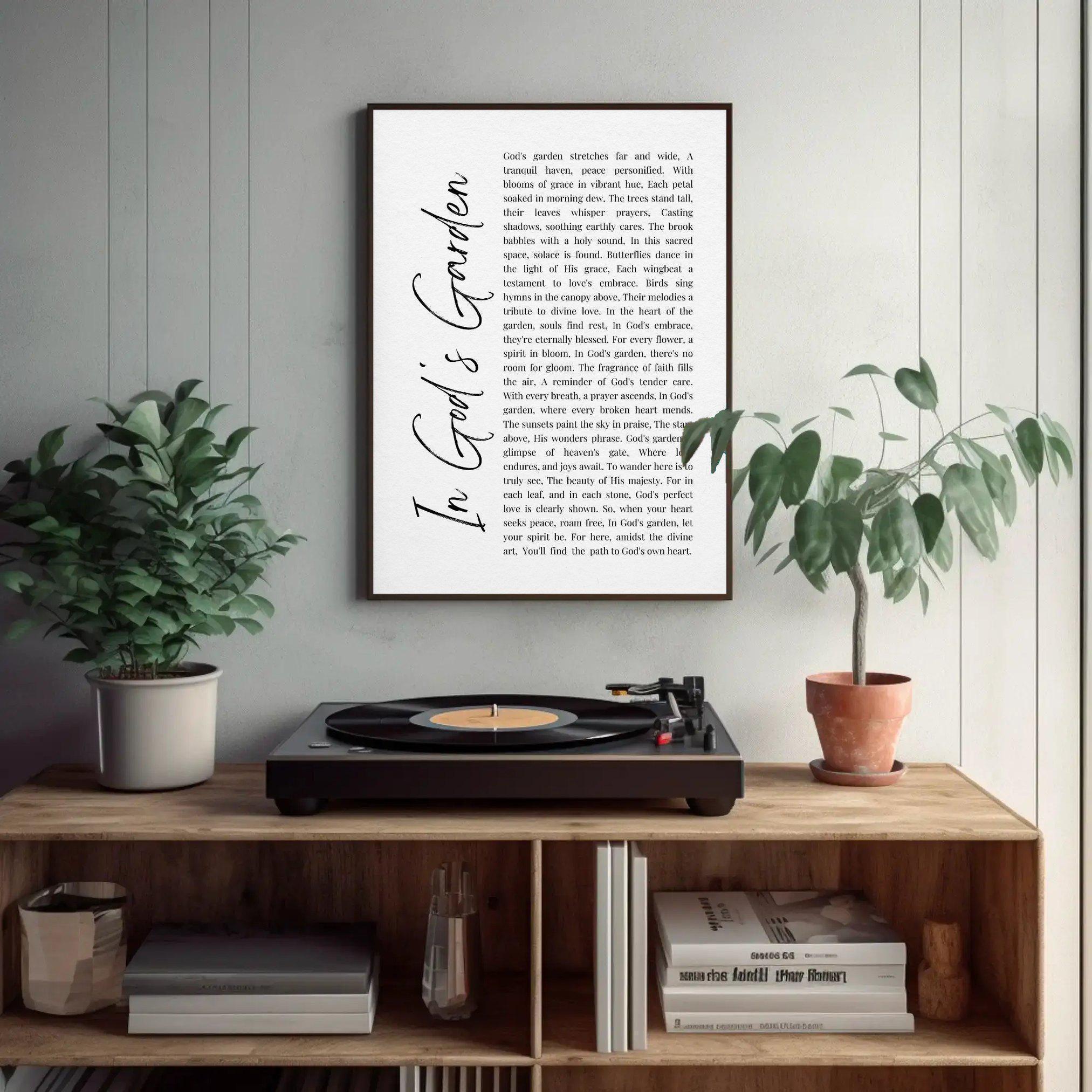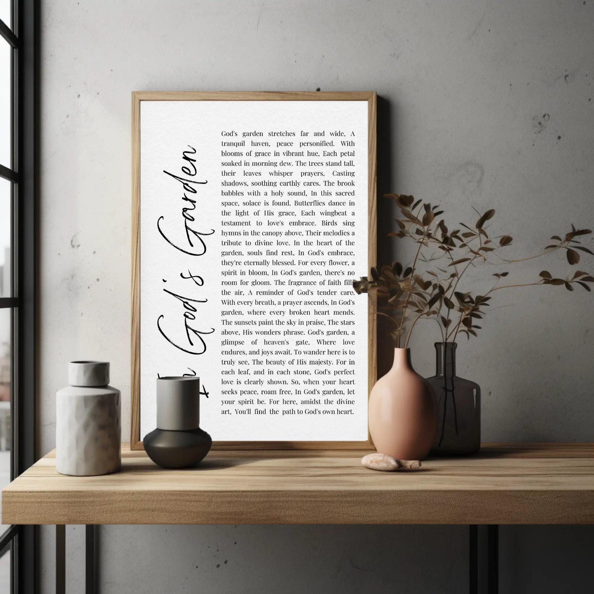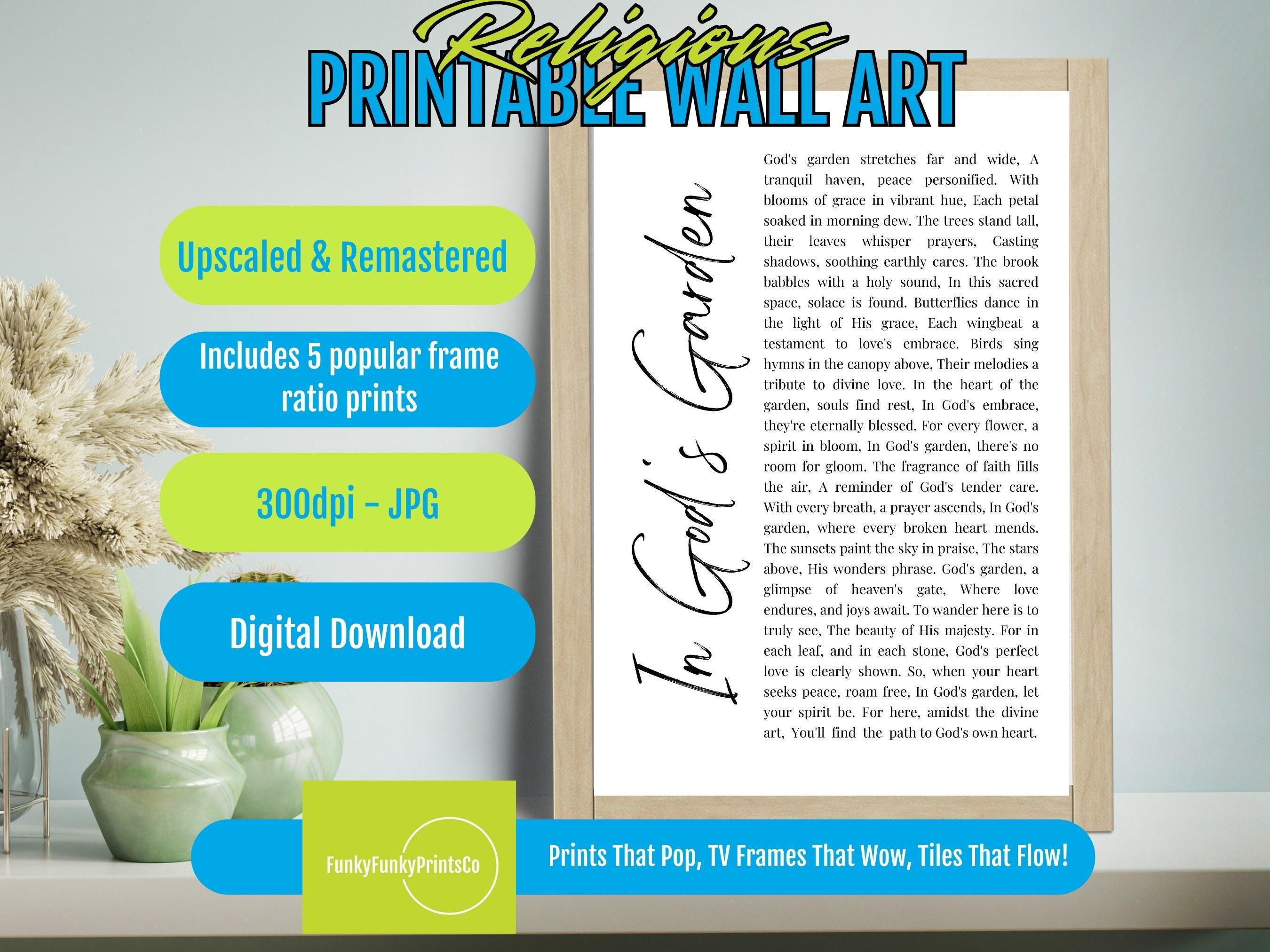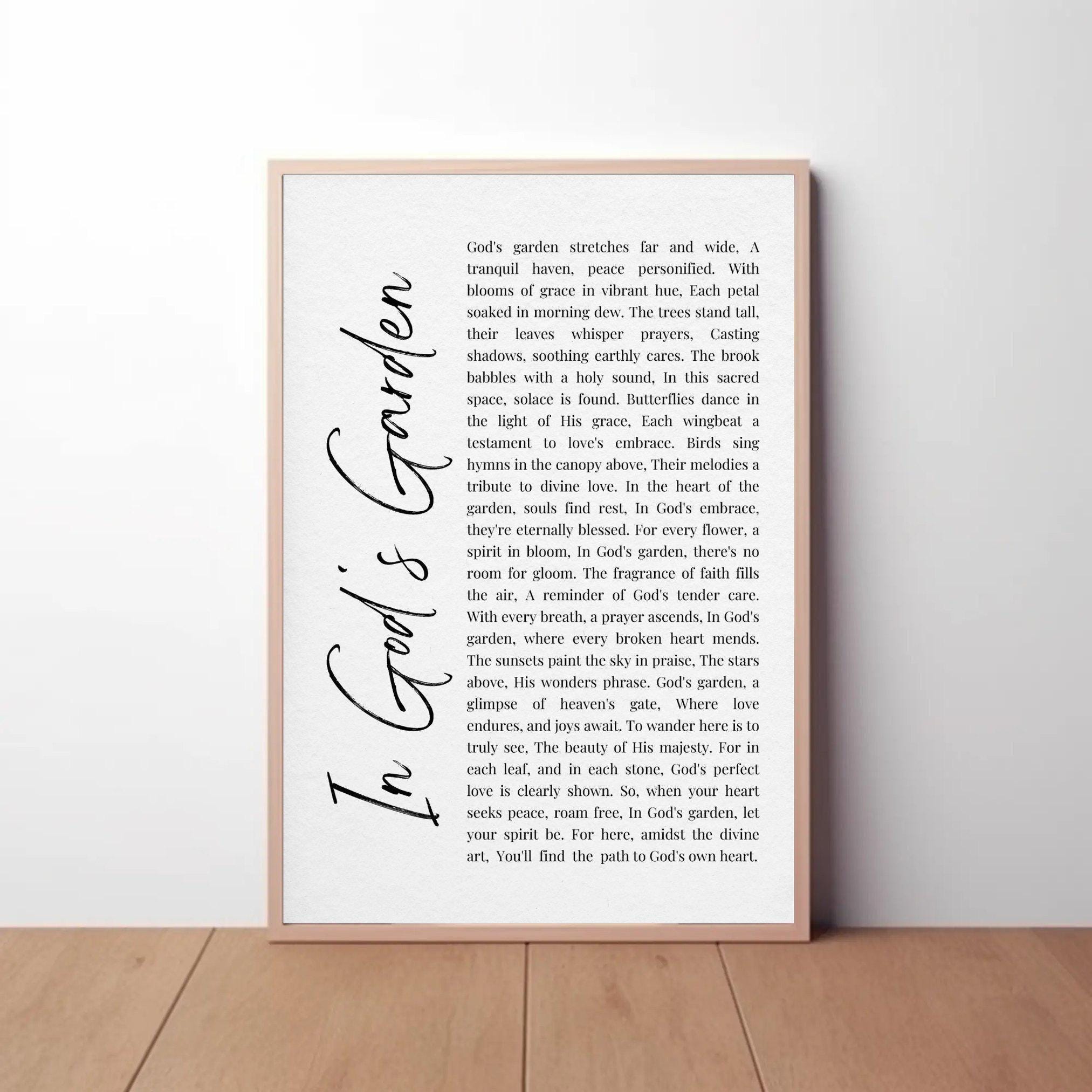 Surround your space with uplifting inspiration through this God's Garden print, a beautiful blend of faith wall decor and scripture art print designed to nurture your spirit. Each detail in this christian art file is crafted with care, presenting a bible verse embraced by lush floral elements that bring peace and encouragement to any room. Perfect for those seeking a printable faith art that combines elegance with spiritual warmth.