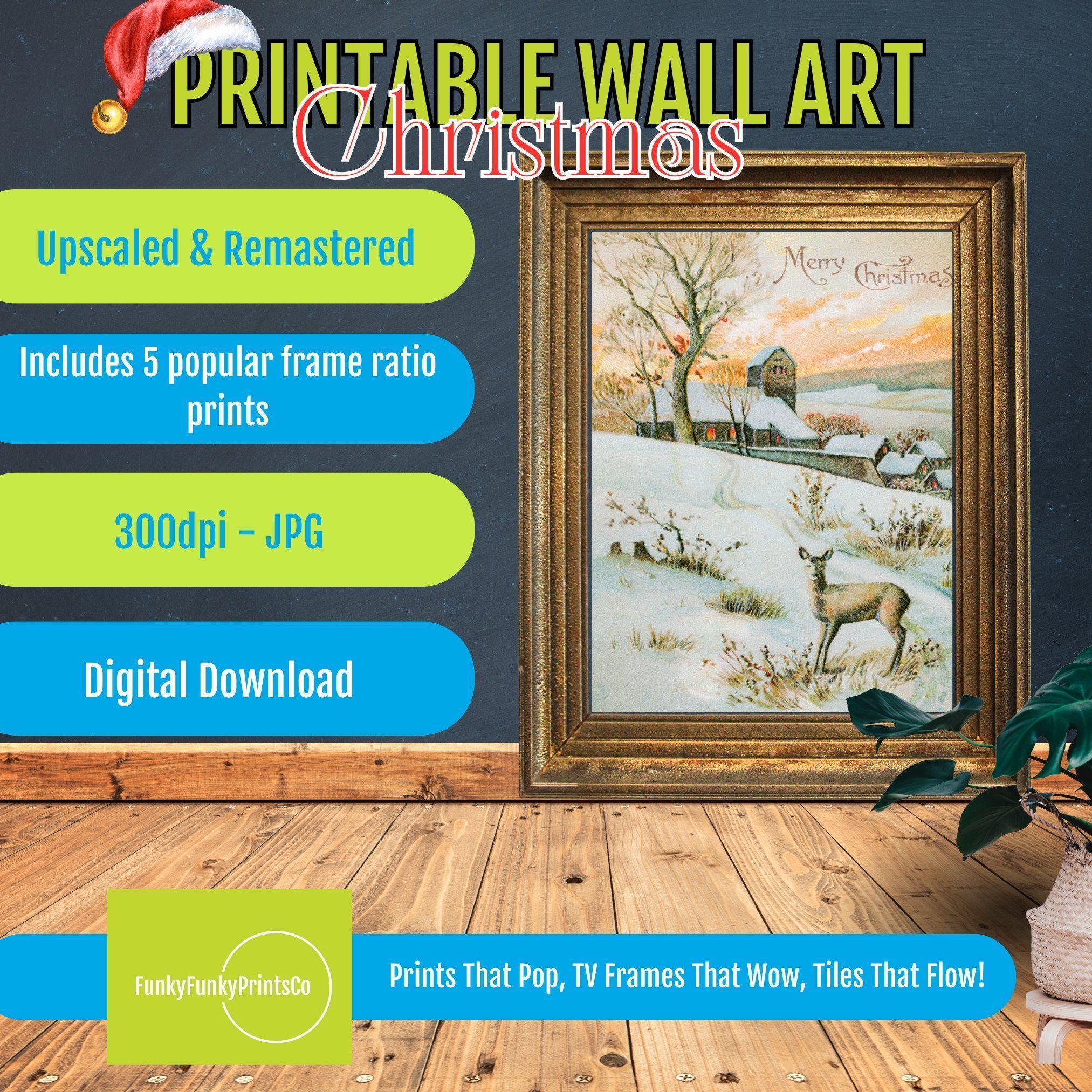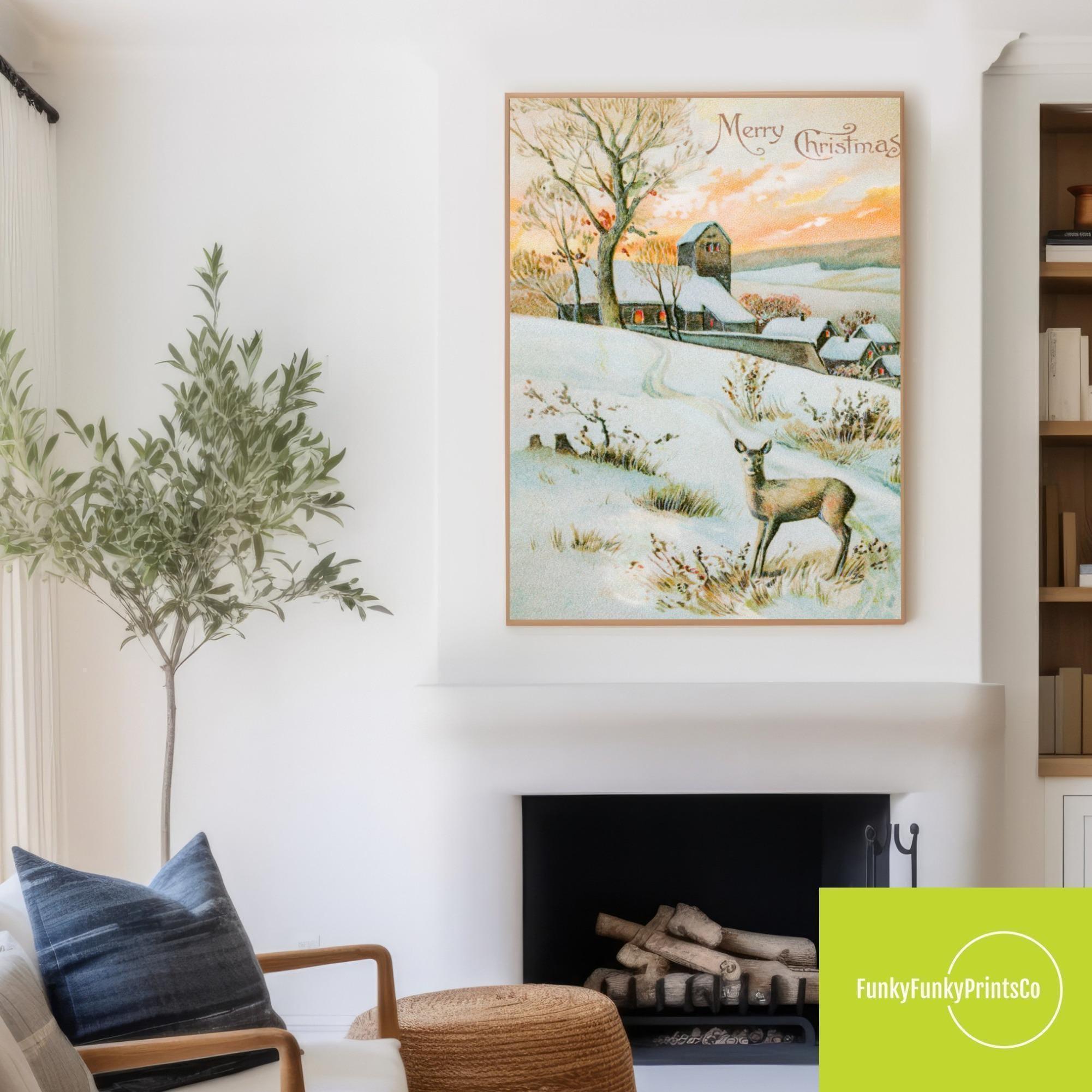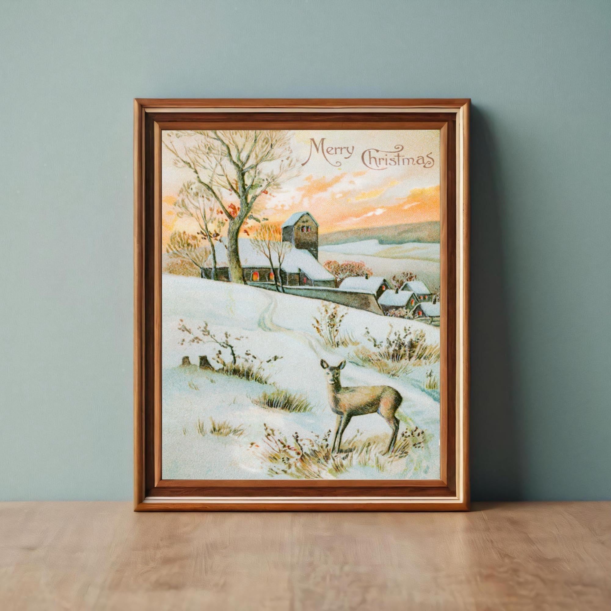 Bring serene winter magic to your space with this vintage-style deer Christmas print—glowing cottage lights, gentle snowfall, and peaceful woodland charm. Perfect for mantels, entryways, kitchen nooks, nurseries, and cozy cabins. Download, print, and style in minutes ❄️🦌