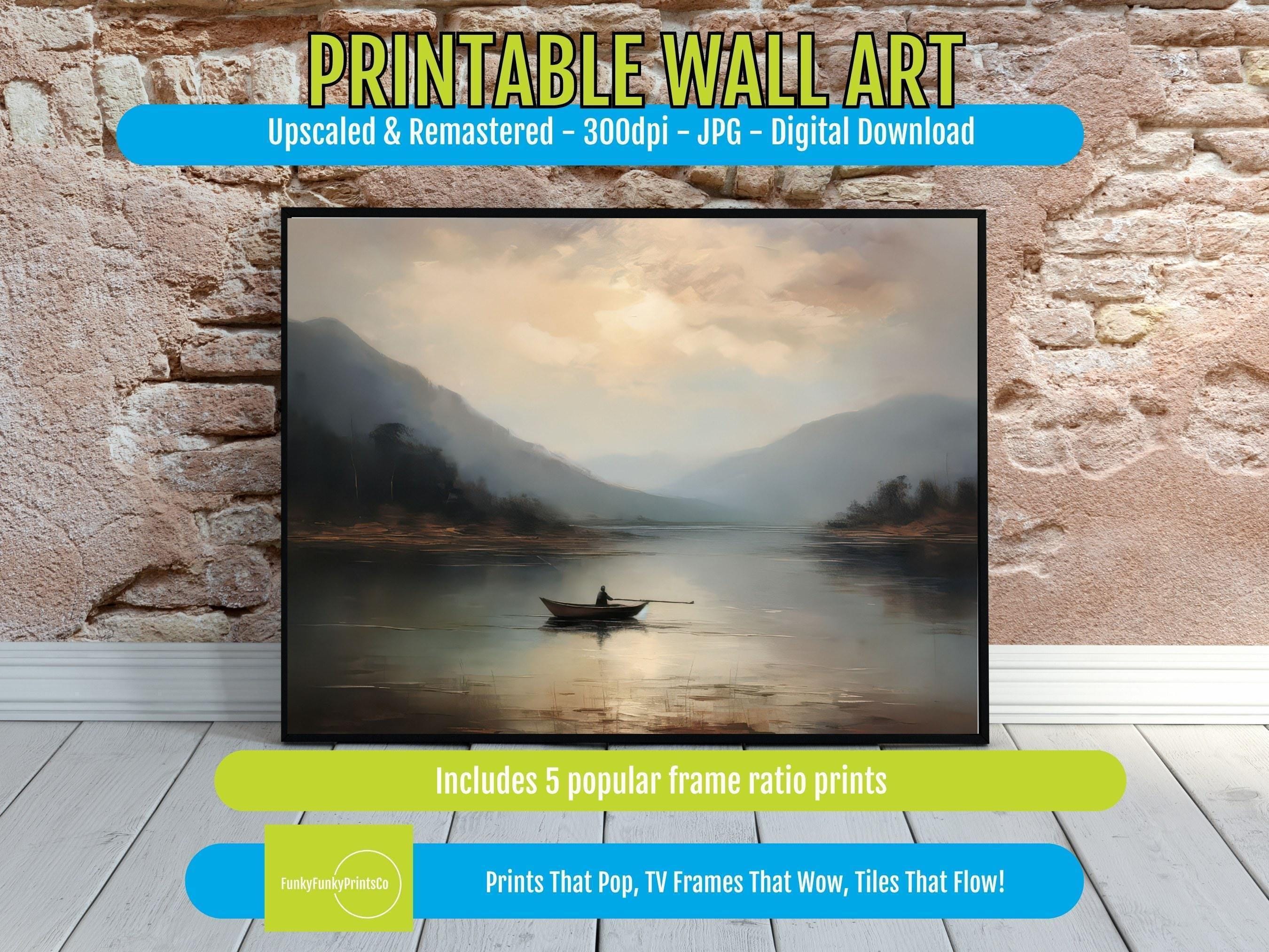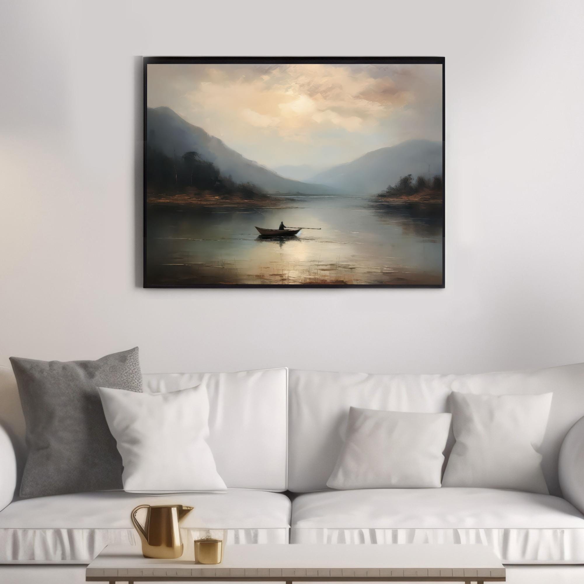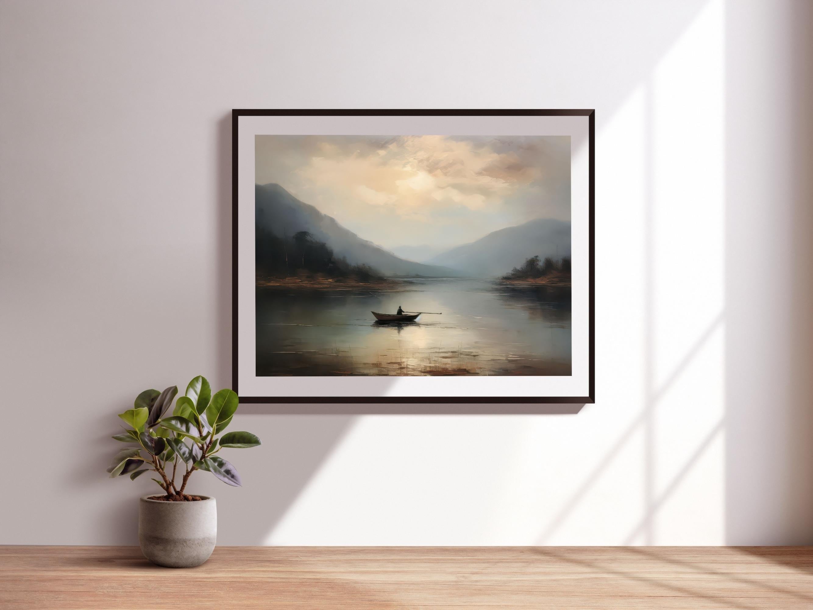 Escape into tranquility with this serene water print that captures the misty mountains art and peaceful wall art you’ve been longing for. Inspired by quiet lakes and subtle rowboats, this moody lake digital artwork brings a soothing atmosphere to any room, perfect for those who cherish tranquil home decor. Whether you’re seeking a nature lover gift or a calming centerpiece, this instant download art transforms your space effortlessly.