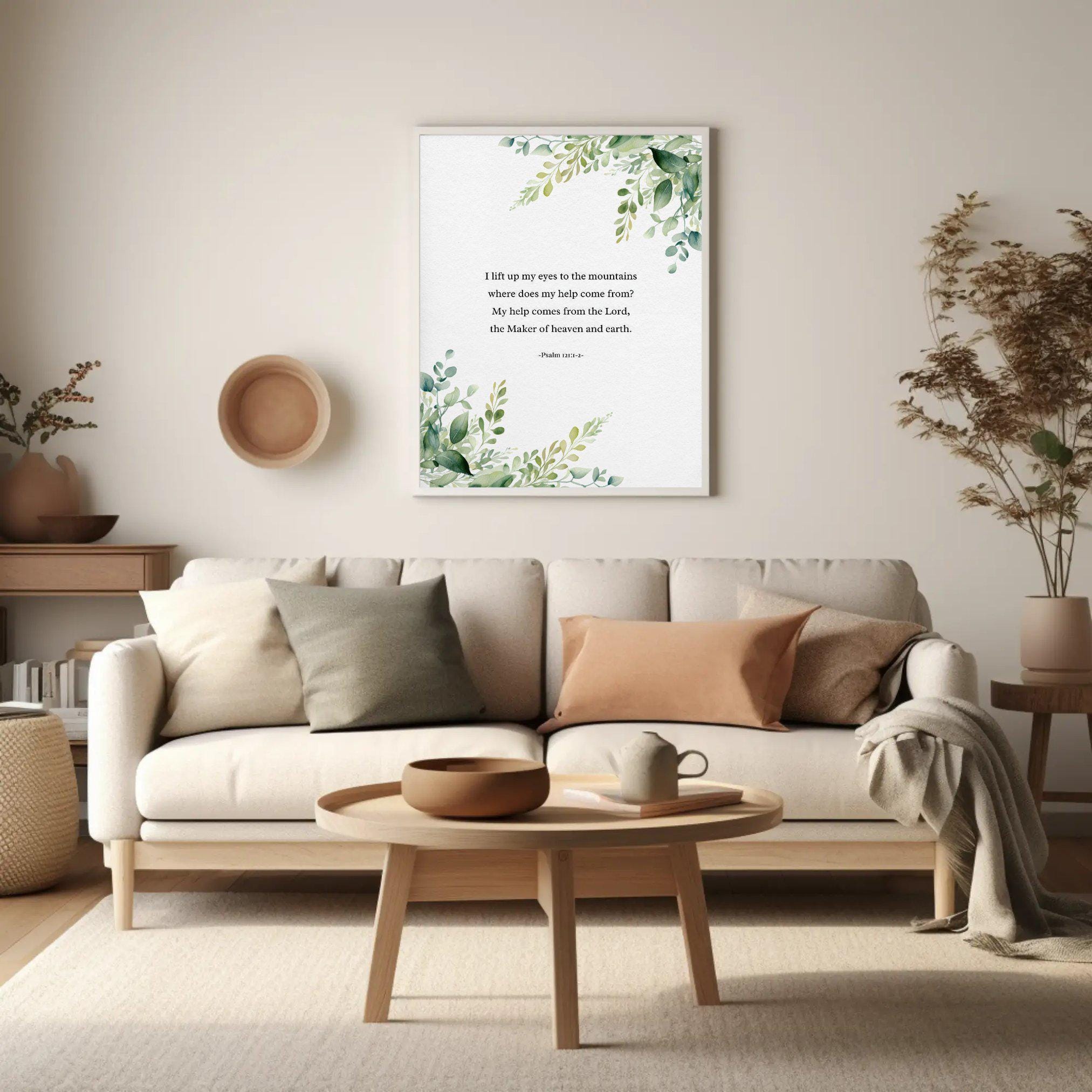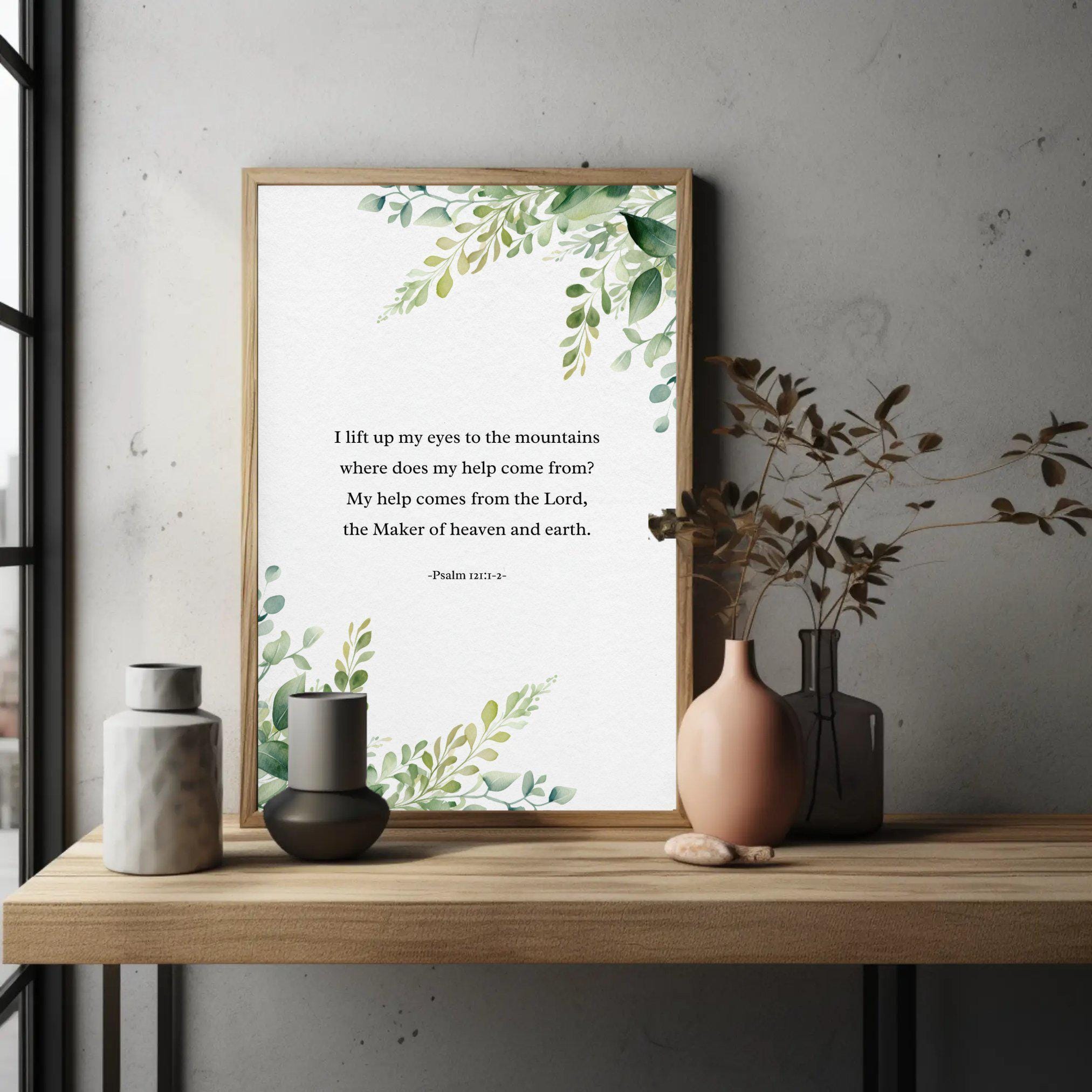 Immerse your space in tranquility and faith with this beautifully designed psalm 121 art, featuring delicate greenery scripture that brings a fresh, natural touch to your decor. This printable bible art captures the uplifting words, "I lift up my eyes to the mountains," making it perfect for anyone seeking inspiring christian wall art that resonates deeply. Whether displayed in a prayer corner or living room, this faith wall decor invites peace and reflection into your home.