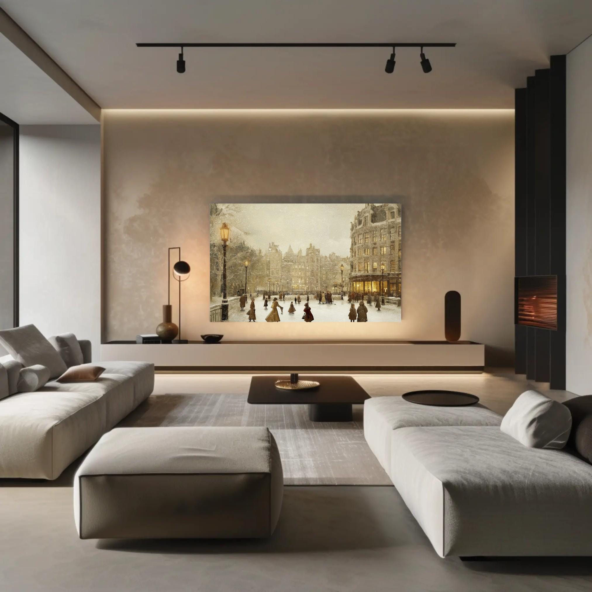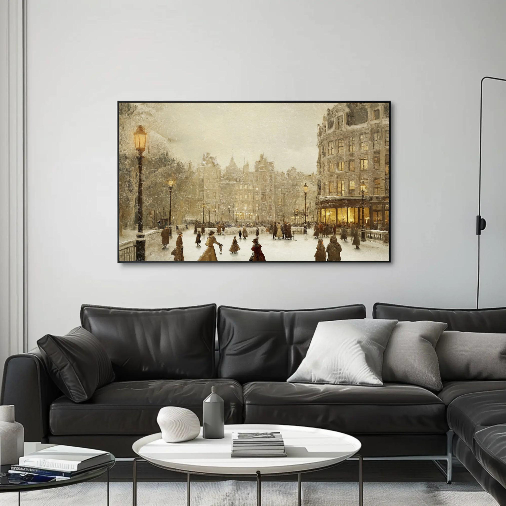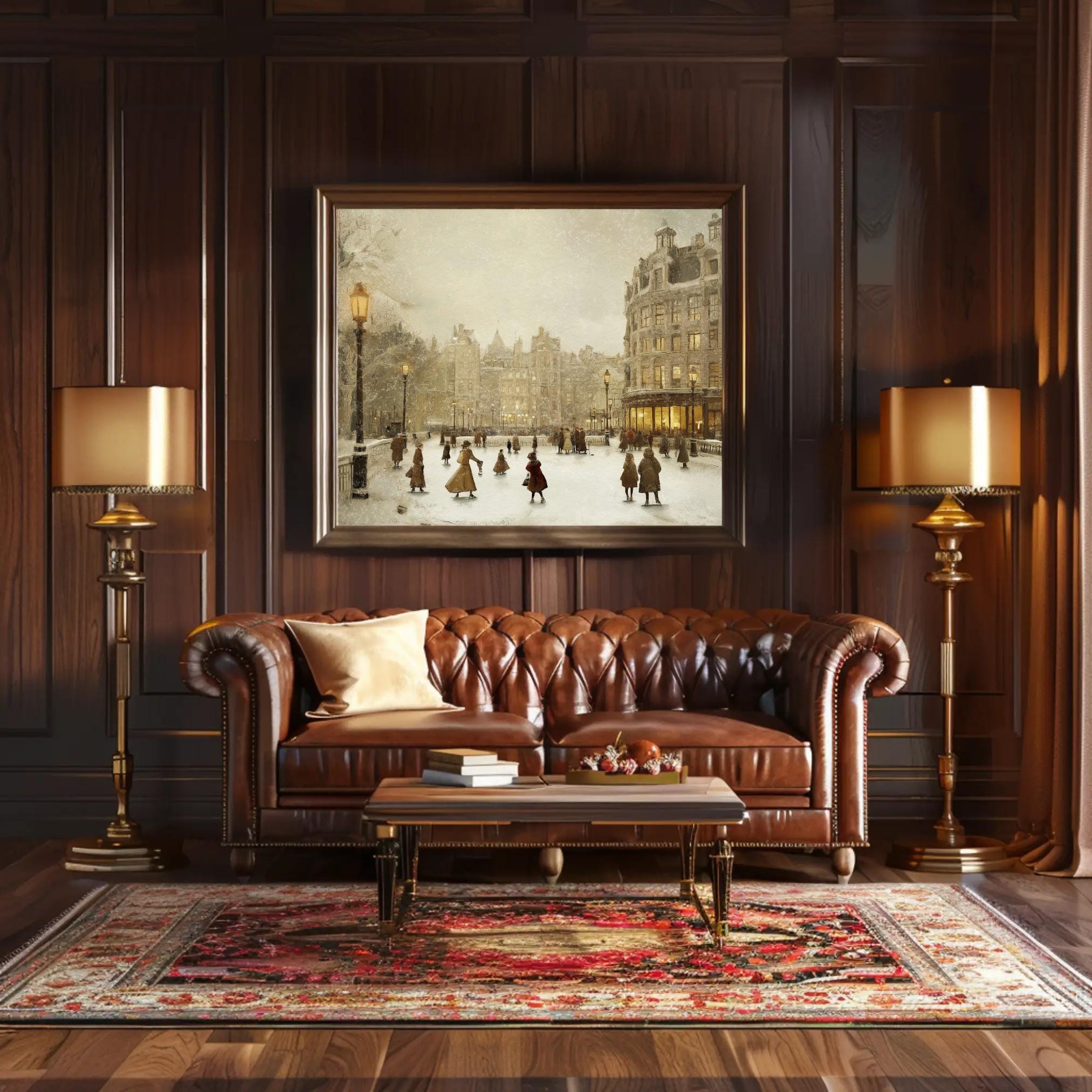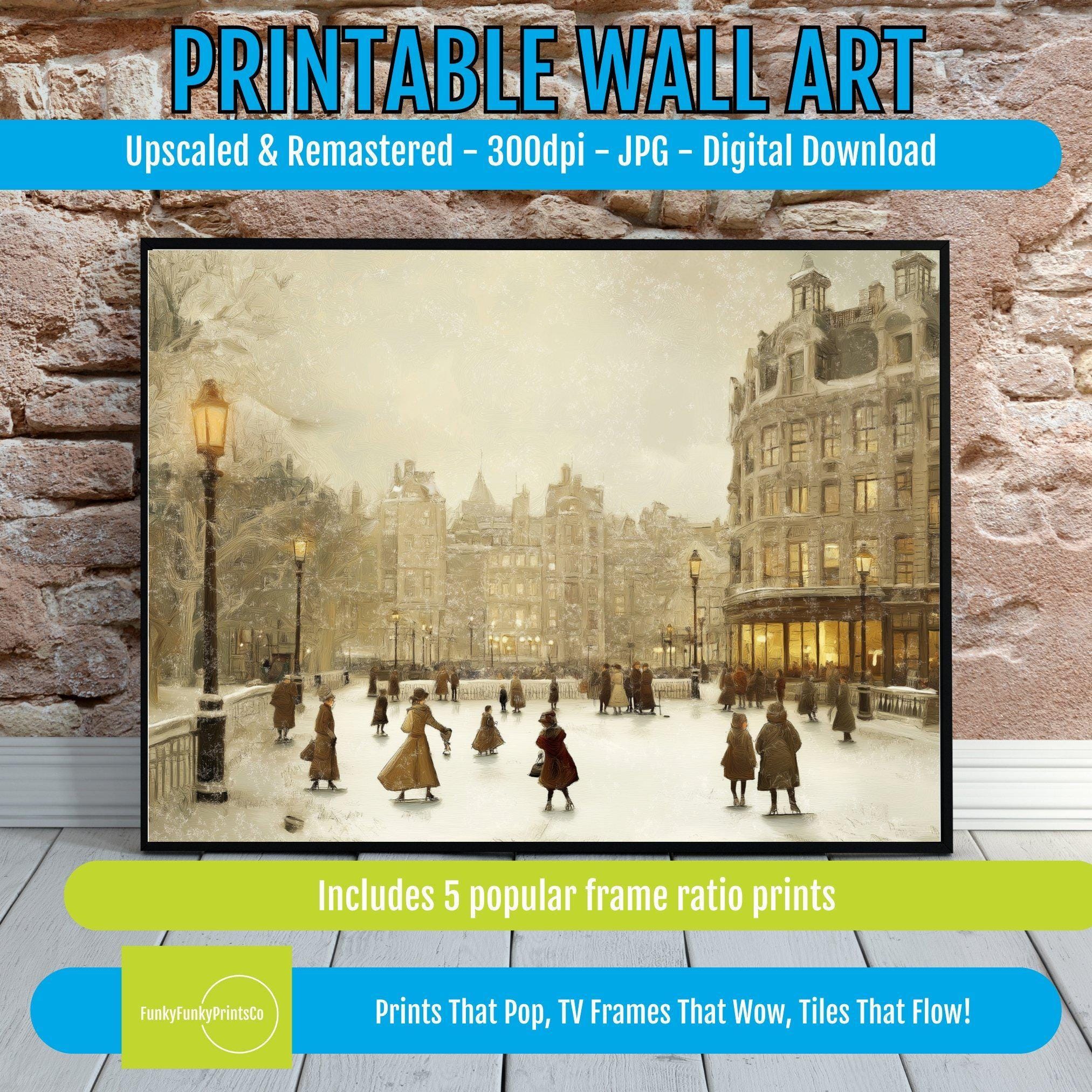 Step into a nostalgic winter wonderland with this enchanting printable winter art that beautifully captures a Victorian skating scene. Perfect for adding joyful winter decor to your home, this holiday wall print brings timeless charm and festive cheer to any space. Celebrate the magic of the season with this winter skating scene, designed to evoke warmth and holiday spirit.