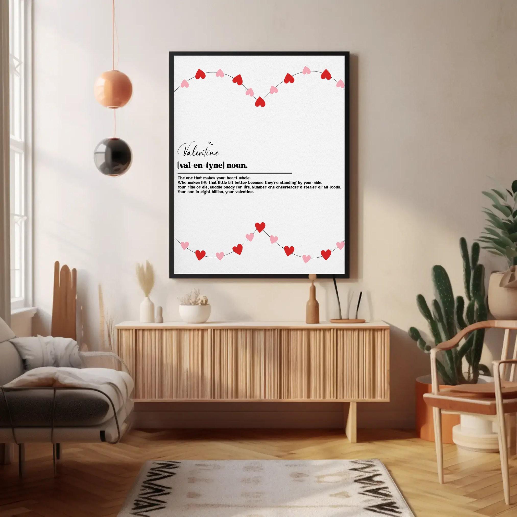 Celebrate love with this charming valentine wall art featuring a unique valentine definition. It's an easy way to enhance your space with romantic home decor. This printable love quote print uses modern typography and heartfelt words, making it a thoughtful valentine gift, romantic gift, anniversary gift, gift for him, or gift for her. Whether it's for valentine's day, an anniversary, or simply to show someone you care, this printable decor brings warmth and affection to any room.