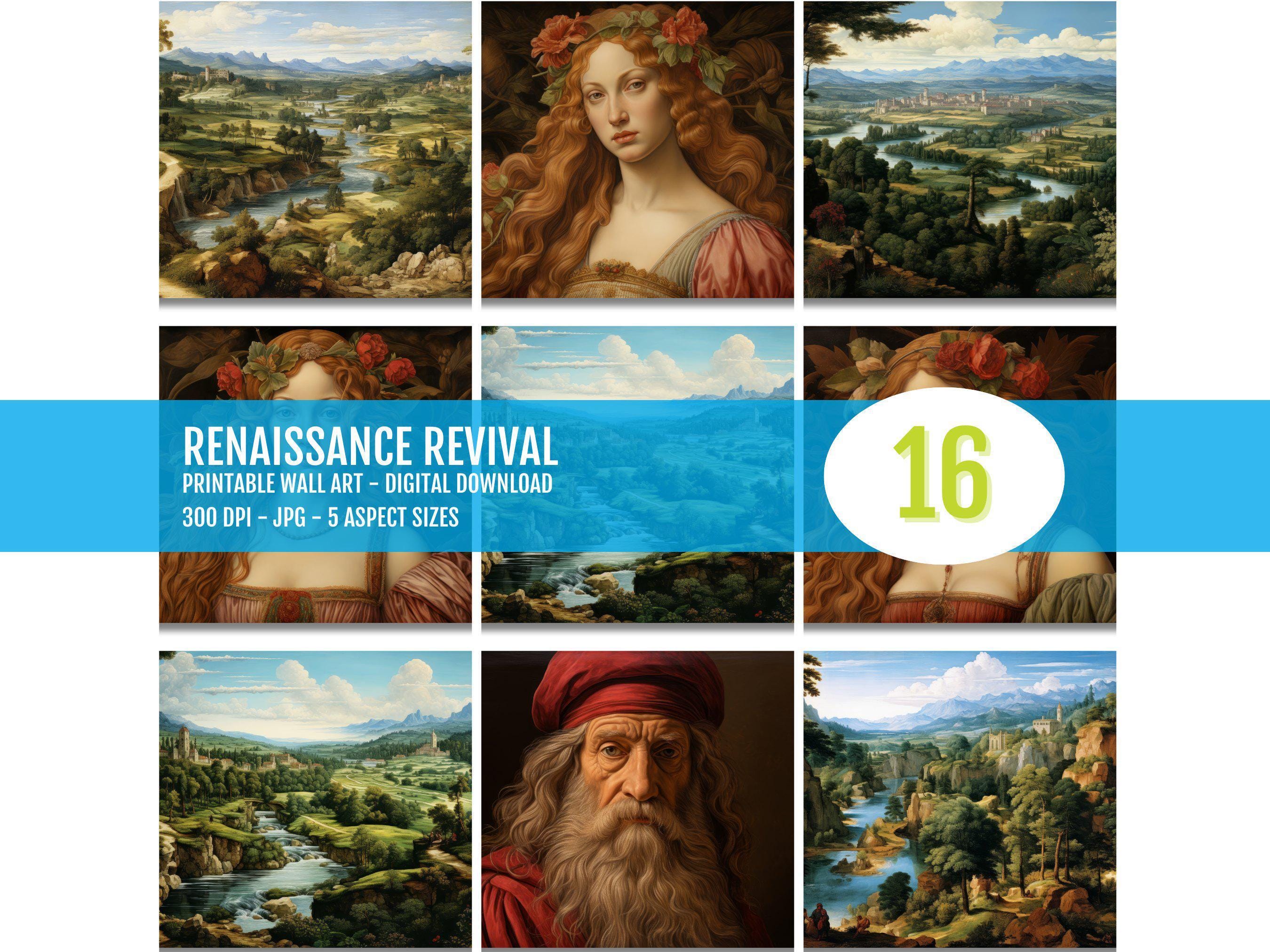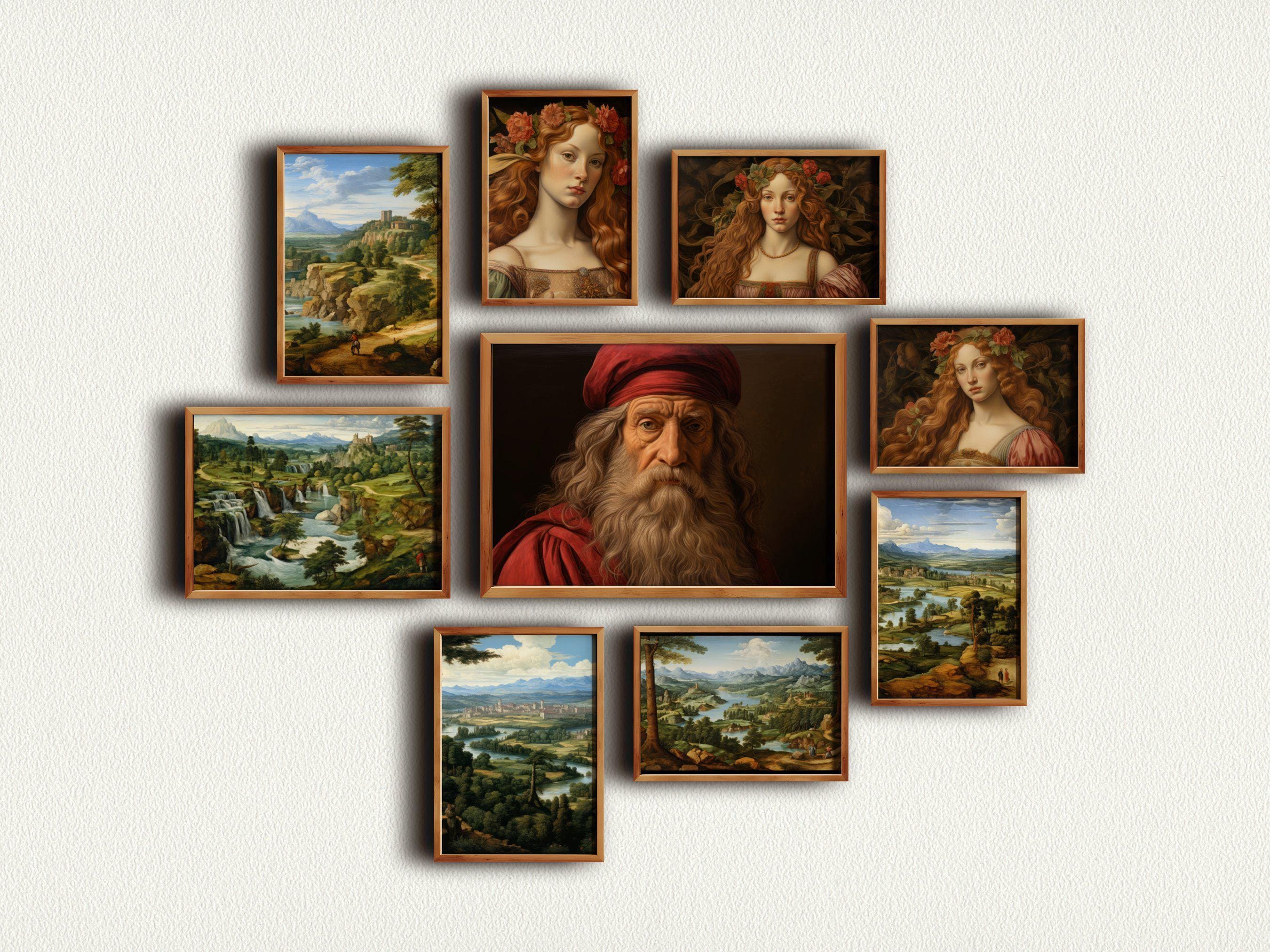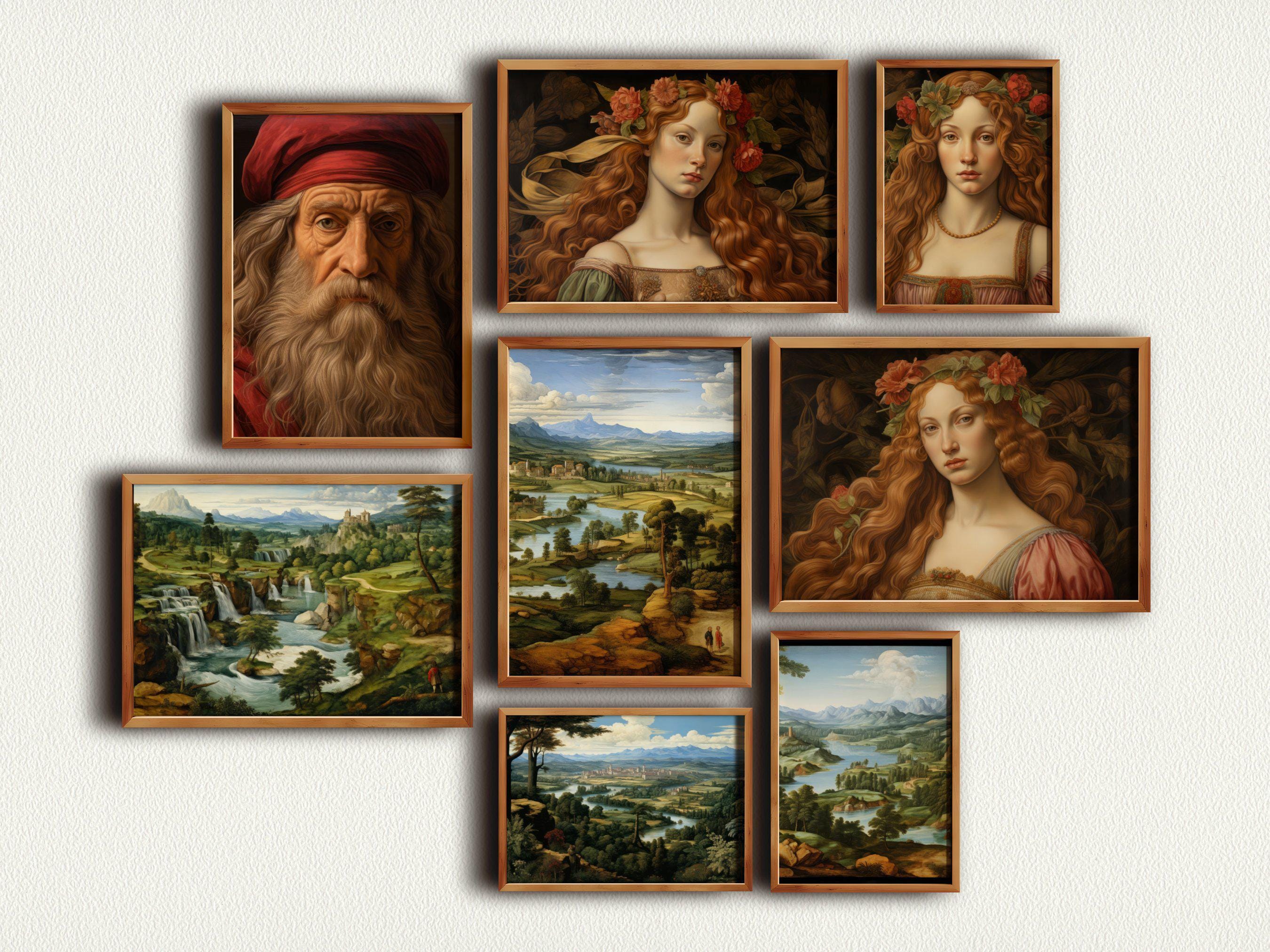 Step into a world where Botticelli style and medieval landscapes breathe life into your walls with this exquisite printable art set. Inspired by the grace of Italian art prints and the timeless elegance of old master portraits, each piece invites you to experience the rich history and beauty of renaissance revival. Whether you're a history fan or simply seeking sophisticated home office wall art, this collection brings a captivating blend of castle landscape art and delicate portraiture to your space.