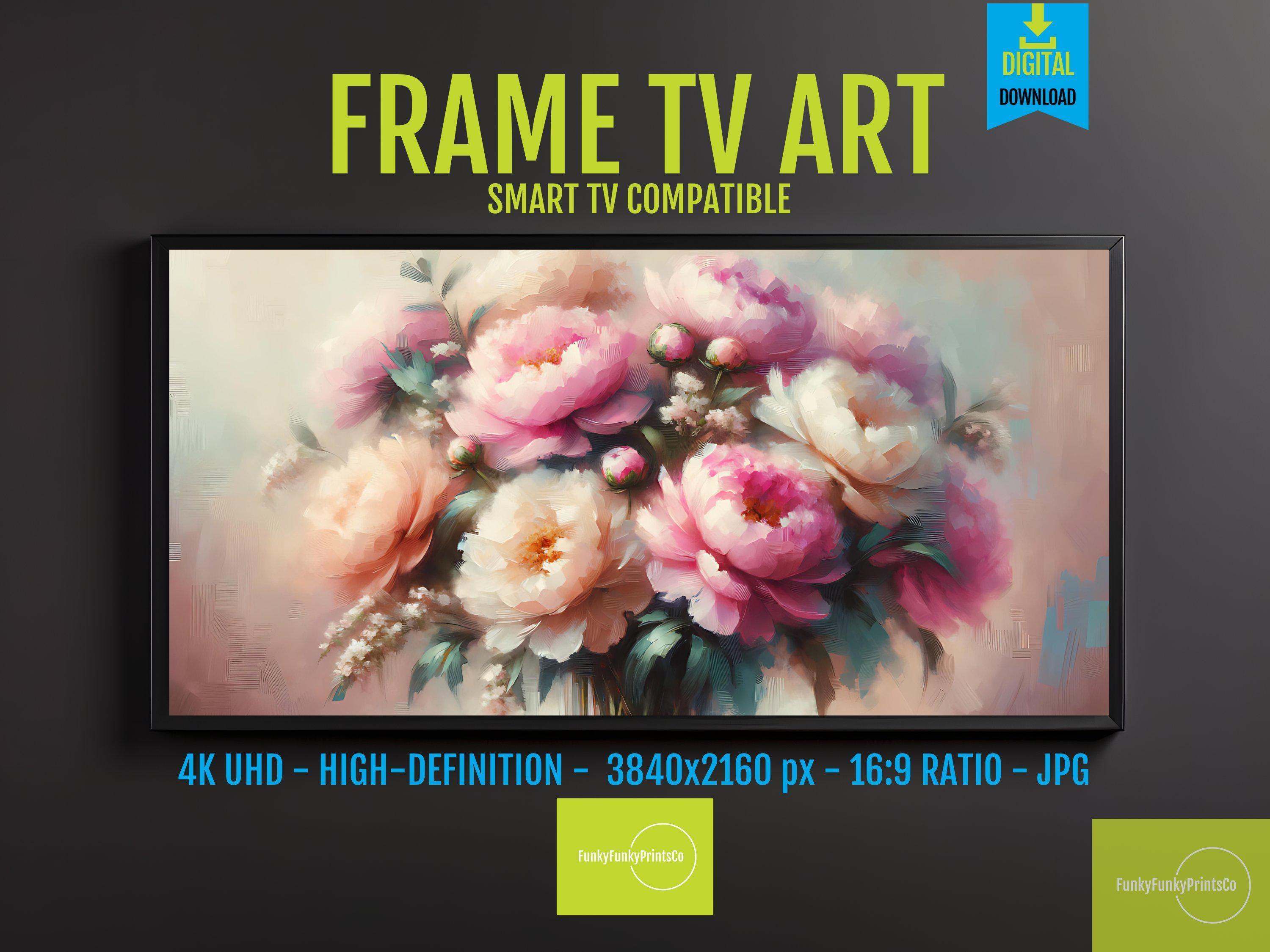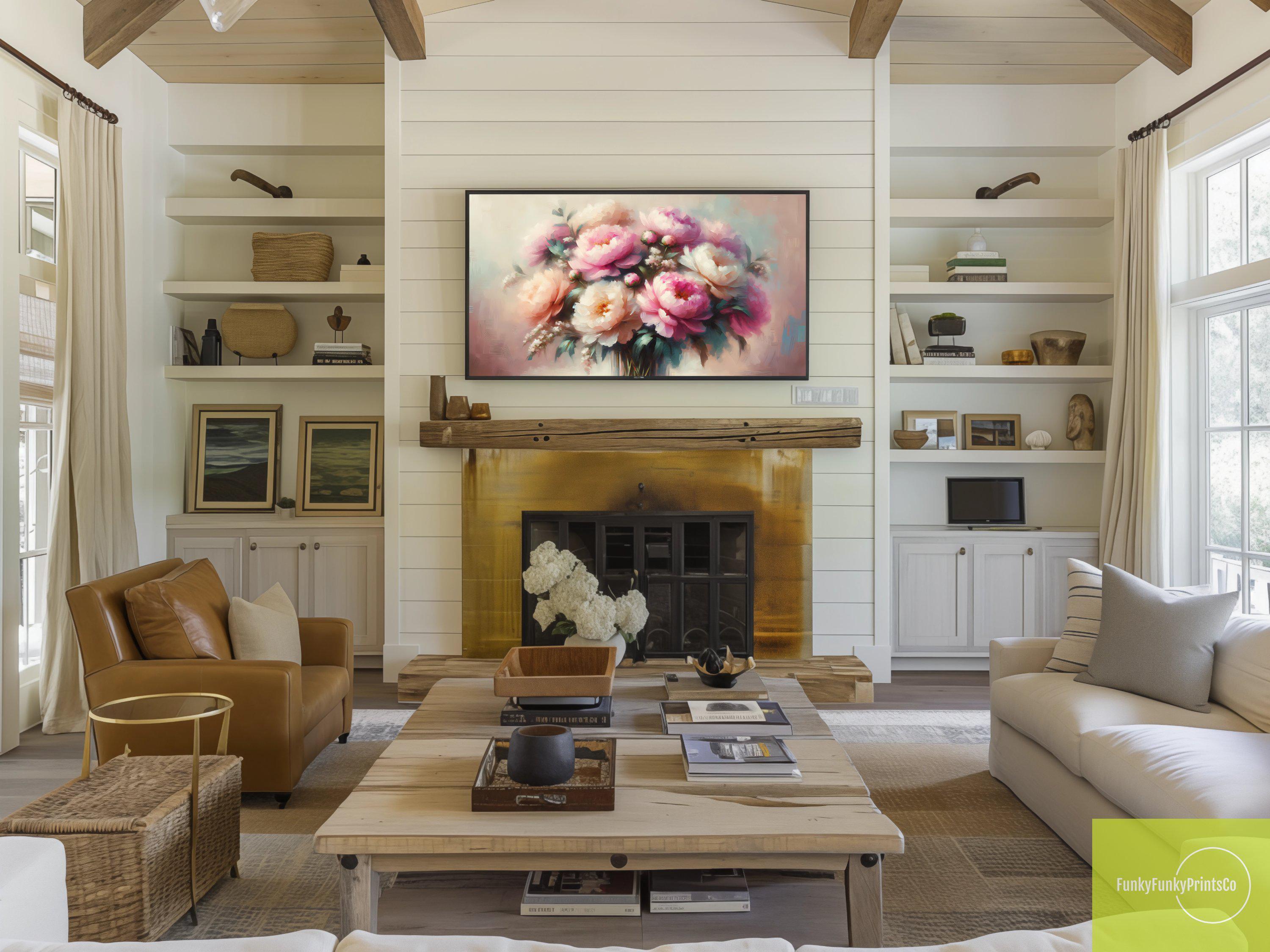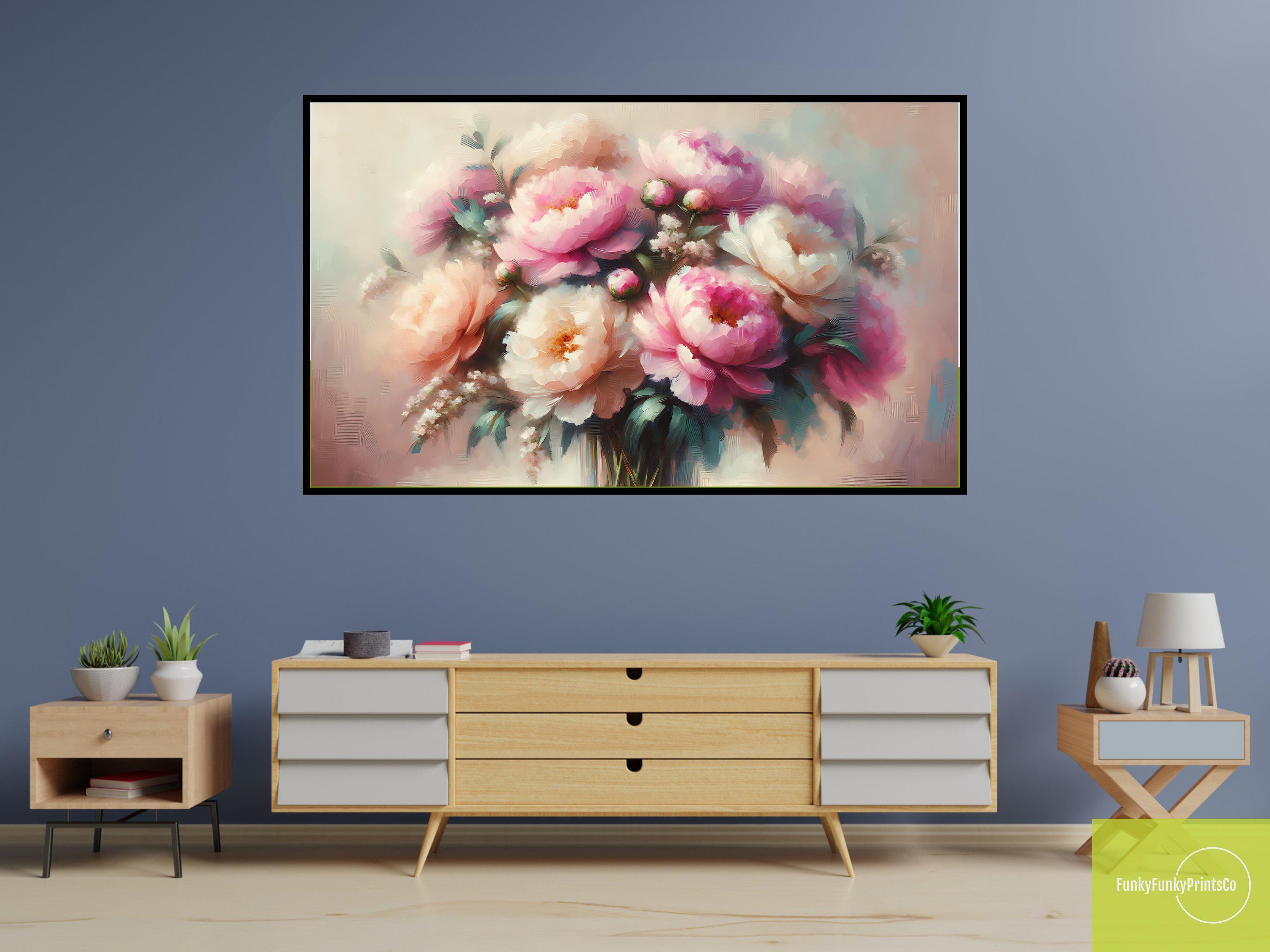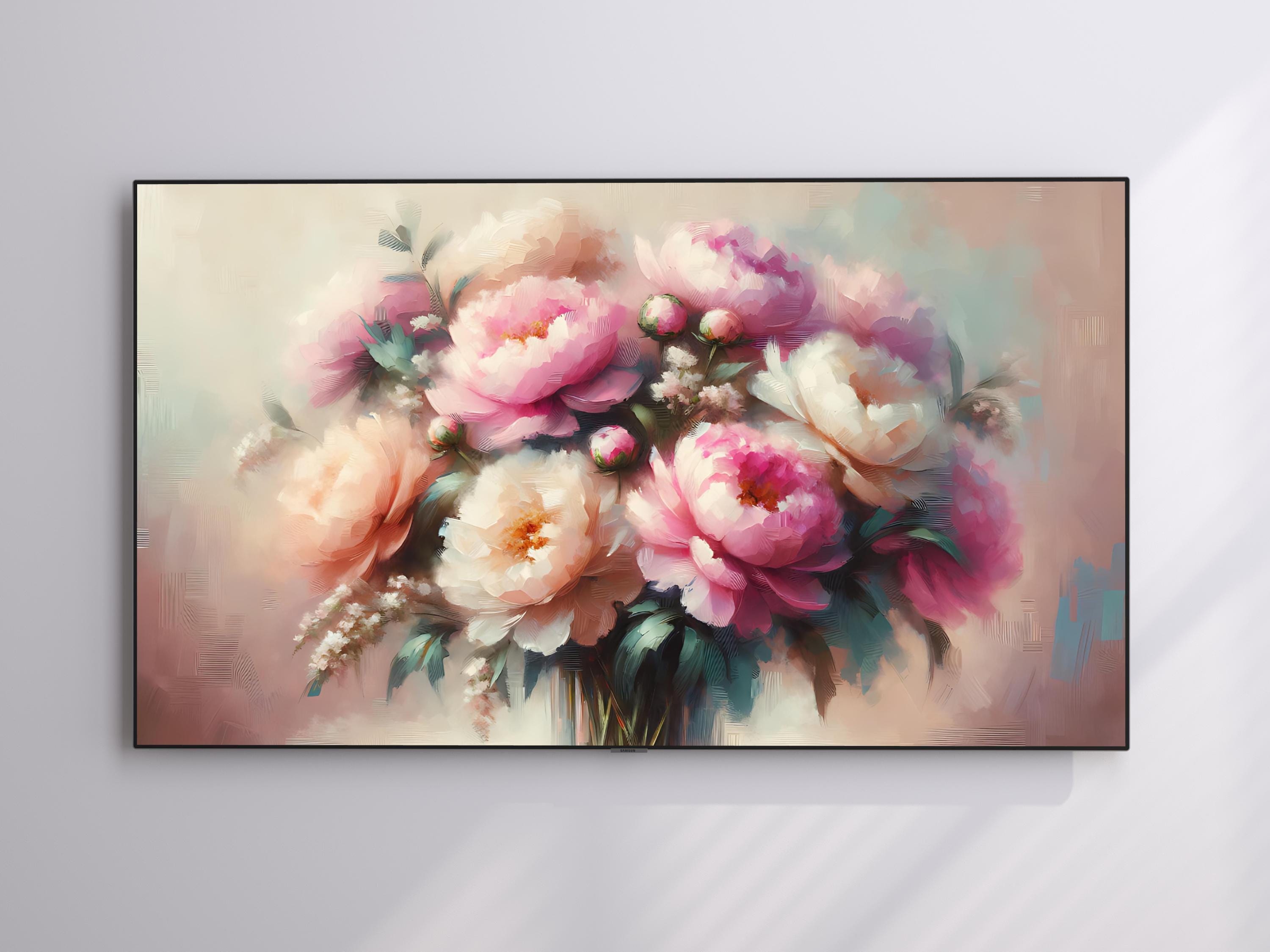 Turn your Samsung The Frame into a romantic focal point with this romantic peonies art, featuring a blush flower bloom and a lush pink floral display. The soft dreamy vibe and gentle botanical glow add living room elegance or perfect a bedroom gallery look, creating a vintage rose charm and pastel petals scene for any space. Inspired by spring bouquet mood, this botanical wall decor complements bedrooms, living spaces, and cozy nooks.