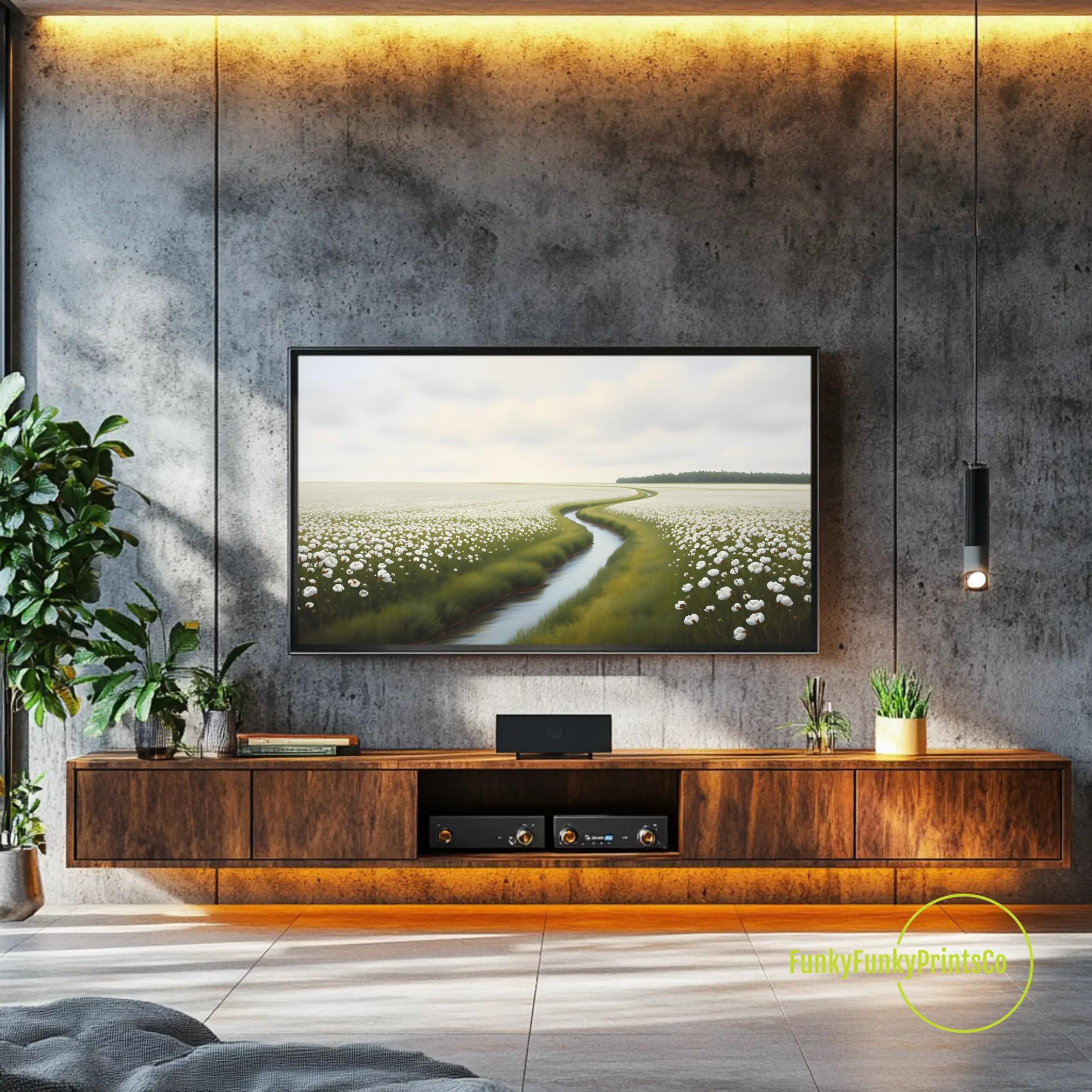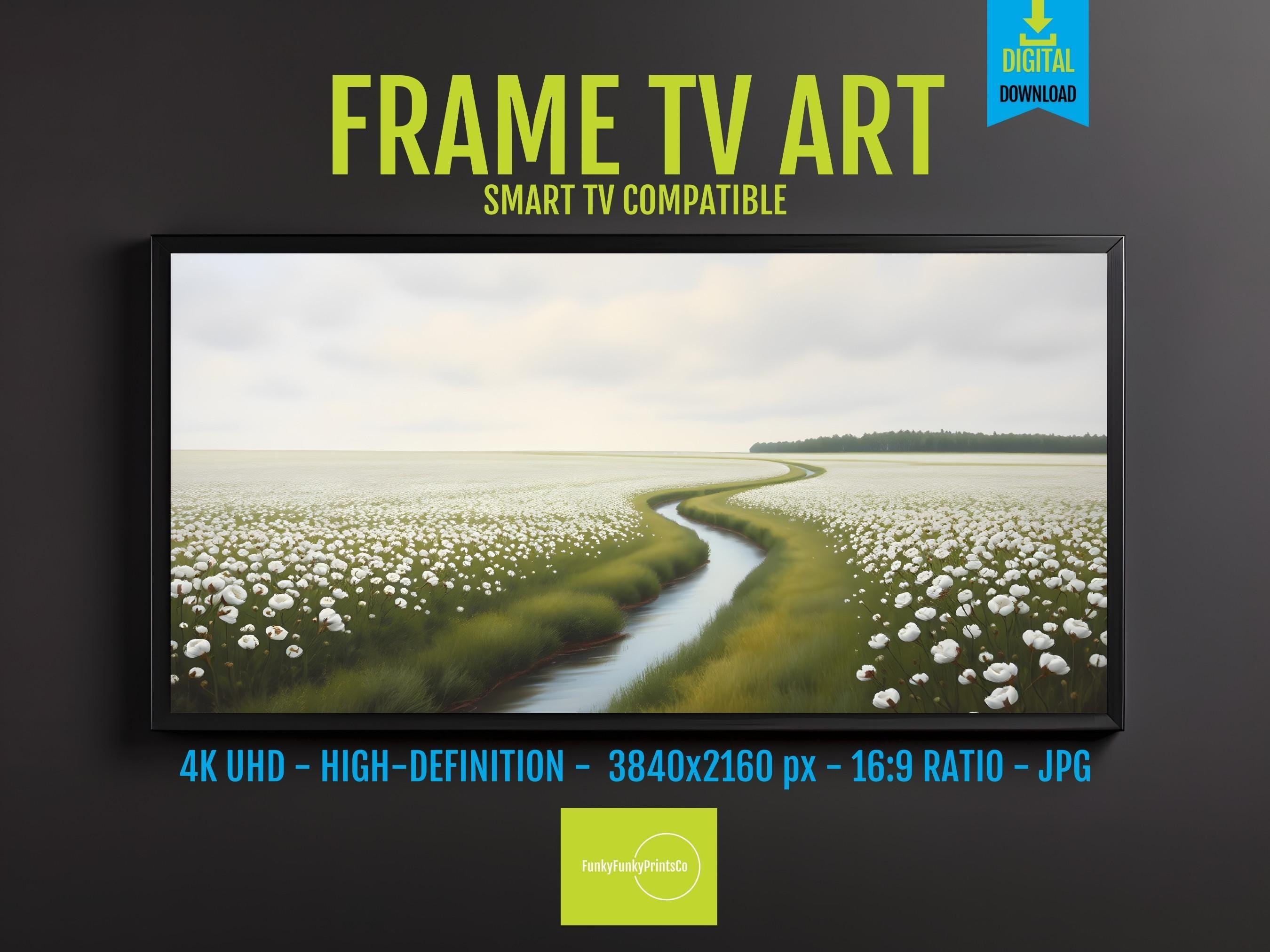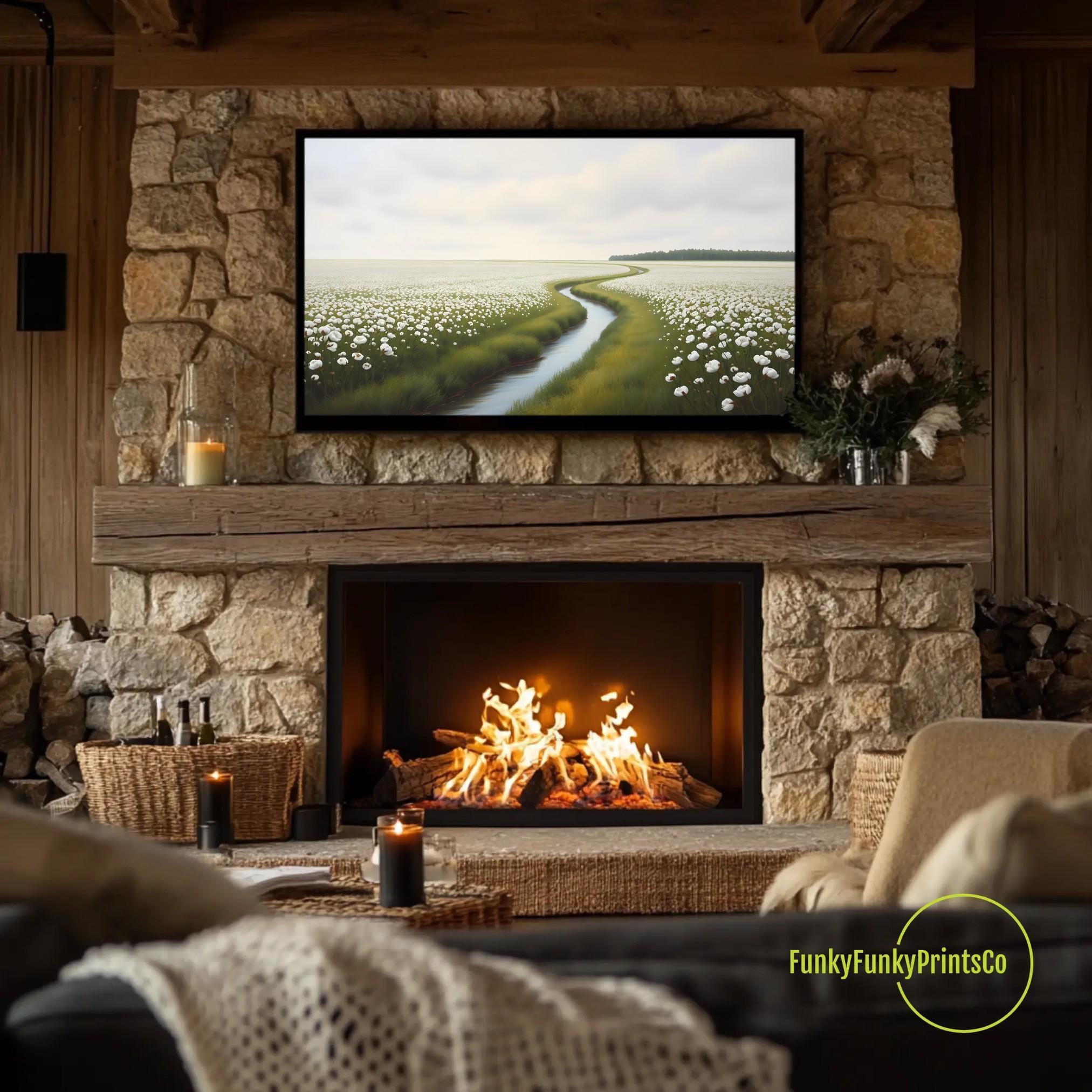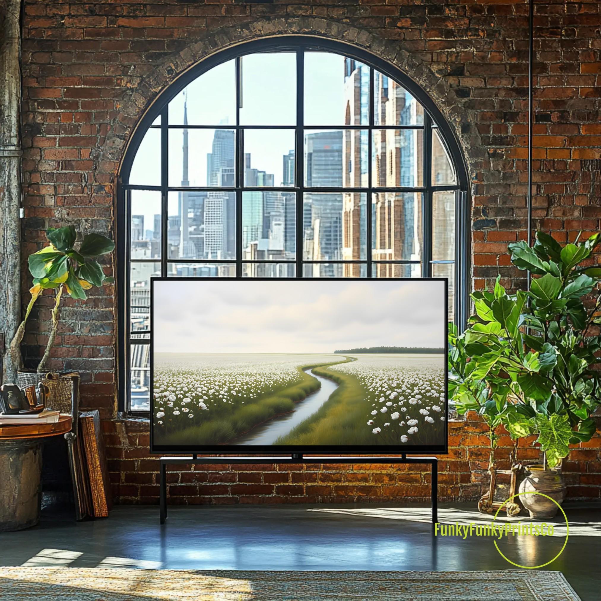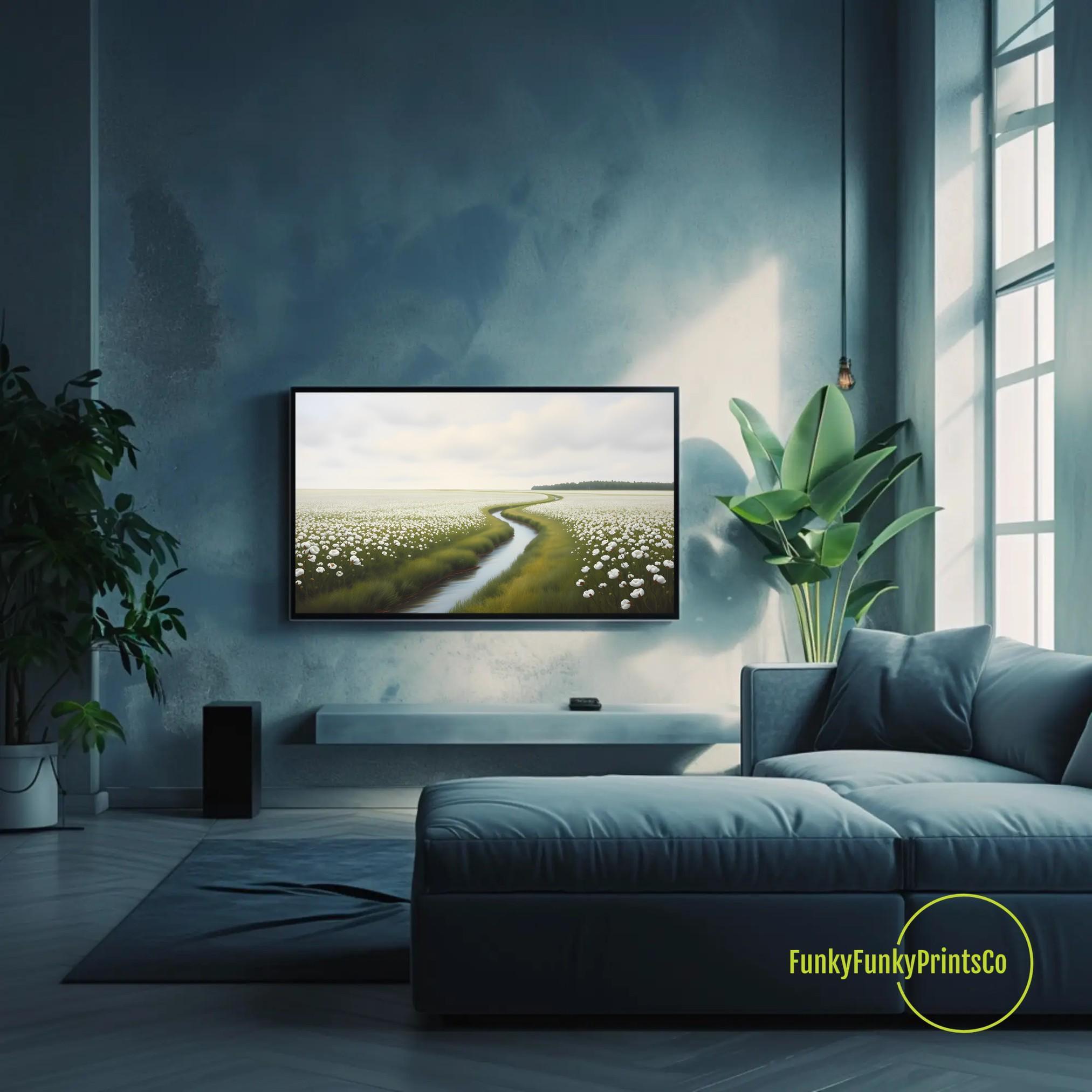 Experience the serene charm of southern home decor with this peaceful country art, thoughtfully crafted to transform your Samsung Frame TV into a calming wall display. Inspired by quiet rural scenery, this digital TV download captures the tranquil beauty of a cotton field, perfect for those who love rustic digital prints and crave a touch of country living room warmth. Let your screen become a soothing window to nature, bringing timeless southern charm into your space.