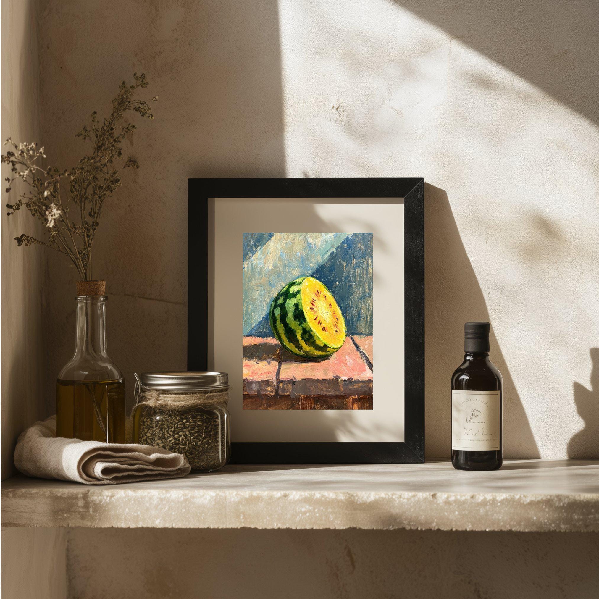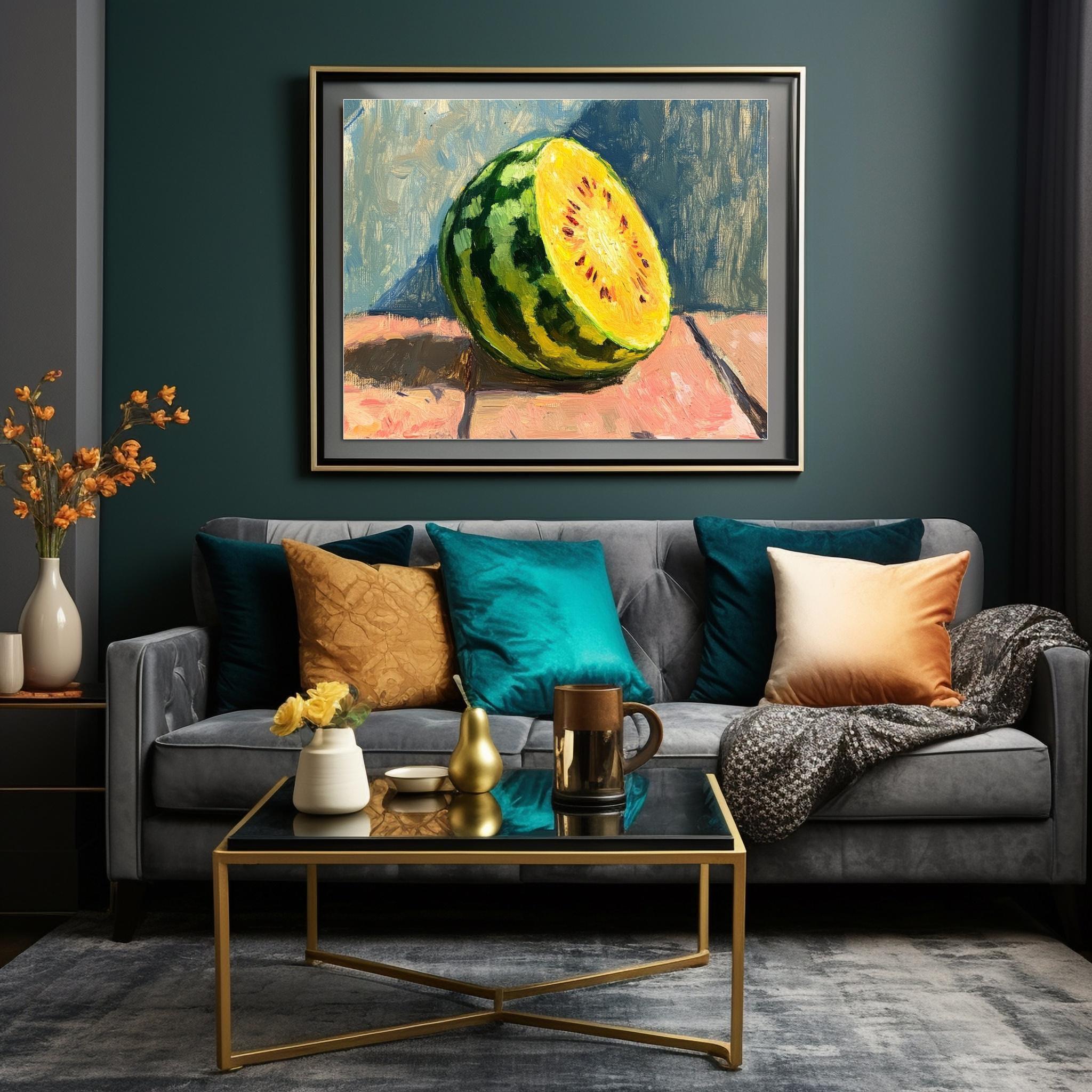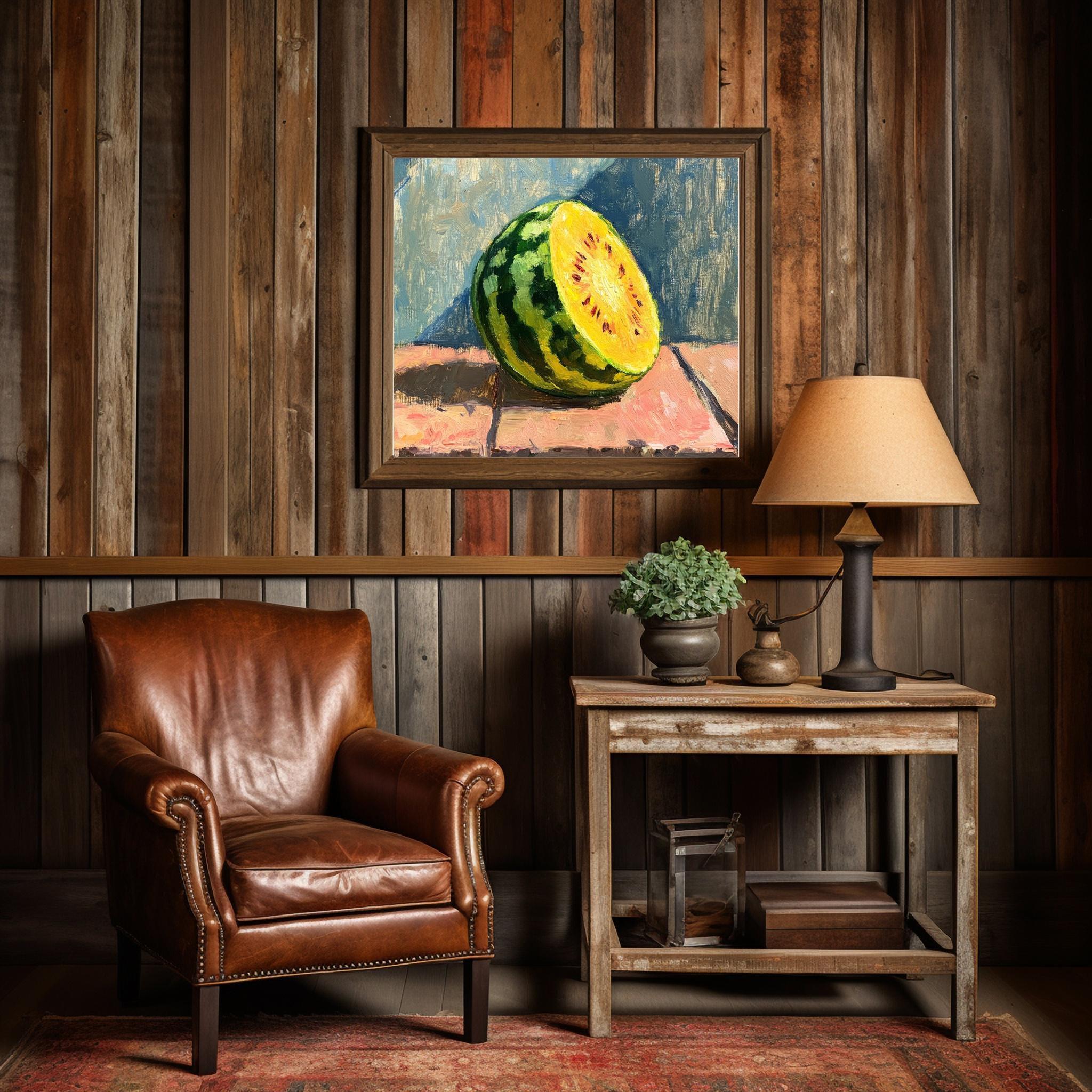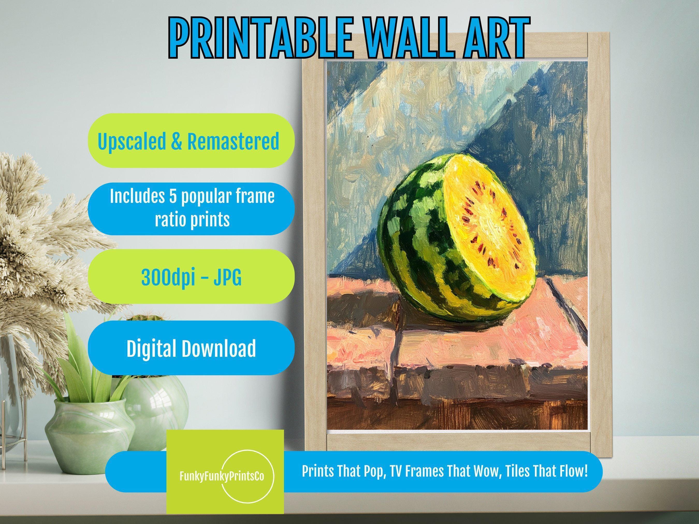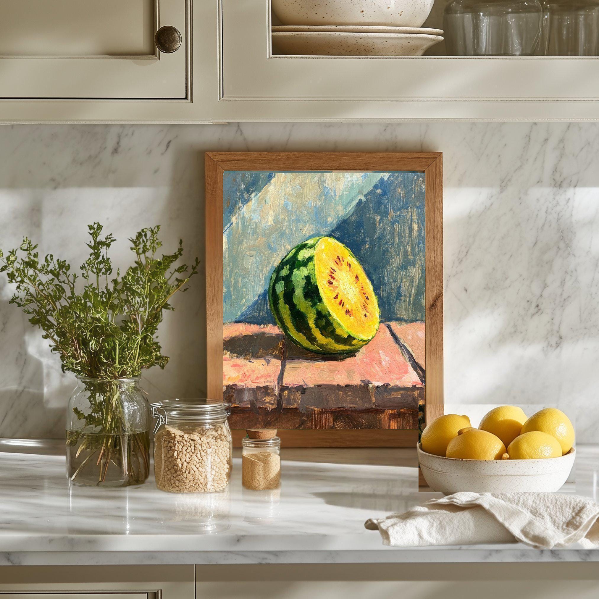 Celebrate the vibrant charm of summer with this captivating watermelon art print, a perfect blend of modern fruit decor and juicy fruit wall art. Inspired by nature's freshness, this still life painting features a luscious yellow watermelon set against soft blues and warm tones, creating a serene yet energetic atmosphere. As a digital download, it offers an easy way to infuse your kitchen or kids' room with colorful kitchen art that brightens any space.