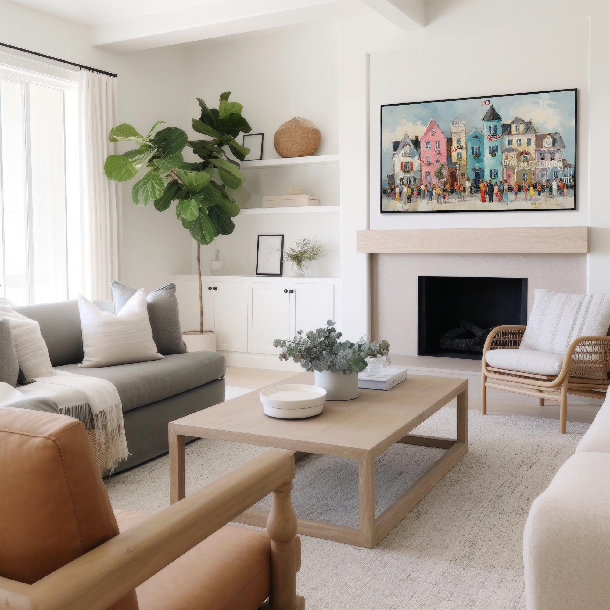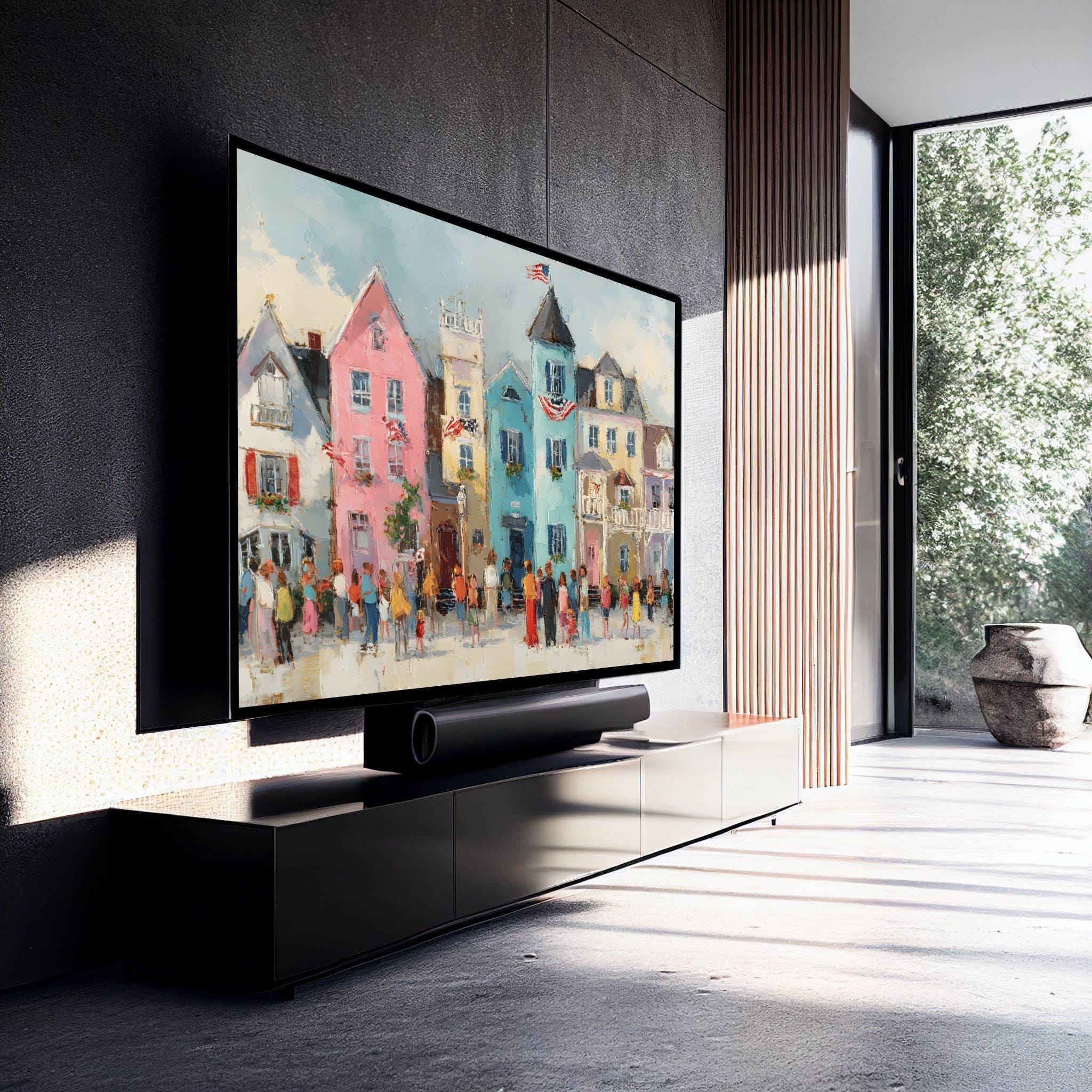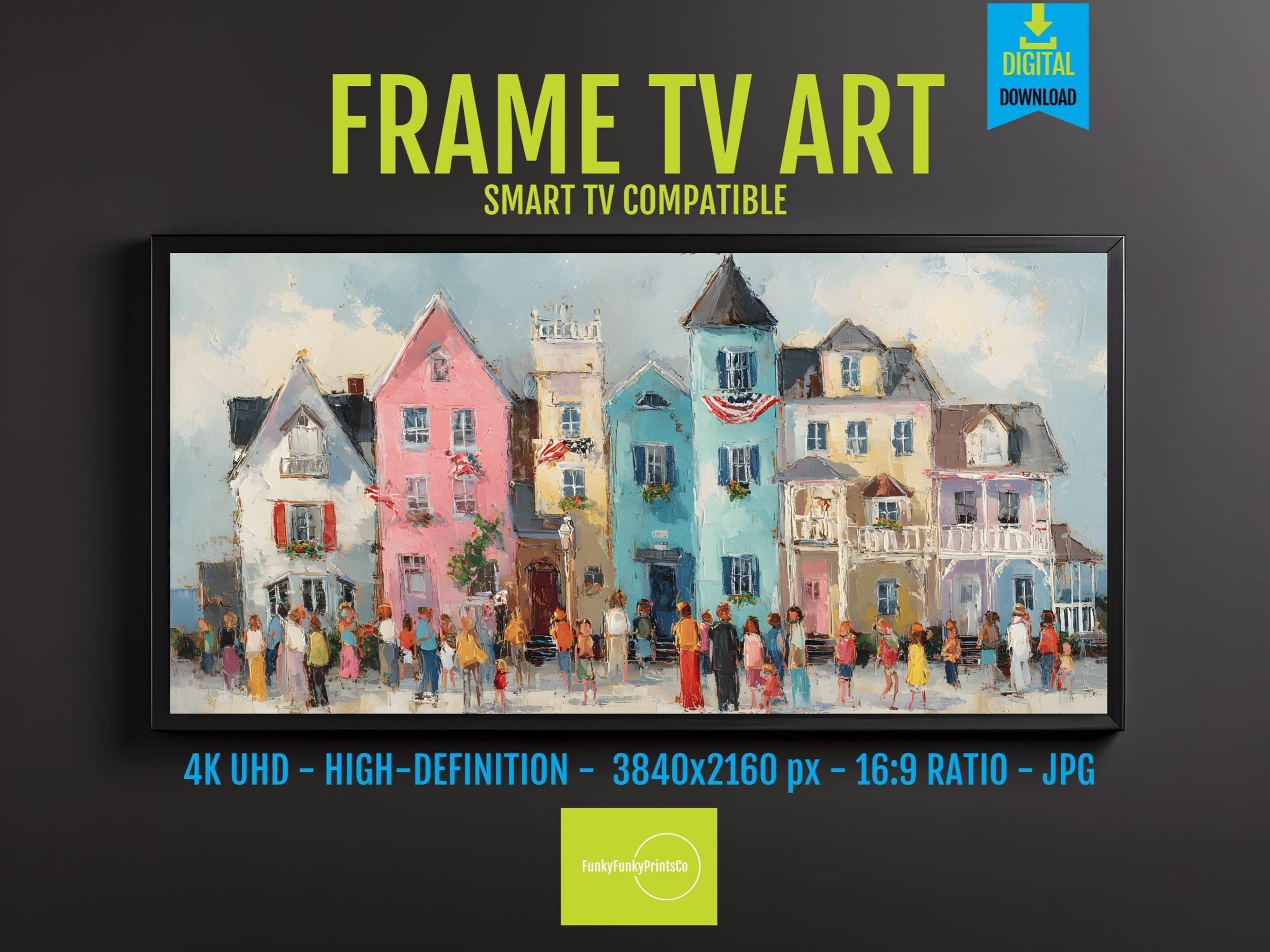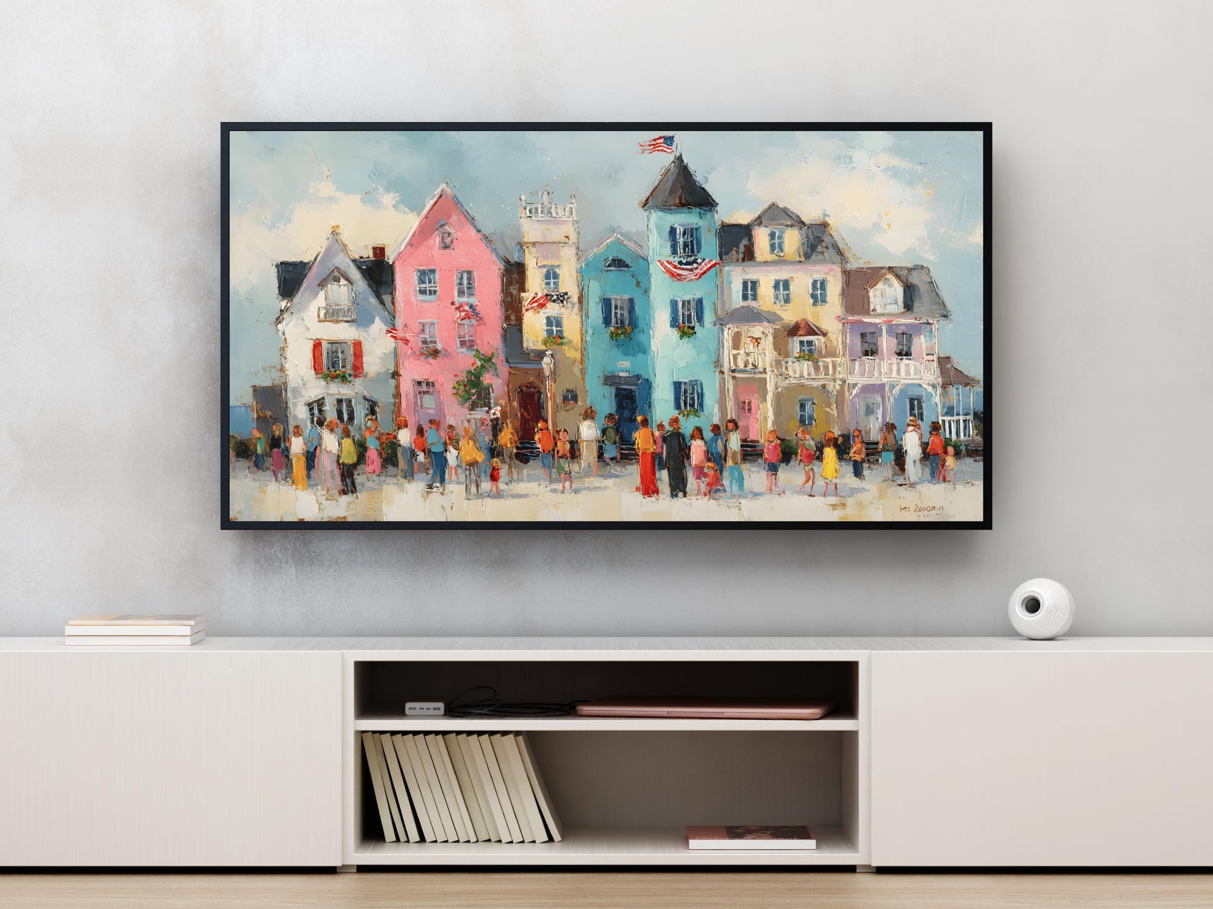 Discover the charm of a coastal town captured in vibrant street scene digital art, where colorful balconies and bright clothing bring life to every corner. This unique piece celebrates diverse people art and the joyful energy of community life, perfect for adding a creative home decor touch to your space. Designed as a 4k UHD screensaver, it's ideal for your Samsung Frame TV or any digital display seeking bold brush strokes and vivid colors.