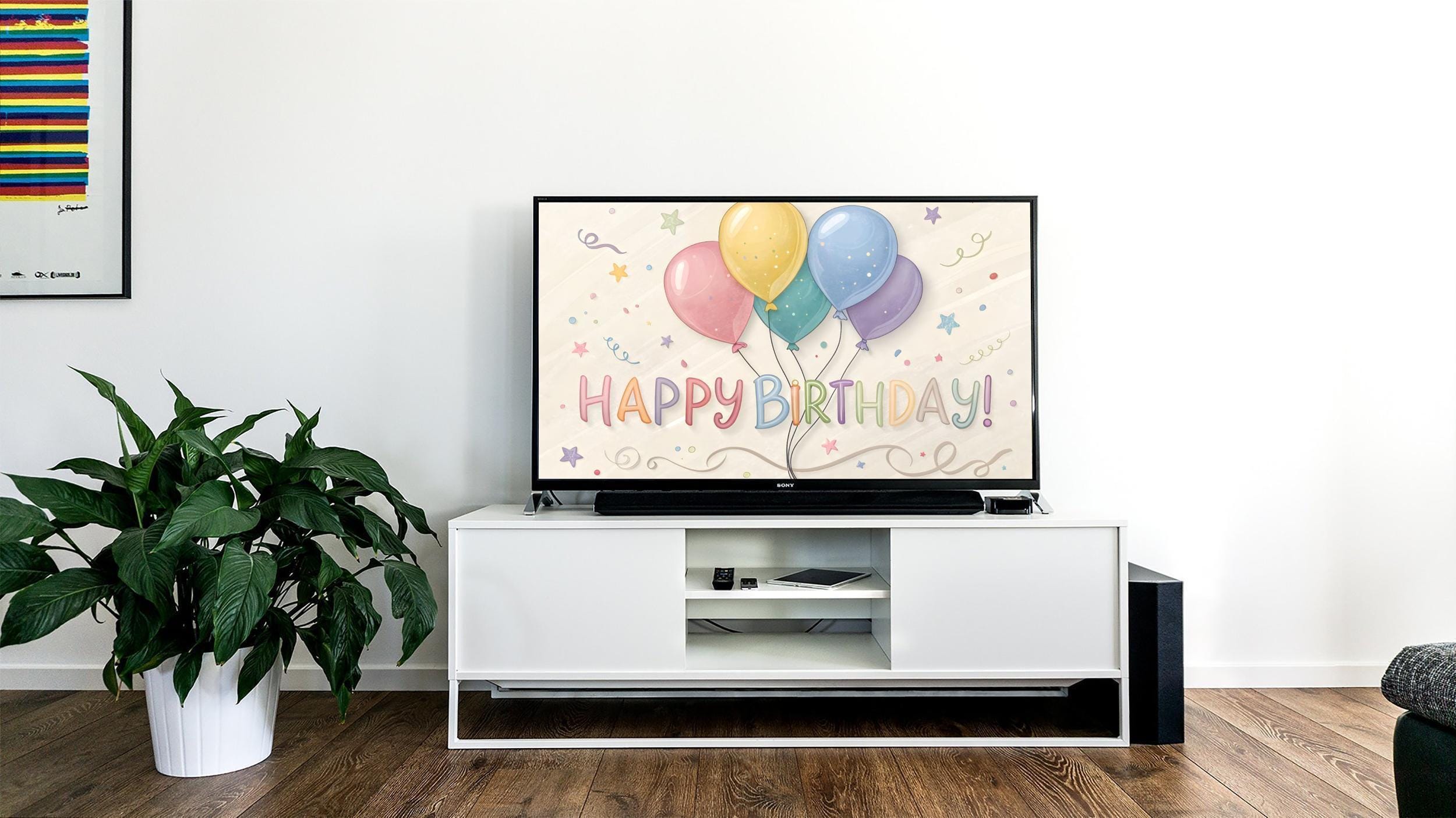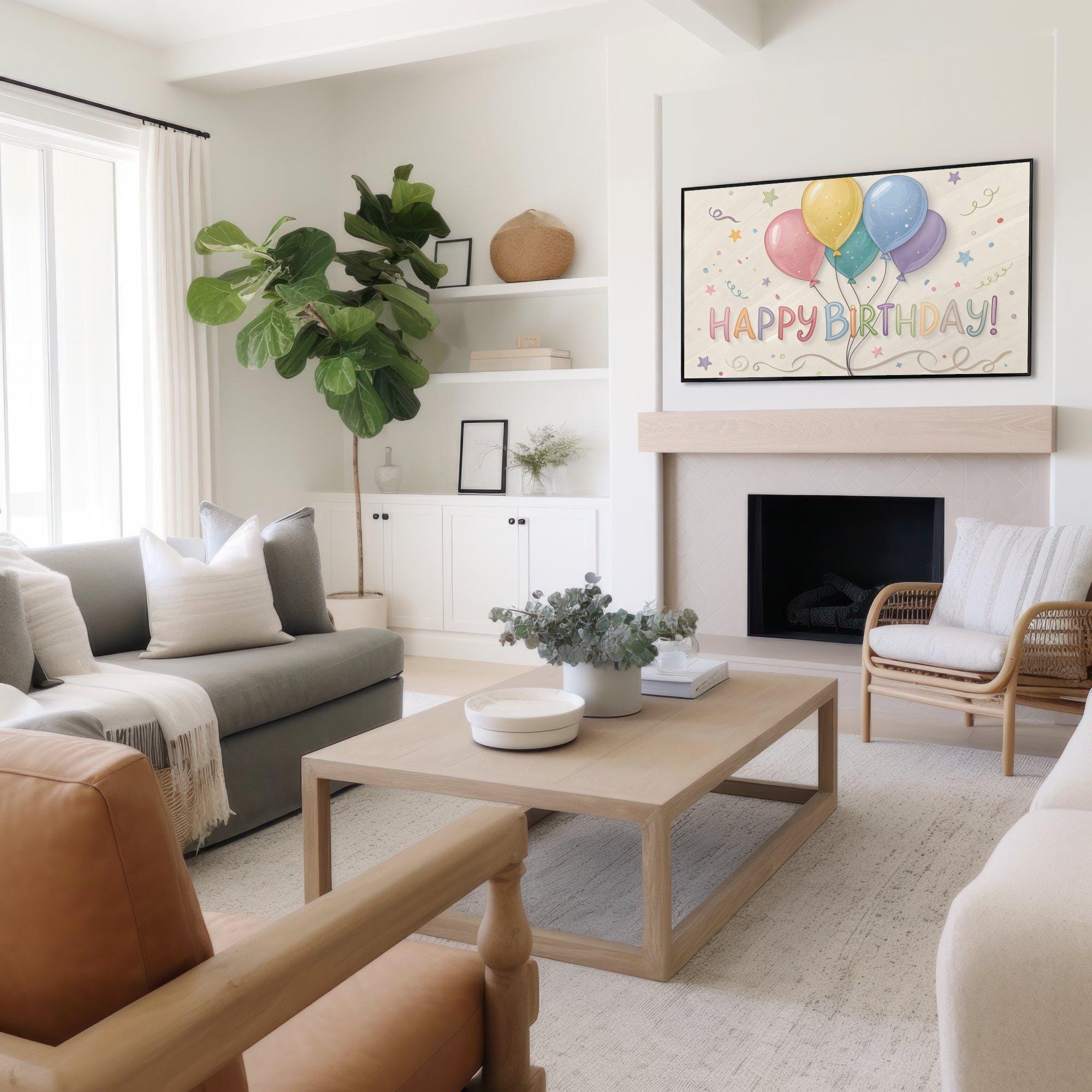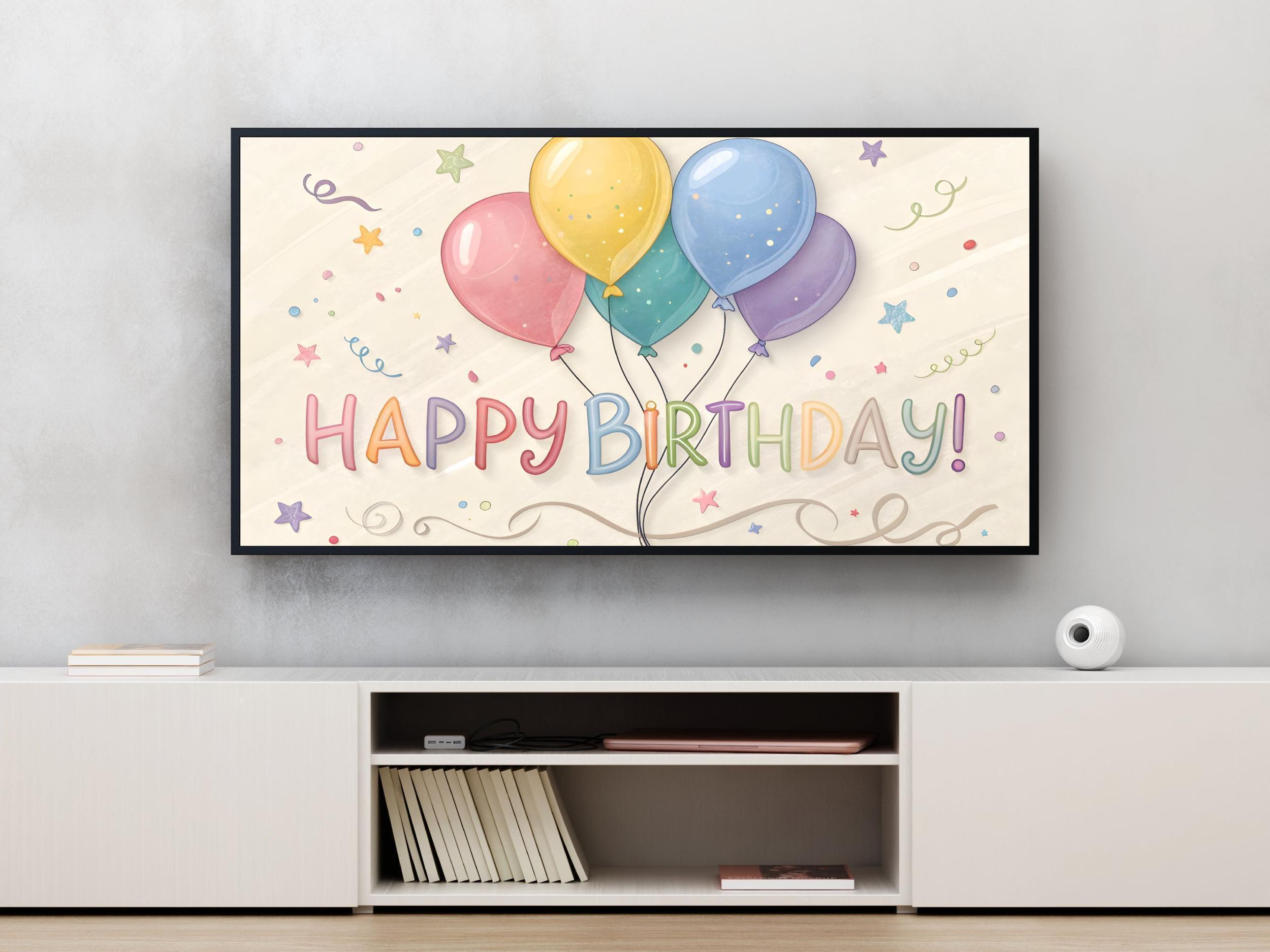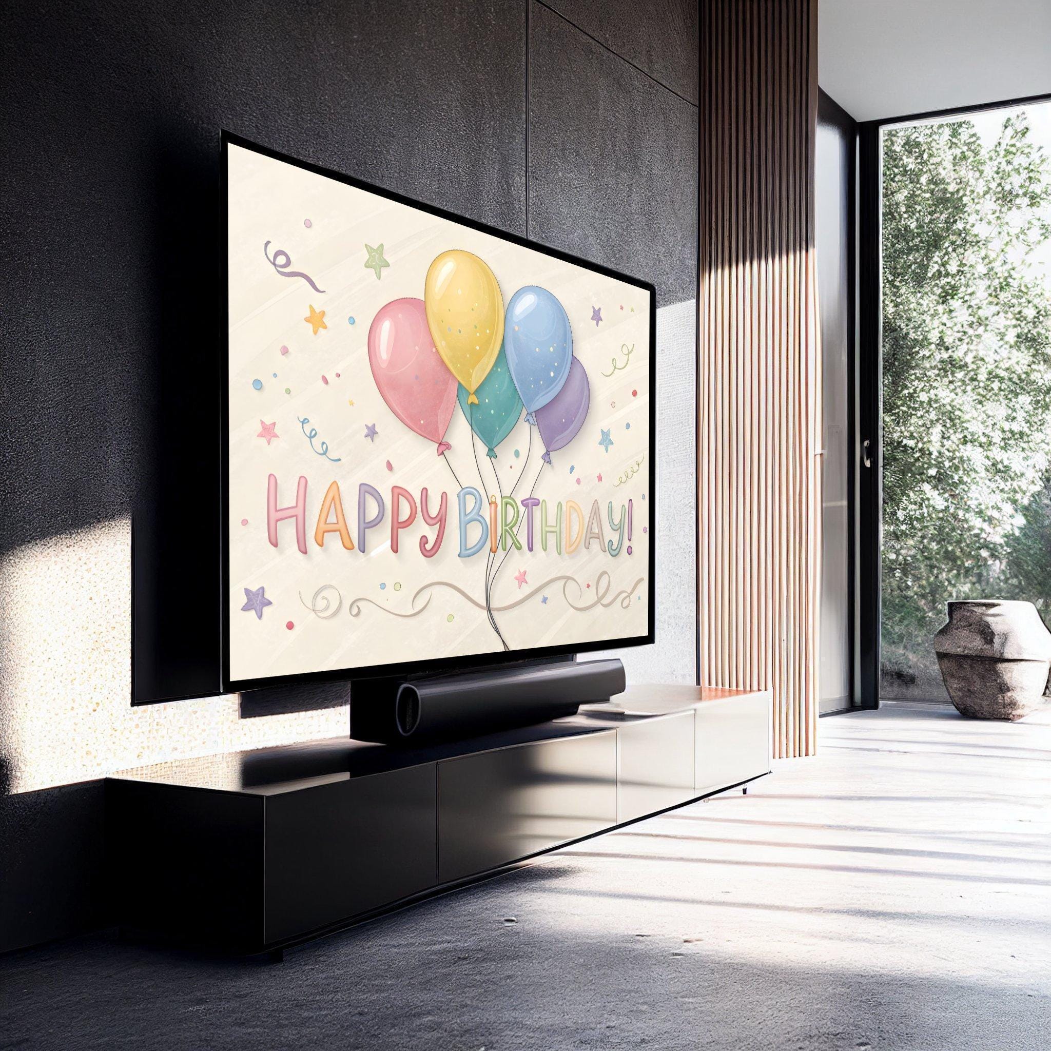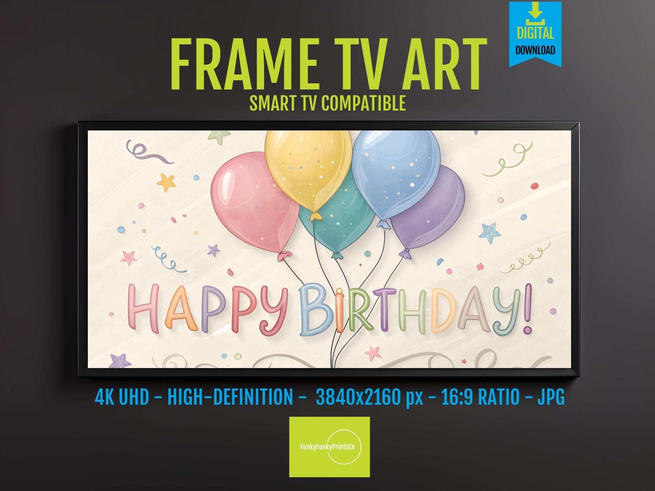 Celebrate in style with this vibrant digital download art featuring festive balloons and star confetti design that instantly brightens any space. Designed specifically for Samsung Frame TV, this 4k UHD screensaver brings a whimsical style art touch to your home decor, making every birthday feel extra special. The lively colors and playful details create an inviting atmosphere perfect for joyful celebrations.