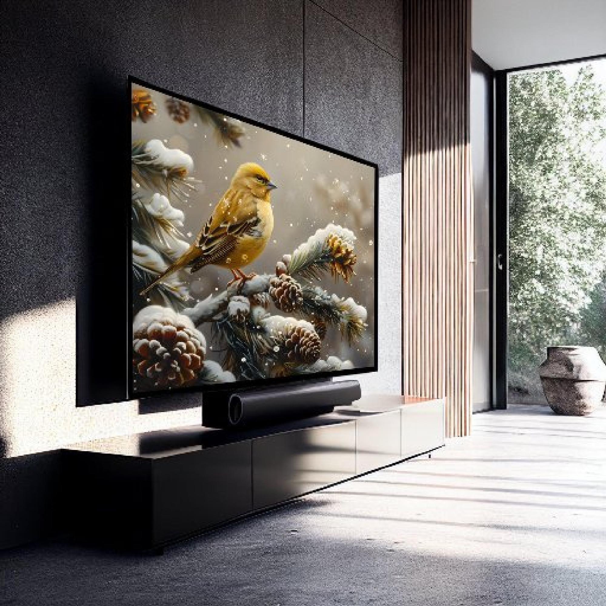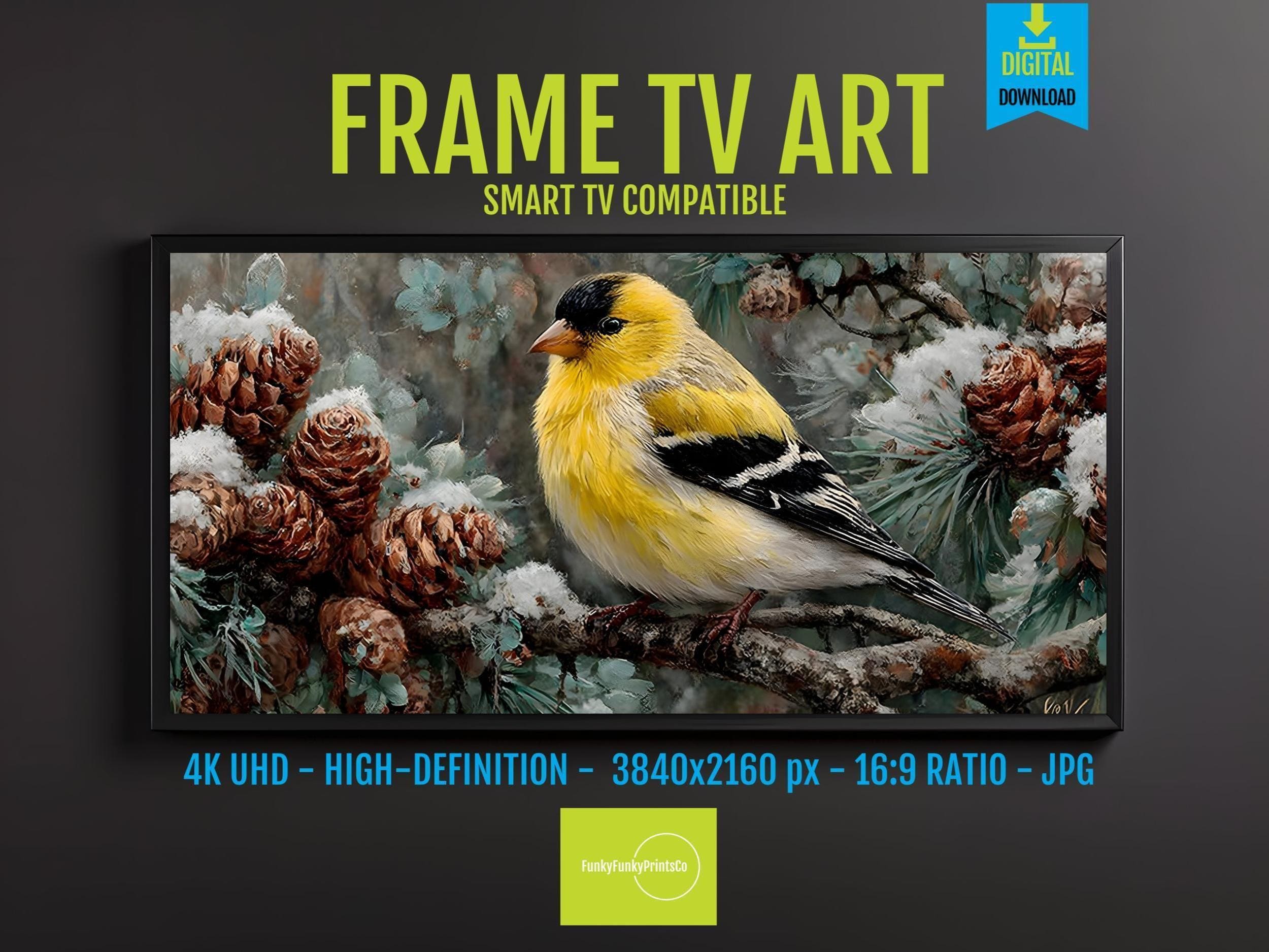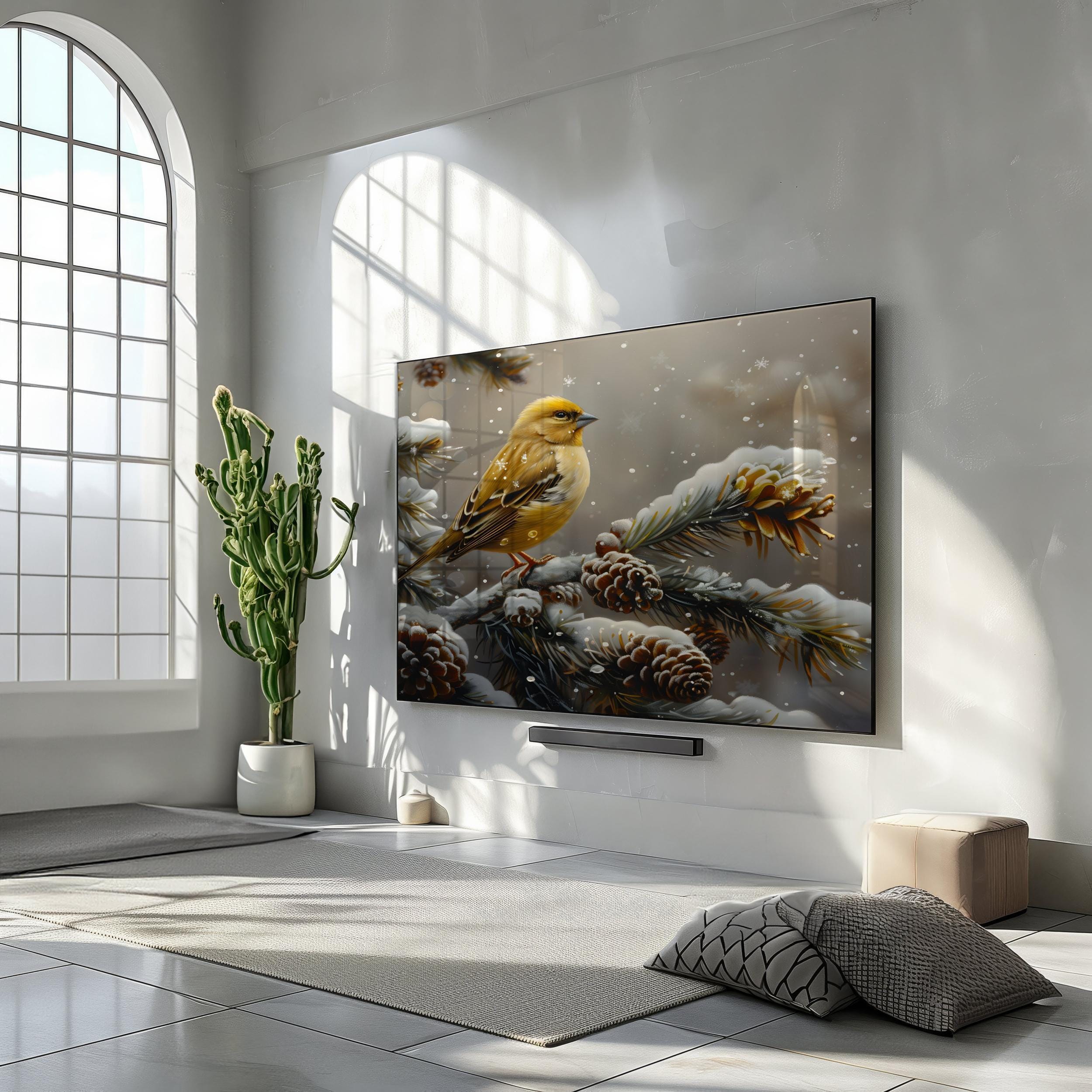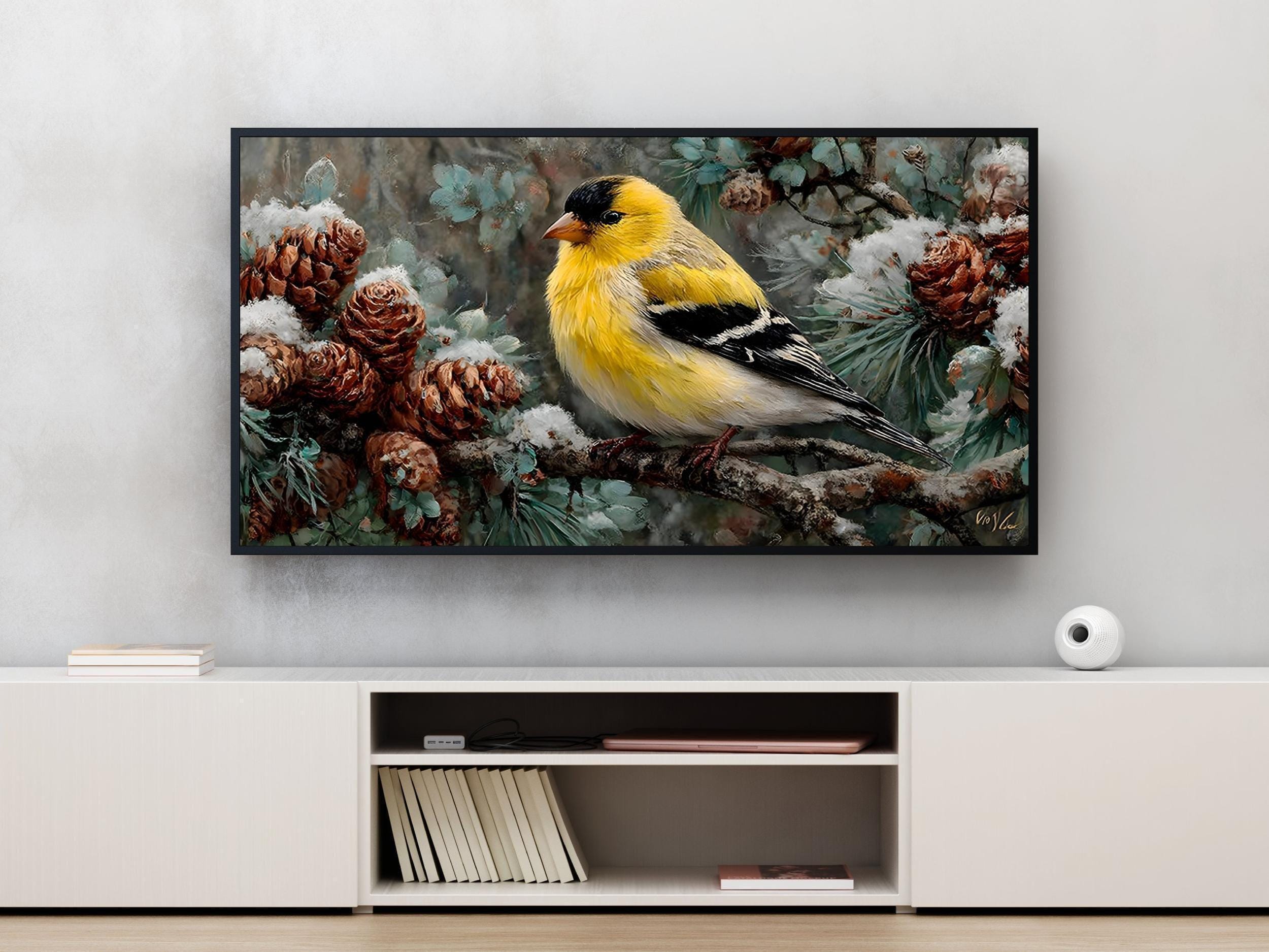 Step into a tranquil winter scene where a vibrant goldfinch perches delicately on a frosted pine branch, surrounded by snow-dusted needles and pine cone details. This serene landscape art captures the quiet beauty of a frosted pine branch in midwinter, blending wildlife art decor with cozy winter wall art to bring nature's calm indoors. Designed as a digital download art piece, it offers instant access to a soothing animal scene perfect for enhancing your screen or living space.
