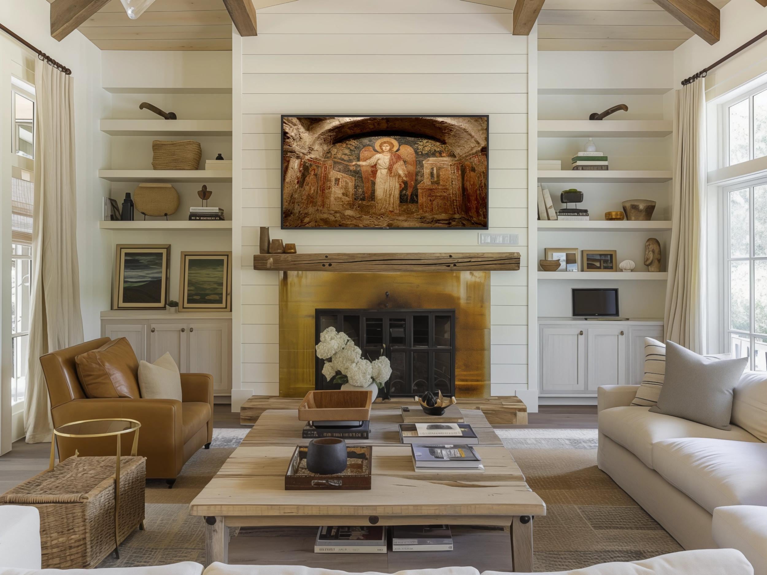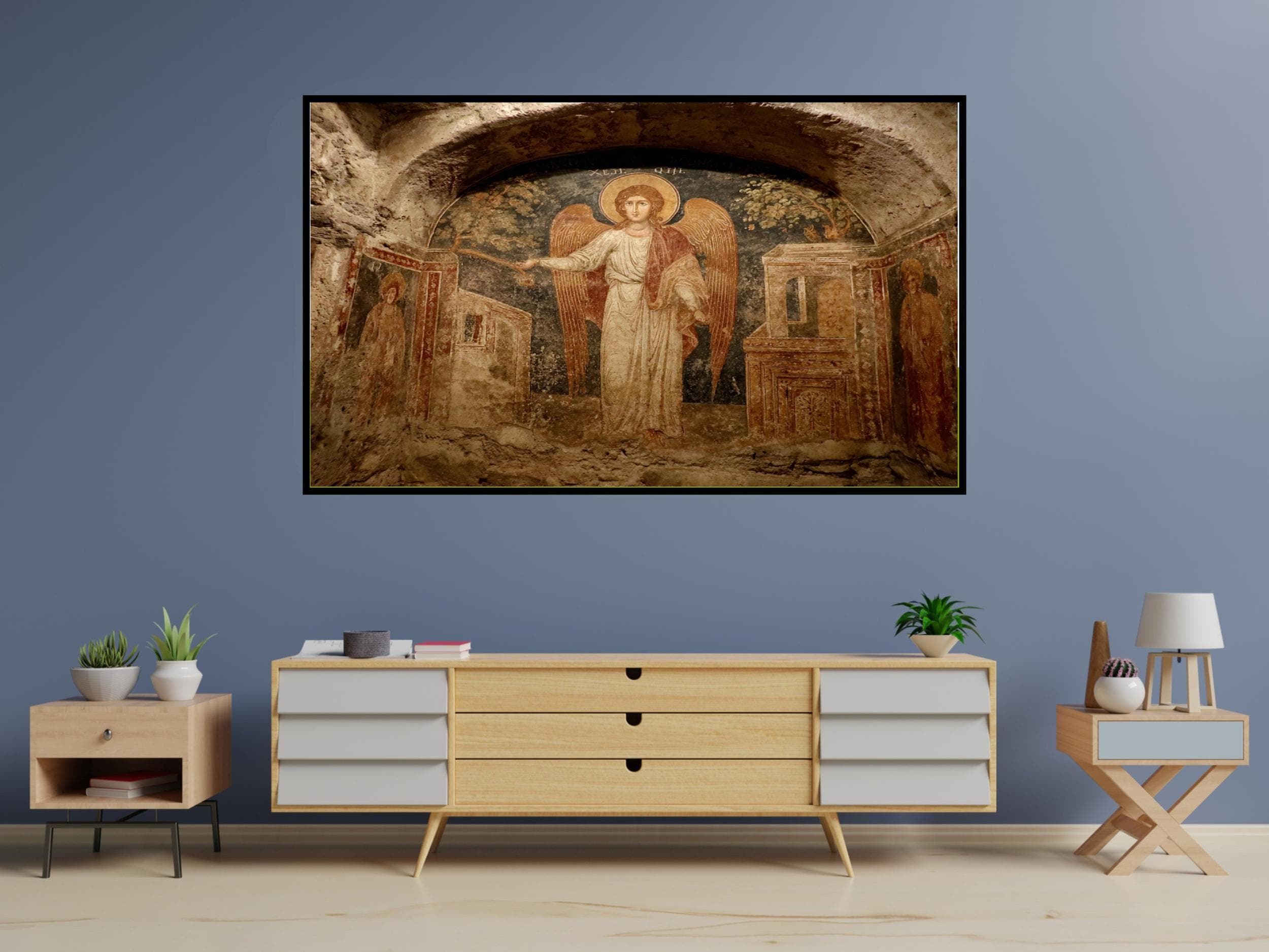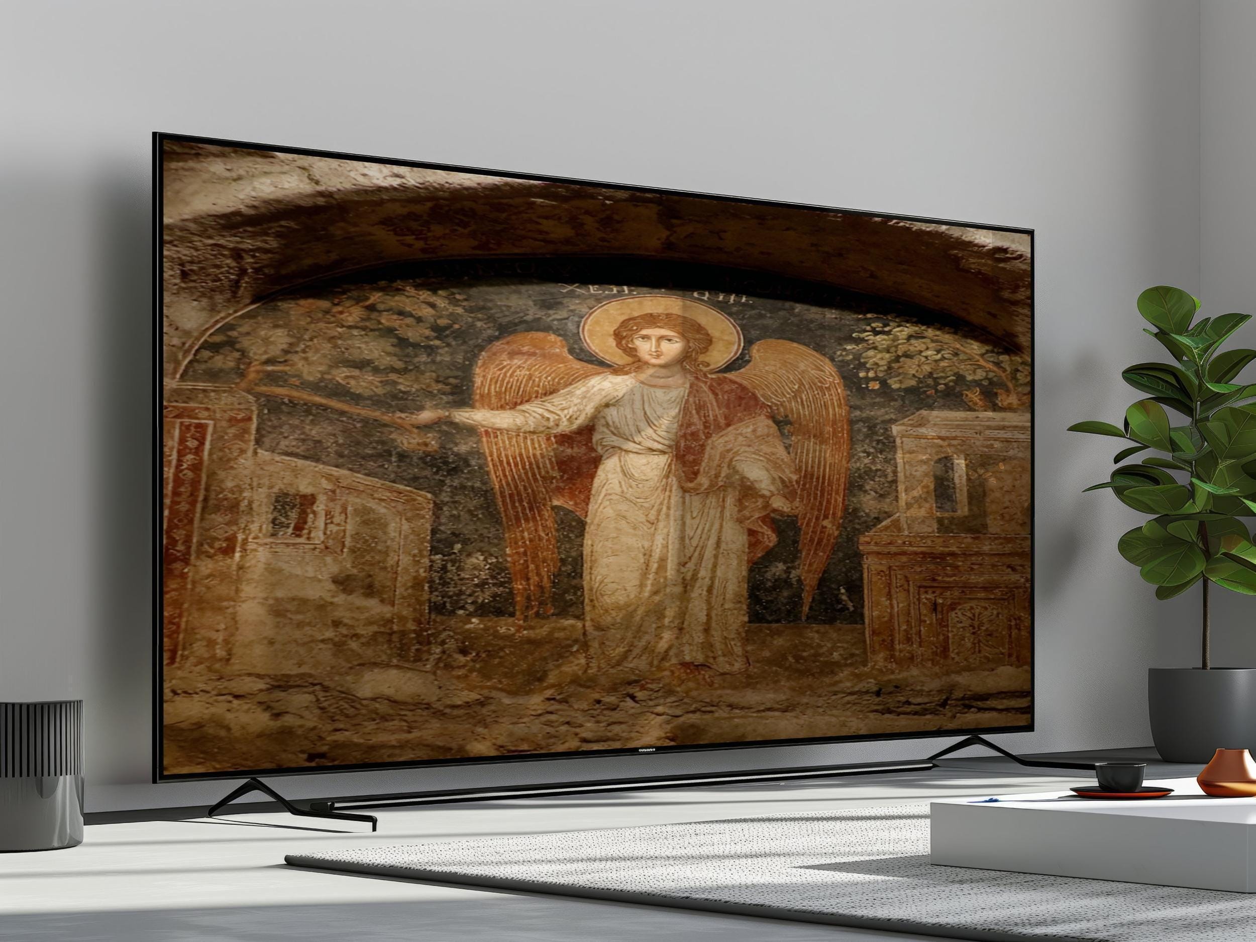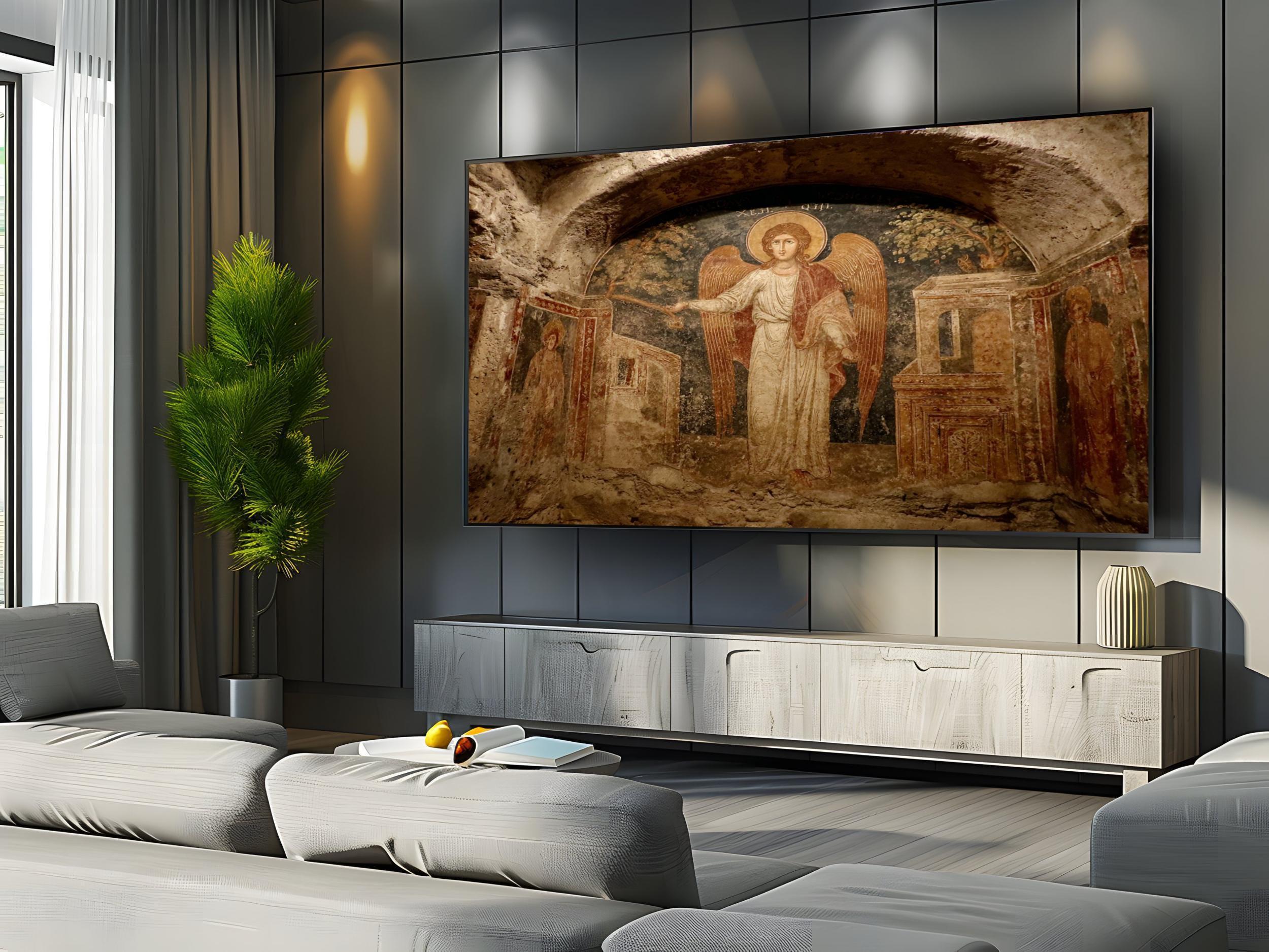 Add timeless beauty and sacred symbolism to your space with this Catacomb Angelic Fresco Art. Inspired by ancient religious frescoes, this piece combines historic texture with modern clarity — crafted for 4K UHD Samsung Frame TVs to showcase its divine details in perfect light.