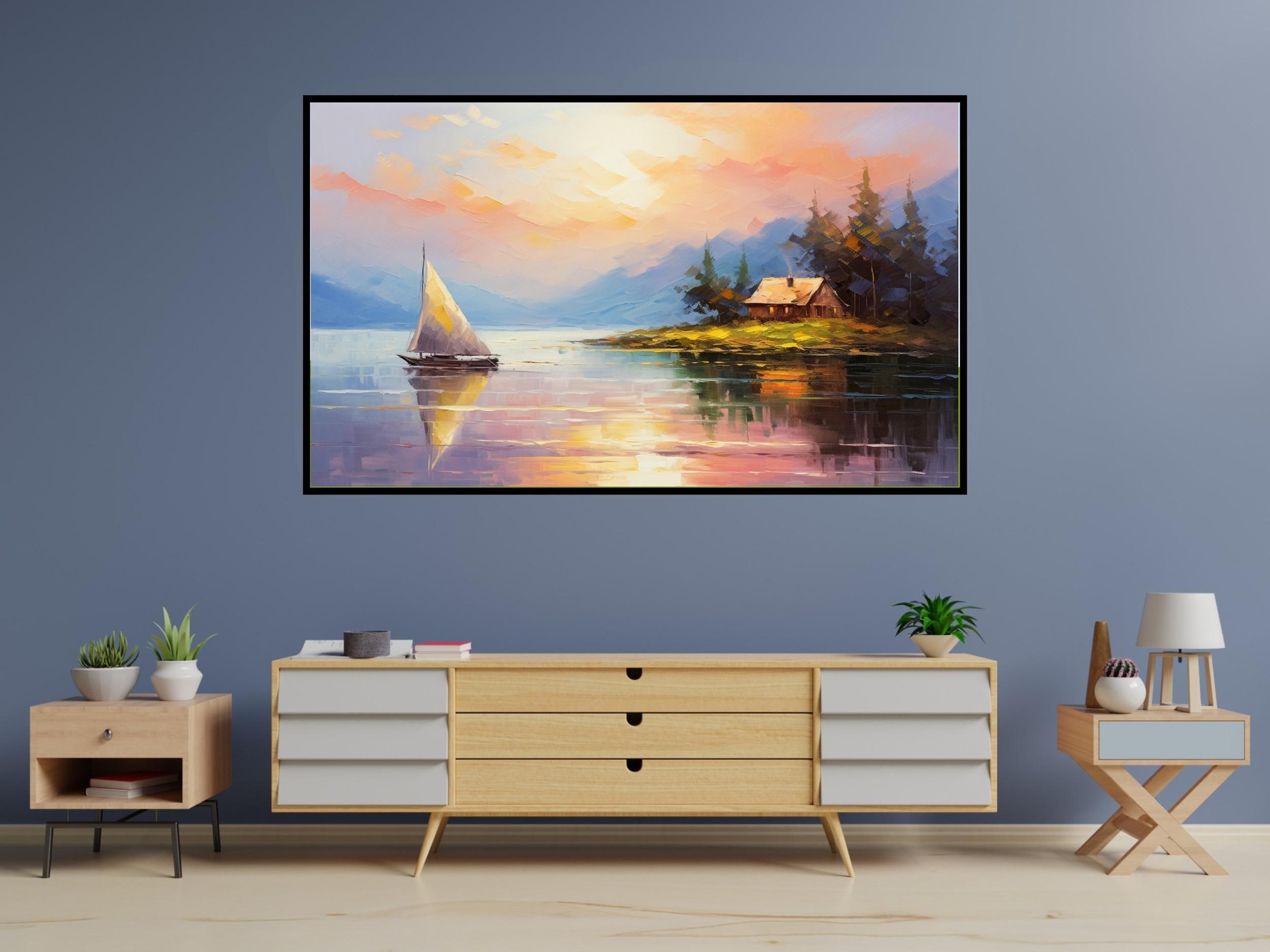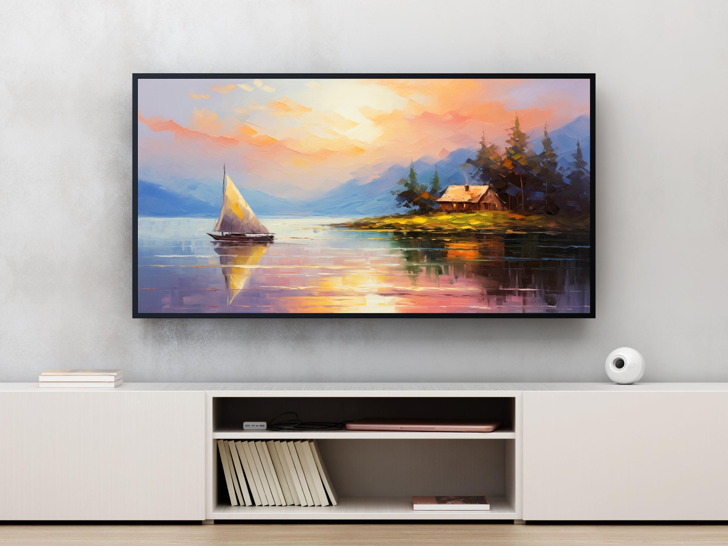 Immerse yourself in the tranquil beauty of this serene lake cabin scene, where pastel sunrise hues gently kiss the water and a sailboat glides softly across the tranquil water scene. This dreamy cabin art captures a peaceful moment bathed in mountain mist, perfect for adding calm and charm to your home office decor or living room wall. Designed as a 4K UHD screensaver for Samsung Frame TV, it transforms your space with restorative mood art that invites relaxation and reflection.
