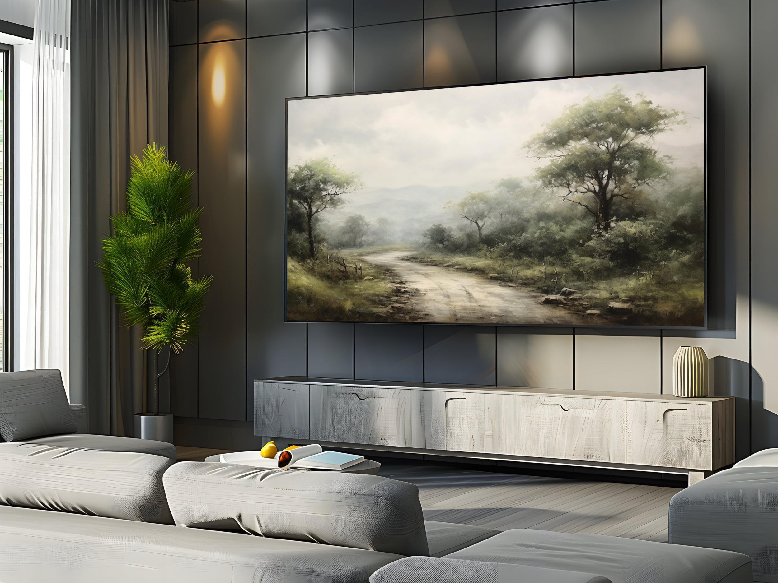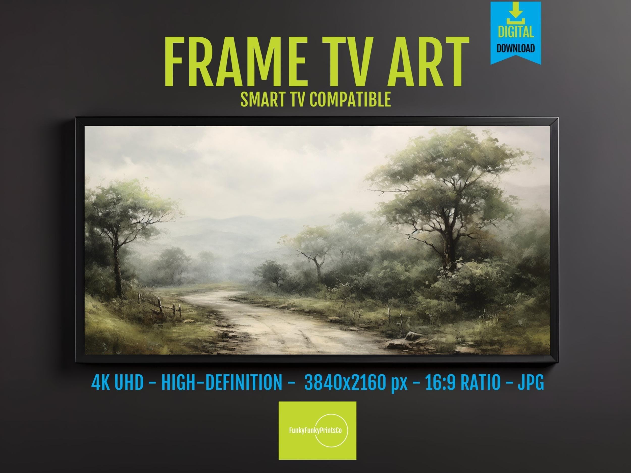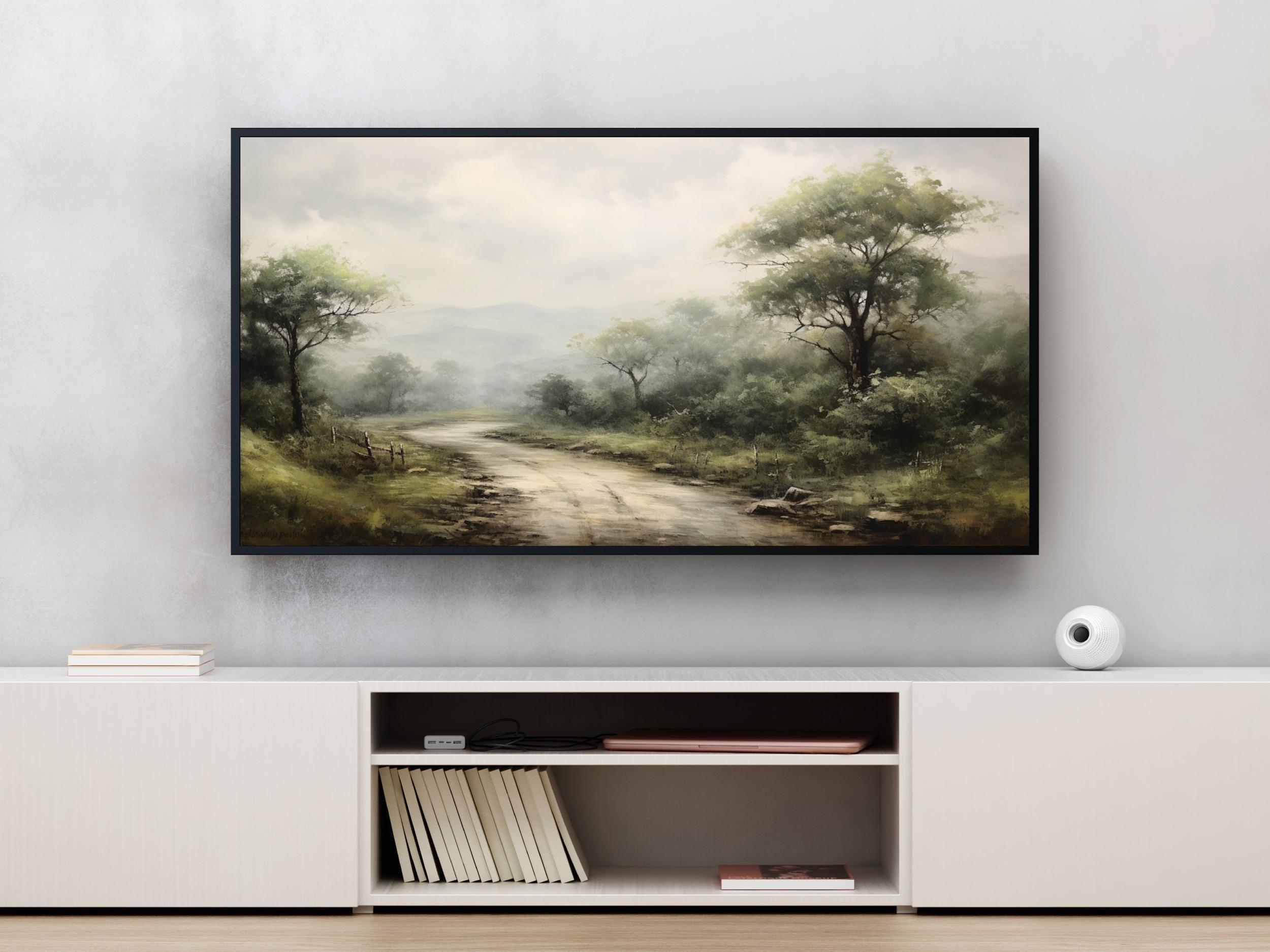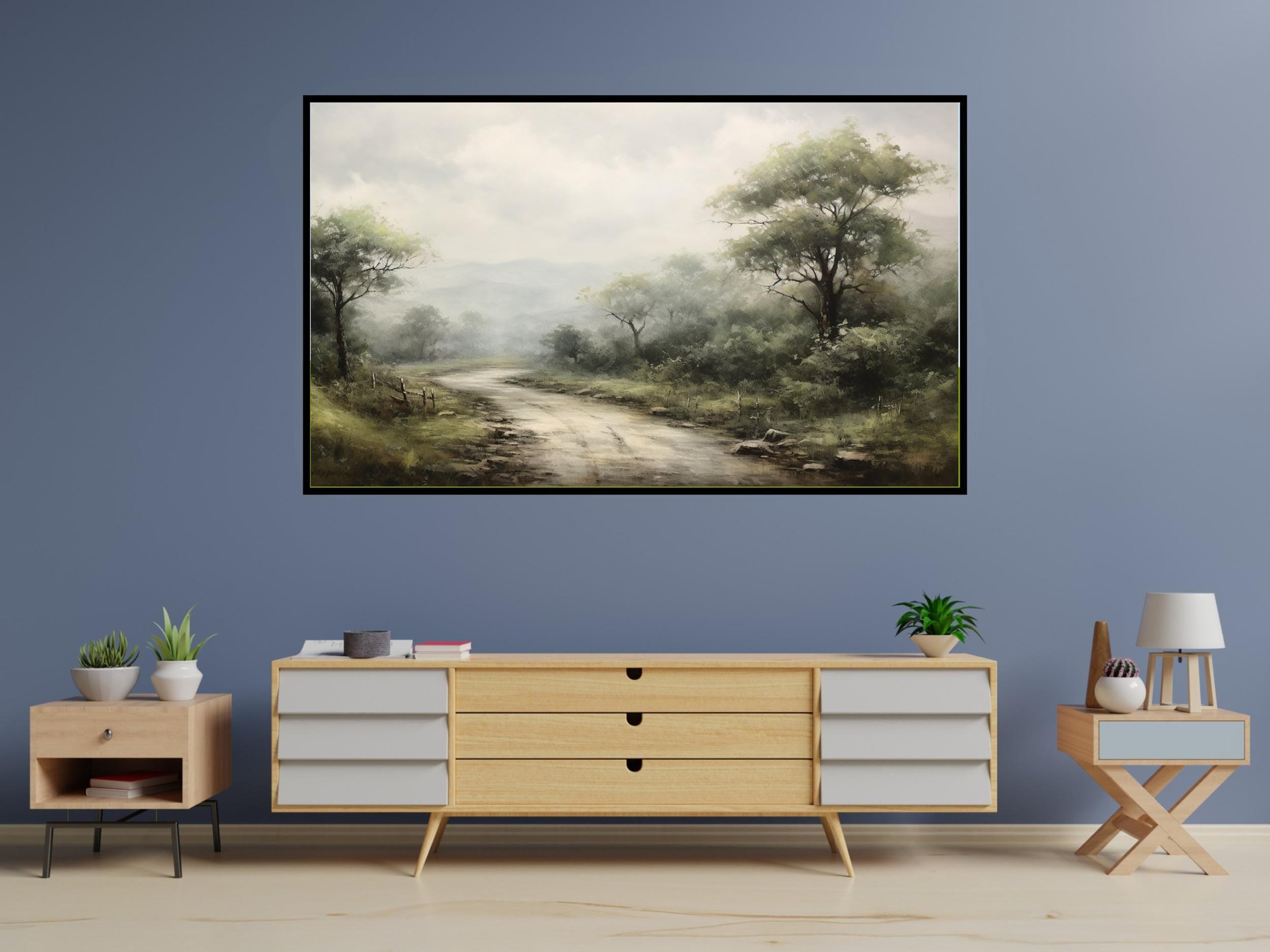 Step into a tranquil world where a serene winding road meanders through lush greenery, enveloped by a misty background that soothes the soul. This calming nature scene captures soft lighting and delicate brushwork detail, inviting you to pause and breathe in peaceful moments. Designed specifically as nature wall decor for Samsung Frame TV, it transforms your space effortlessly with a touch of serene beauty.